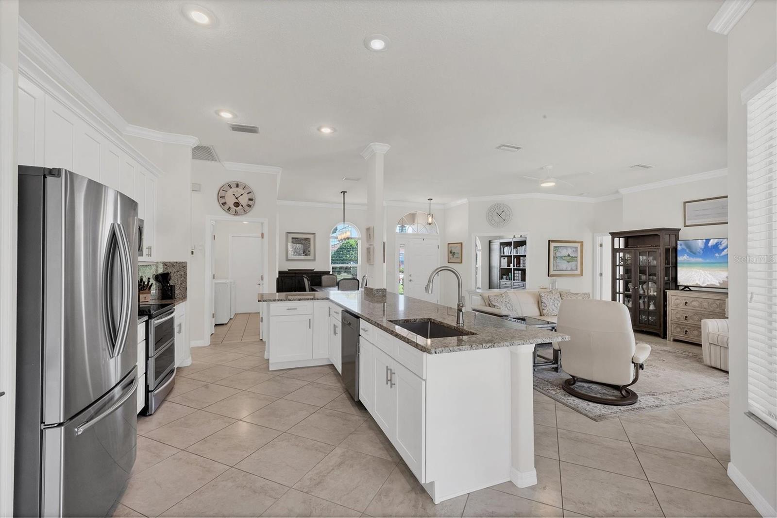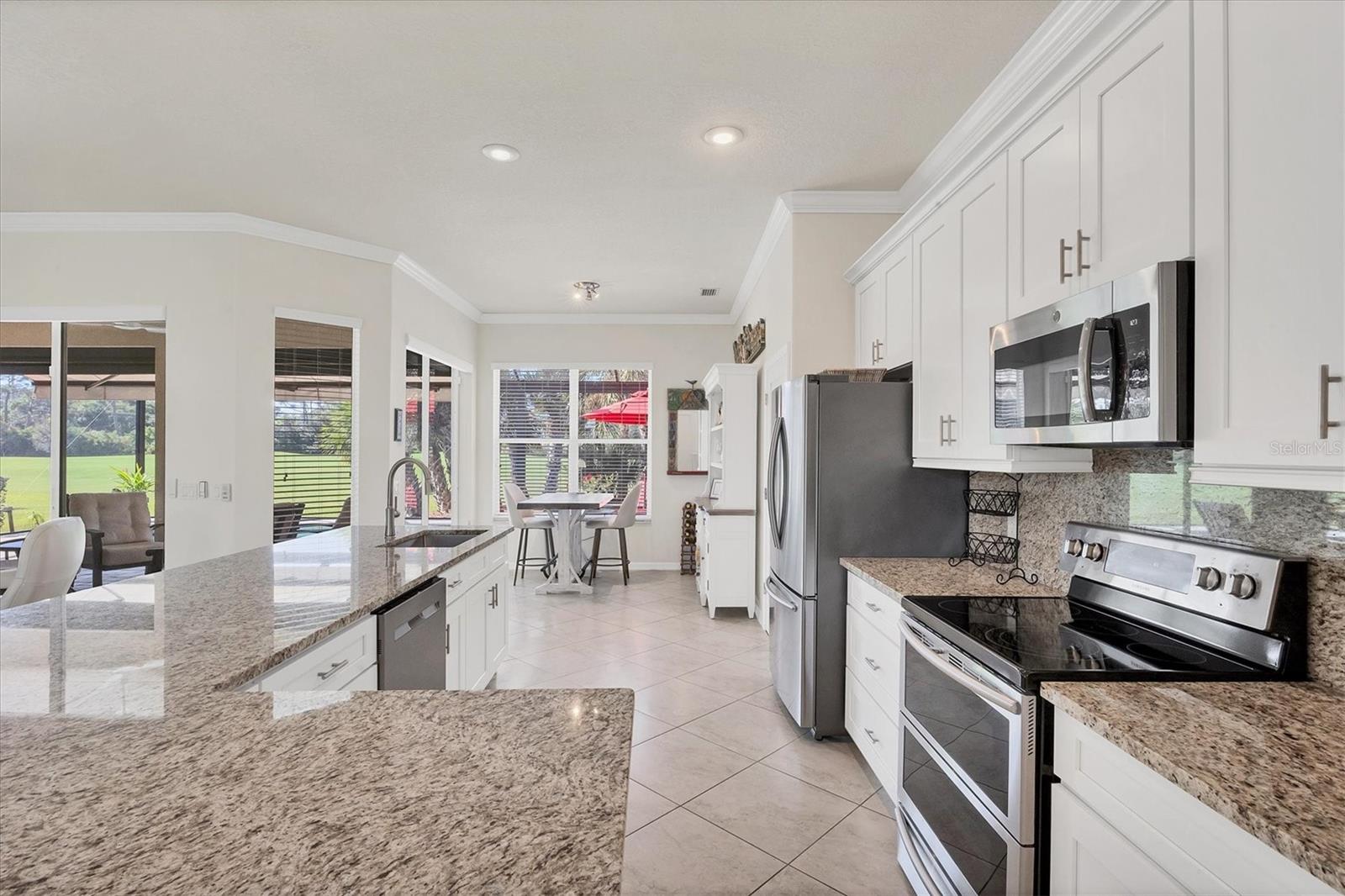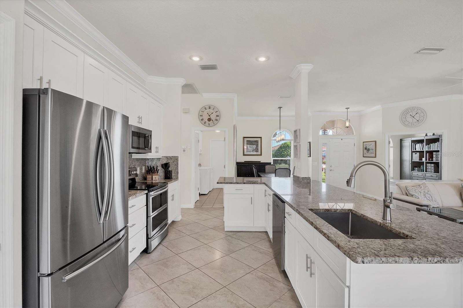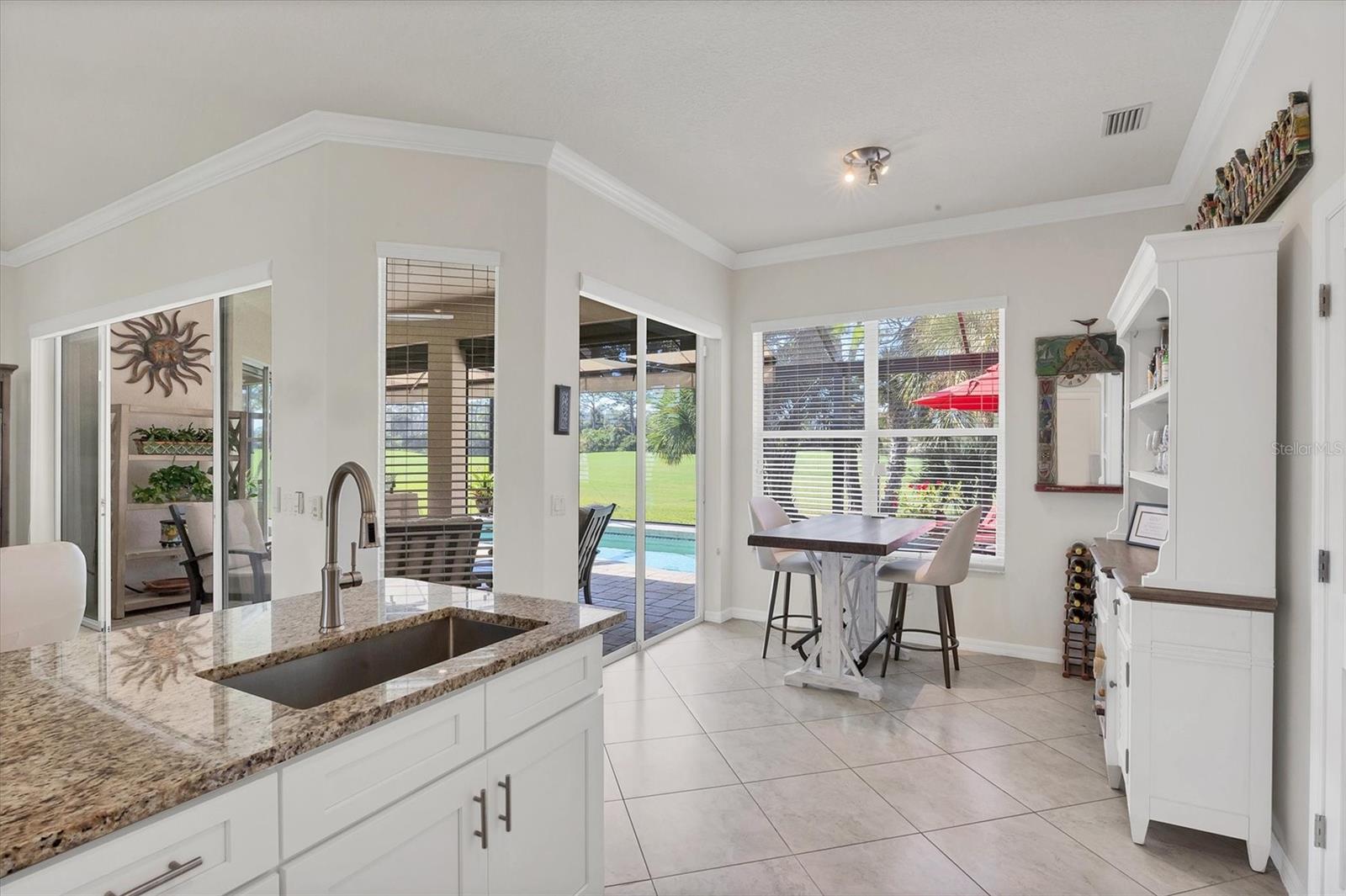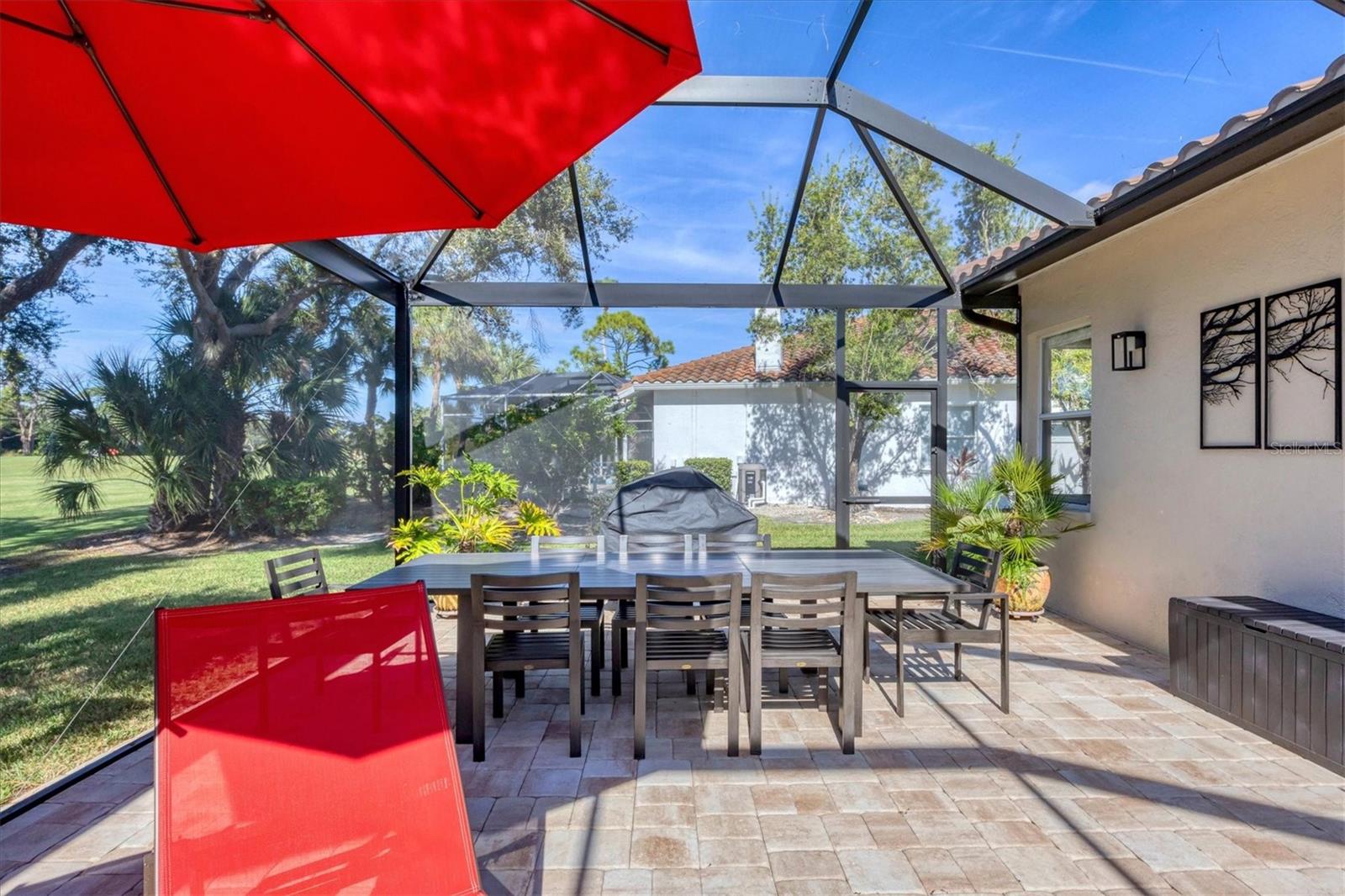 IMPRESSIVE 3 bedroom, 2 bath, with DEN and heated saltwater POOL home in sought after Stoneybrook Golf and Country Club! This one has it all.. nestled on the 12th hole with expansive views and updates galore! This is a true open floor plan with kitchen inclusive to the wide open living space adorned with crown molding, an extended eat on bar, granite counters, new soft close cabinetry, closet pantry with pull out shelves, a dinette with large windows, formal dining space and multiple glass sliding doors out to lanai/pool area. Loads of natural light! The premier outside entertaining area has been extended with NEW pavers and storm rated panoramic screens and lanai cage, as well as an electric awning to add shade.. your prime view is jaw dropping of the pristine greens and sunset views! Primary suite enjoys updated ensuite bath with spa like soaking tub, granite counters with dual sinks, and tiled walk-in shower.. 2nd full bath has been updated with a raised stone vanity and tiled shower.. A desirable den has double french doors for privacy and a murphy bed for more guests. Laundry room has an added utility sink, an additional pantry with pull out shelves and lots of cabinet space. 2 car garage has an updated epoxy floor and plenty of room for 2 cars and all your golf and beach gear! Driveway and entryway have been professionally landscaped and are pavered as well. More updates include recessed lighting, new remote controlled fans, new blinds/shades, electric hurricane screen, AC 2021, water heater 2024, garage door 2020, pool pump 2025, well pump for irrigation 2025, TILE ROOF 2022!Stoneybrook is a gated and well established club in Palmer Ranch and boasts top amenities that include a new 18 hole golf course redesigned by Kipp Schultes and is said to be one of the best on the West Coast! Lighted Har-Tru tennis/pickleball courts, pro-shop, well-equipped fitness center, bocce court, putting greens, driving range, fitness studio, sharing library, additional heated pool/spa, full service restaurant/bar, meeting rooms, catering facility, outdoor dining patio, walking/biking trails, fishing, planned activities like yoga, mahjong, line dancing, and so much more! Stoneybrook Golf and Country Club is a prime location close to the Legacy Trail, shopping, Costco, restaurants and all Sarasota and Venice has to offer! WELCOME HOME to RESORT-STYLE LIVING at its BEST!