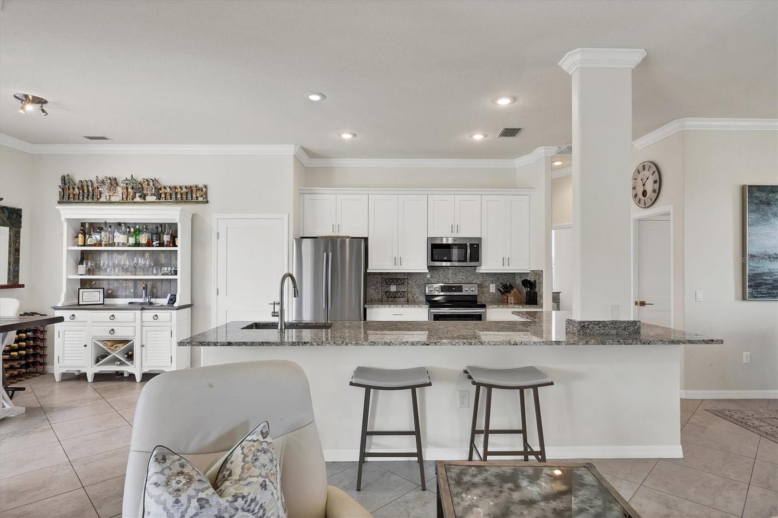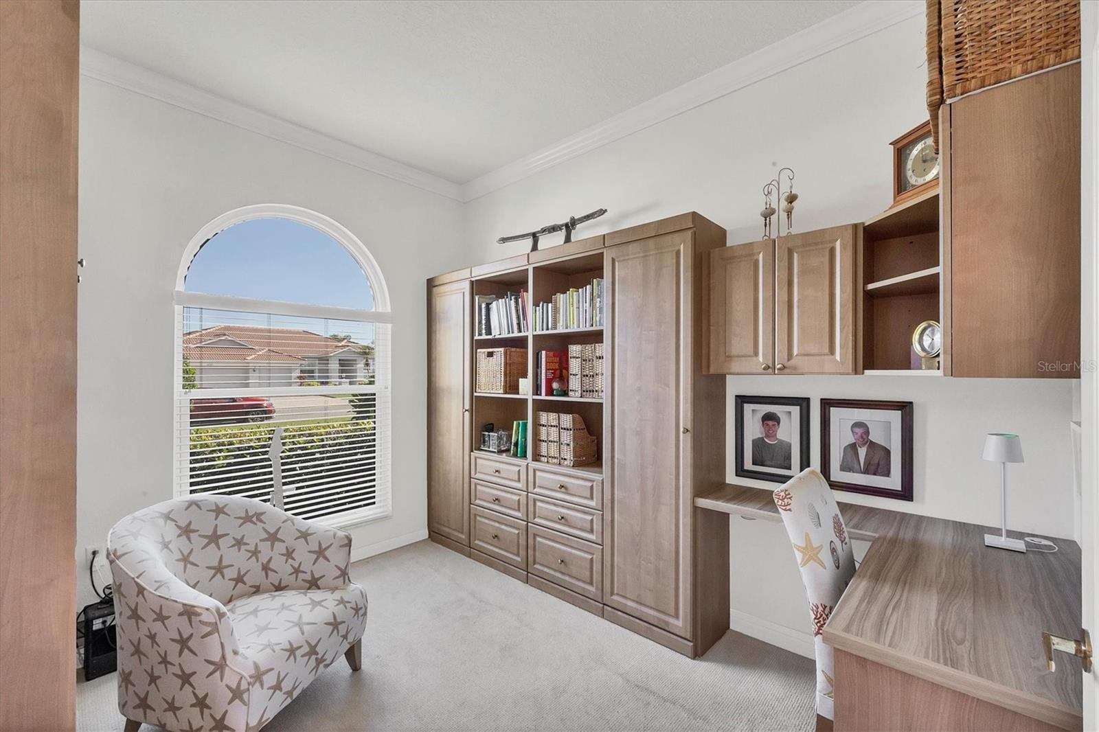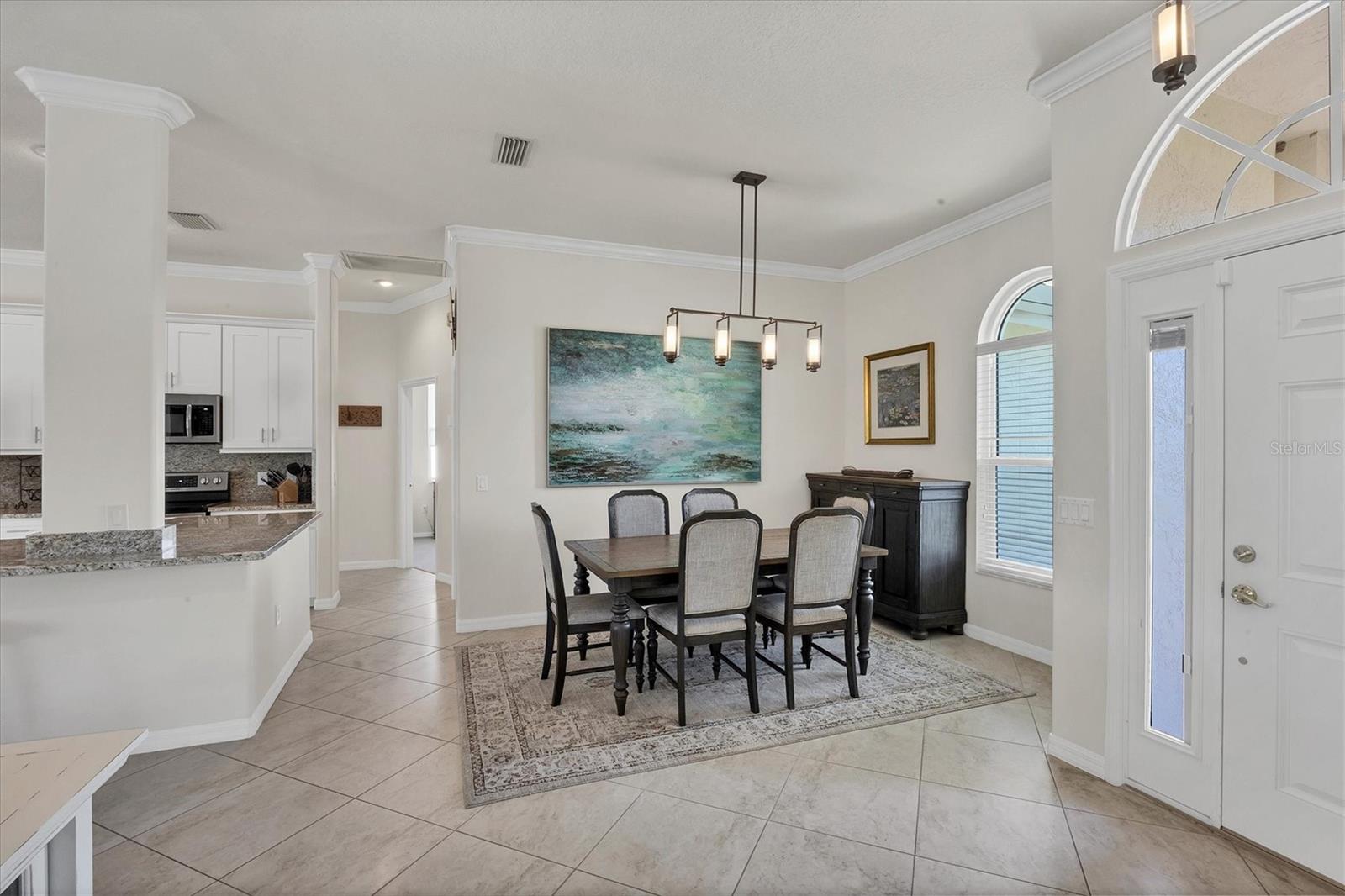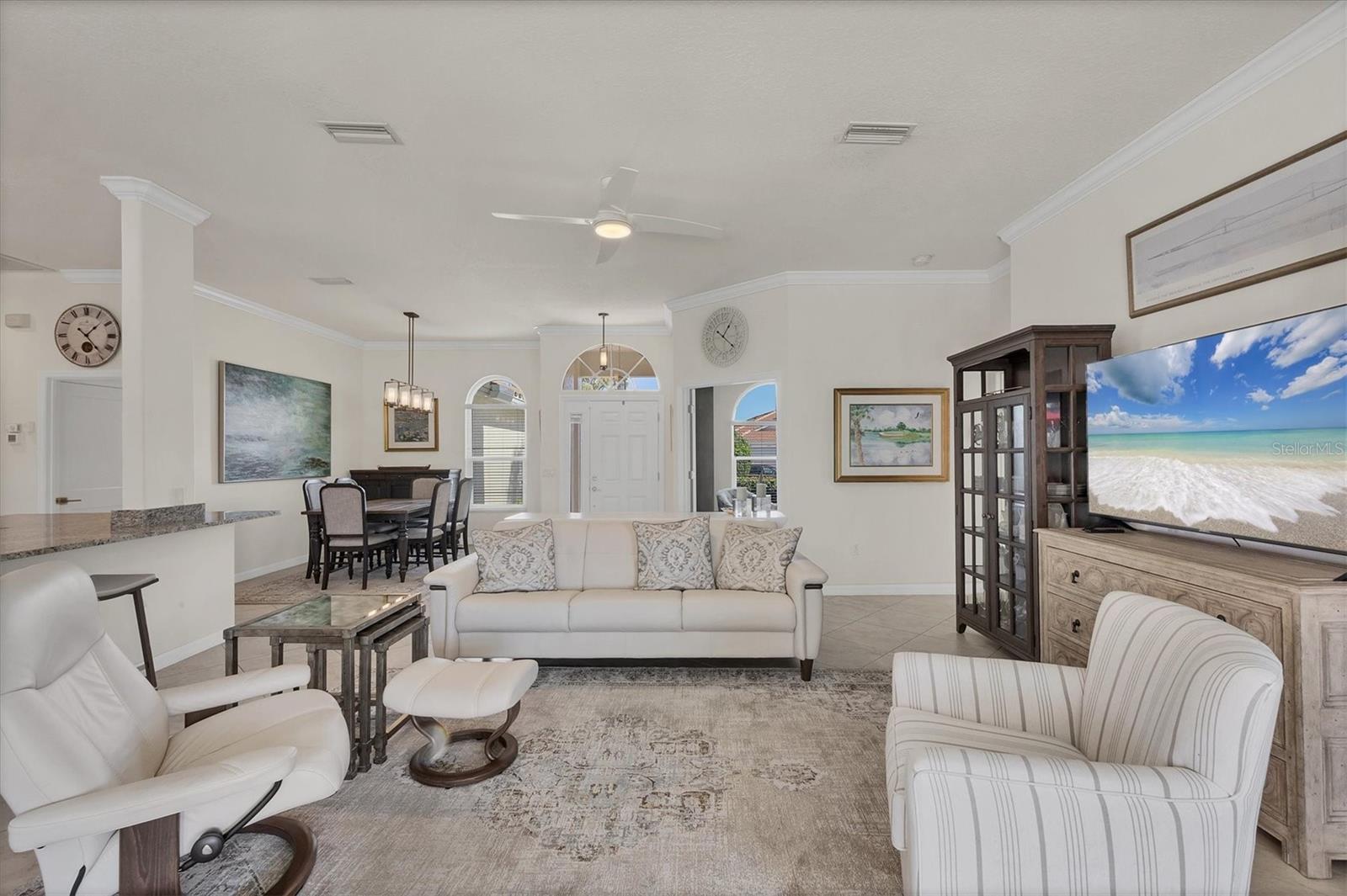 IMPRESSIVE 3 bedroom, 2 bath, with DEN and heated saltwater POOL home in sought after Stoneybrook Golf and Country Club! This one has it all.. nestled on the 12th hole with expansive views and updates galore! This is a true open floor plan with kitchen inclusive to the wide open living space adorned with crown molding, an extended eat on bar, granite counters, new soft close cabinetry, closet pantry with pull out shelves, a dinette with large windows, formal dining space and multiple glass sliding doors out to lanai/pool area. Loads of natural light! The premier outside entertaining area has been extended with NEW pavers and storm rated panoramic screens and lanai cage, as well as an electric awning to add shade.. your prime view is jaw dropping of the pristine greens and sunset views! Primary suite enjoys updated ensuite bath with spa like soaking tub, granite counters with dual sinks, and tiled walk-in shower.. 2nd full bath has been updated with a raised stone vanity and tiled shower.. A desirable den has double french doors for privacy and a murphy bed for more guests. Laundry room has an added utility sink, an additional pantry with pull out shelves and lots of cabinet space. 2 car garage has an updated epoxy floor and plenty of room for 2 cars and all your golf and beach gear! Driveway and entryway have been professionally landscaped and are pavered as well. More updates include recessed lighting, new remote controlled fans, new blinds/shades, electric hurricane screen, AC 2021, water heater 2024, garage door 2020, pool pump 2025, well pump for irrigation 2025, TILE ROOF 2022!Stoneybrook is a gated and well established club in Palmer Ranch and boasts top amenities that include a new 18 hole golf course redesigned by Kipp Schultes and is said to be one of the best on the West Coast! Lighted Har-Tru tennis/pickleball courts, pro-shop, well-equipped fitness center, bocce court, putting greens, driving range, fitness studio, sharing library, additional heated pool/spa, full service restaurant/bar, meeting rooms, catering facility, outdoor dining patio, walking/biking trails, fishing, planned activities like yoga, mahjong, line dancing, and so much more! Stoneybrook Golf and Country Club is a prime location close to the Legacy Trail, shopping, Costco, restaurants and all Sarasota and Venice has to offer! WELCOME HOME to RESORT-STYLE LIVING at its BEST!