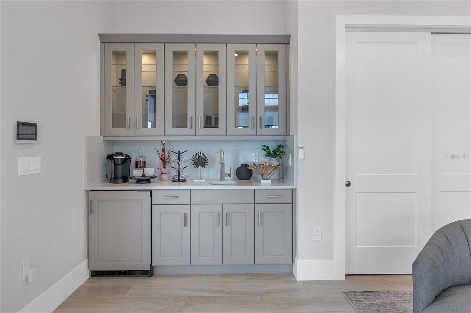 Exquisitely crafted and masterfully presented, 8477 Pavia offers a rare fusion of elevated design, refined comfort, and a former Chandler IV model home with meticulous attention to detail. A custom front door opens to an impressive foyer defined by soaring ceilings and a striking accent wall, setting the tone for the refined living spaces beyond. The living room exudes sophistication with its illuminated architectural ceilings, a media alcove with accent wall, and elegant wood-look tile flooring. The chef's kitchen is both stylish and functional, featuring a massive central island with hidden storage, high-end stainless steel appliances, abundant white cabinetry, a dry bar with glass uppers and beverage cooler, and a sleek white tile backsplash. An open dining area, lighted ceilings, pocketing sliders, and a walk-in pantry enhance both everyday living and entertaining. A dedicated office offers the perfect work-from-home environment with high ceilings, walls of windows, floating shelves, a built-in workstation, and glass-paneled doors. The bonus room provides exceptional versatility--ideal as a fitness area, family room, or second office--with zero-corner sliders, large windows, and an en-suite full pool bath. Outside, the lanai becomes a true extension of the home, highlighted by a heated saltwater pool with sun shelf, a covered lounge area with gas fire pit, and a fully equipped outdoor kitchen with grill, sink, and vent hood. The primary suite is a private sanctuary with a dedicated alcove entry, two custom walk-in closets, double doors, a lighted tray ceiling, and a spa-like bath featuring dual vanities, a walk-in shower, freestanding tub, linen closet, and water closet. Two additional guest suites in the main home each offer an en-suite bath and walk-in closet. A separate guest casita adds even more flexibility with its own bedroom, sitting area, expansive windows, and full bath with tub/shower combination. Additional highlights include a well-appointed laundry room with ample cabinetry, sink, and Whirlpool appliances, as well as an oversized three-car garage with epoxy flooring and generous storage. Residents enjoy access to a premier amenity center with resort-style pools, a clubhouse, restaurant, state-of-the-art fitness center, tennis, pickleball and basketball courts, a dog park, and a playground. Ideally located minutes from UTC, Waterside Place, Lakewood Ranch, downtown Sarasota, Gulf beaches, Mote Aquarium, Benderson Park, and the Sarasota Polo Fields, this residence offers the perfect blend of elevated luxury and effortless Florida living.
