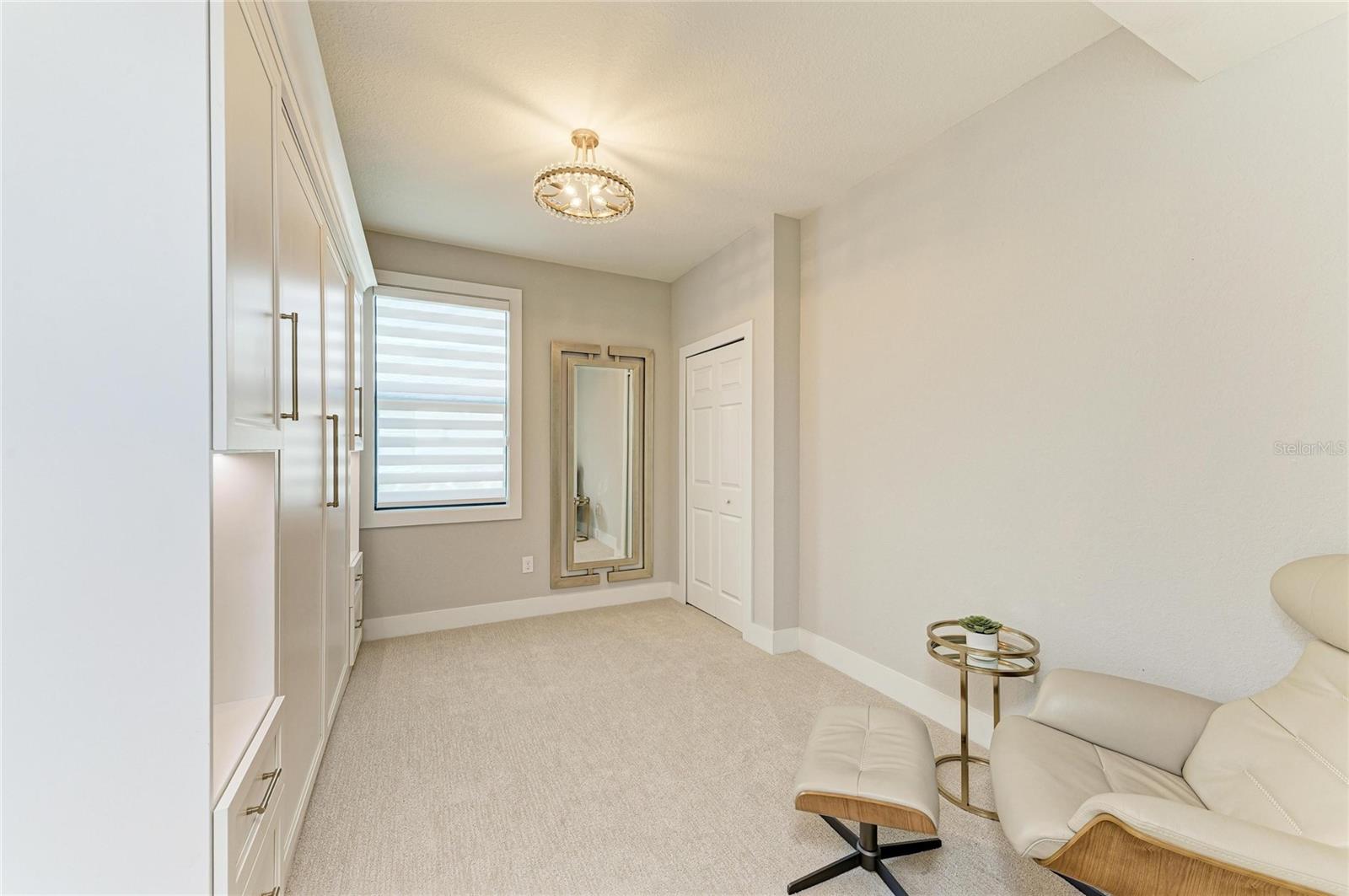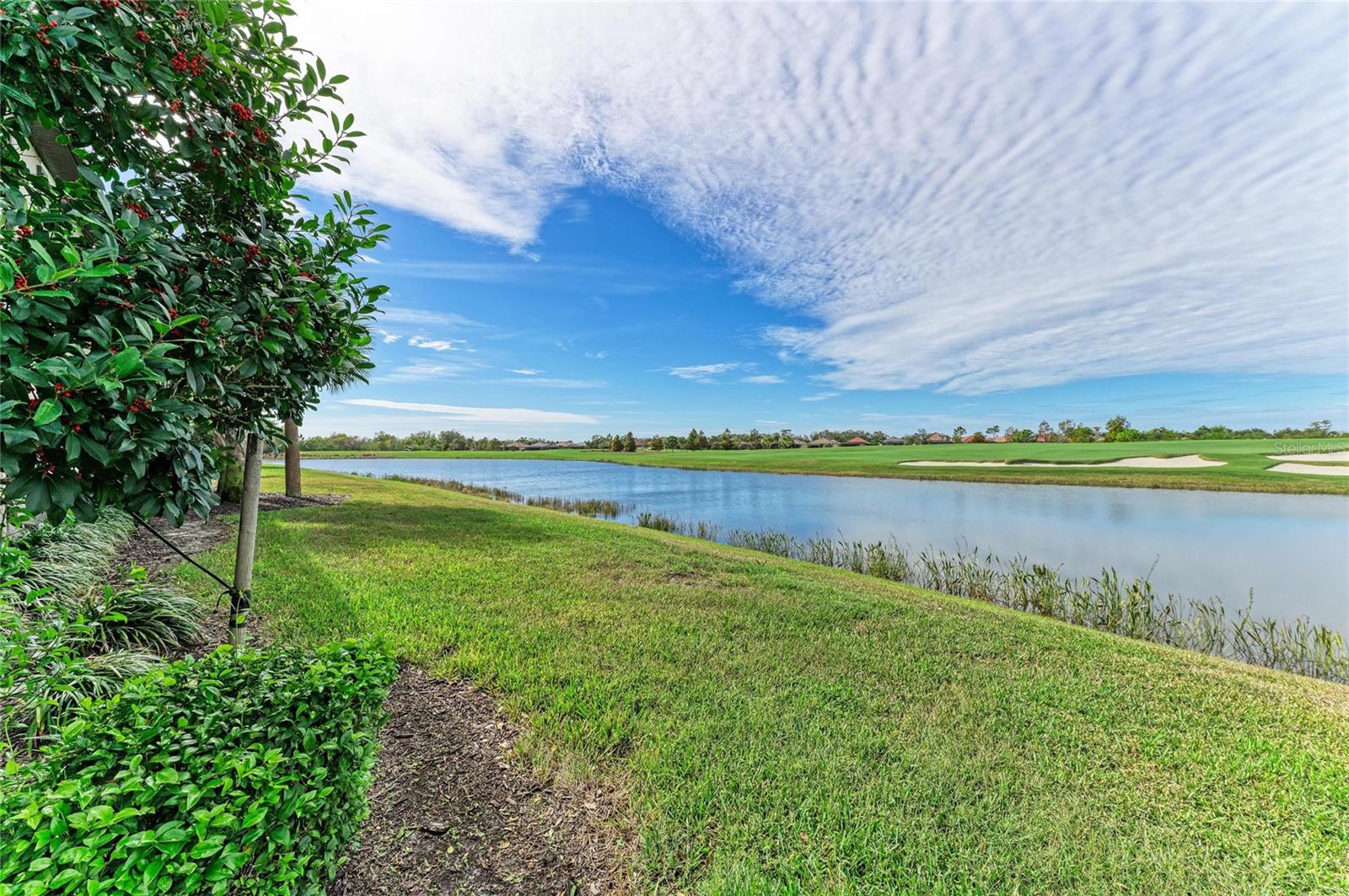 Welcome to 5916 Wake Forest Run #104, a first-floor residence in the gated, maintenance-free community of Lakewood National Golf Club in Lakewood Ranch. This impeccably designed home offers 1,786 square feet of sophisticated living space with three bedrooms, two full baths and a two-car garage. Crafted with precision and curated with high-end finishes, the residence surpasses model-home quality with its refined aesthetic and custom interior enhancements. The open-concept kitchen is a standout, featuring natural gas cooking, stainless steel appliances and quartz countertops with a waterfall-edge island. Custom-built pantry shelving, new cabinet hardware, and dramatic lighting create a culinary space that is functional and striking. The entry, dining and living areas showcase shiplap detailing, while the dining room includes a custom feature wall with built-in lighting, grass cloth wallpaper and integrated storage. The spacious primary bedroom accommodates a king-sized bed and includes dual closets, a Murphy bed that converts to a desk and custom shades. The en-suite bath offers a large step-in shower, coastal grass cloth wallpaper, upgraded vanity mirrors and new fixtures. Two additional bedrooms include custom closets and newer carpet, with one offering a built-in queen Murphy bed with cabinetry and additional storage. The guest bath is equipped with a bidet and a shower-over-tub configuration. Additional interior highlights include newer front-load washer and dryer, a folding counter with overhead storage, and consistent designer lighting and fixtures throughout. The garage features an upgraded epoxy floor, a Kinetico Premier water softener and a tankless water heater. The west-facing lanai is a showpiece, featuring a tongue-and-groove wood ceiling, dual ceiling fans, a custom-painted floor, and unobstructed views of the 18th hole on the Arnold Palmer-designed Commander Course. Enjoy sunsets, morning coffee, or a glass of wine while overlooking one of Florida's acclaimed golf courses. Recognized by Golf Advisor as Florida's top-ranked course and listed No. 1 in multiple national categories, the Commander Course elevates the home's lifestyle appeal for golf enthusiasts and investors alike. Enjoy maintenance-free living at Lakewood National Golf Club with extraordinary amenities that include a zero-entry heated pool with cascading waterfalls and lap lanes, poolside tiki bar and caf, fitness center with group exercise classes, an on-site full-service spa, eight lighted Har-Tru tennis courts, bocce, pickleball, several satellite pools, and a stunning 28,000-square-foot clubhouse which offers fine and casual dining, an expansive bar and lounge, men's and ladies lounges and locker rooms, conference and meeting space, a full-time lifestyle director who keeps residents' social life fun and active with trivia night, karaoke night, live concerts on the green, extravagant holiday parties, wine-tasting dinners and more. Lakewood National Golf Club hosts the annual Korn Ferry Tour's LECOM Suncoast Classic. Lakewood National offers a vibrant, amenity-rich lifestyle, making this residence ideal as a primary home, seasonal retreat or potential income-producing asset. Schedule your private showing today.