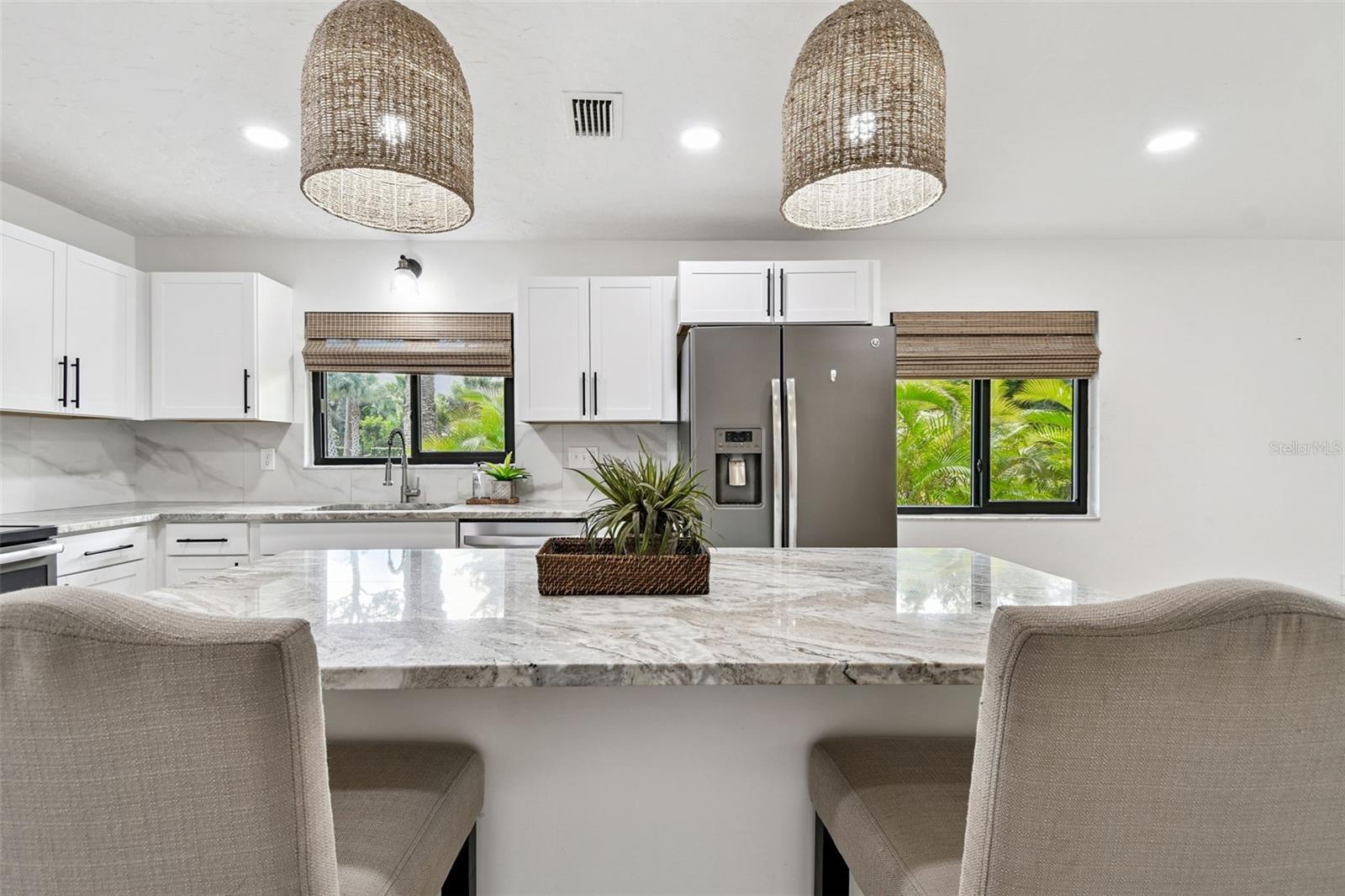 Rarely available! Remodeled Ground floor, single story end unit villa in Valencia Garden offering 1,477 sq.ft. with detached carport! Featuring 2 bedroom suites, a bright, open floor plan and recent kitchen and main living area remodel offering vinyl plank flooring throughout, a fabulous new kitchen with large center bar top island, shaker style cabinets, granite counters, stone backsplash and new stainless appliances. The 2 bedroom suites each have plank style ceramic tile flooring, walk-in closets, one has wall of closets for added storage, sliders to lanai or Florida room, and updated bathrooms. From the enclosed Florida room or lanai, take in the view of IMG's driving range, golf course and pond. Enjoy 3 large patios for extended outdoor living ... a front courtyard for grilling and relaxation, a front screen enclosed patio that has closet storage for the washer and dryer, and an open back patio. Added features and updates... NO CARPETS, NO POPCORN CEILINGS, new electrical panel installed, new A/C and thermostat, hurricane impact windows and sliders, all new fan and light fixtures, and freshly painted interior. Ready for you to move right in and start enjoying Florida living! Valencia Garden offers tropical and lush landscaping, heated pools and spas, walkable and pet friendly. Conveniently located to IMG Golf and Country Club and IMG Academy, less than 10 miles to beautiful gulf beaches on Anna Maria Island, close to Sarasota-Bradenton Airport, within minutes to downtown Bradenton, Bradenton riverfront, parks, restaurants and shopping. Come take a look, fall in love and start enjoying your Florida lifestyle!