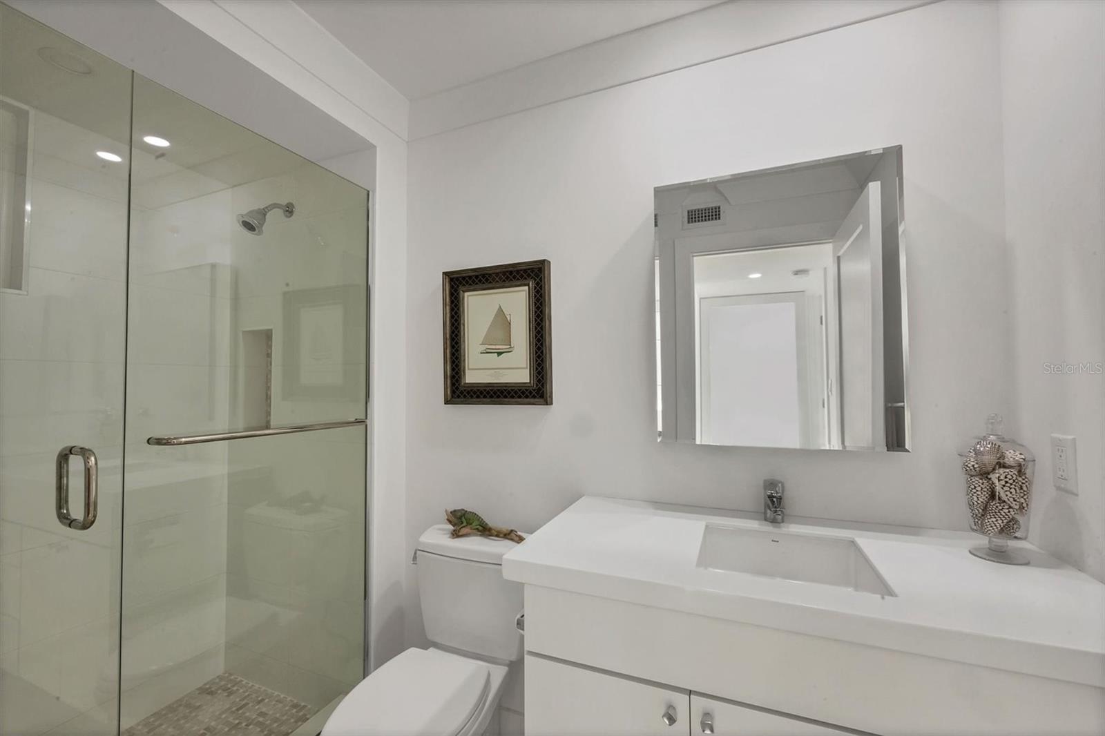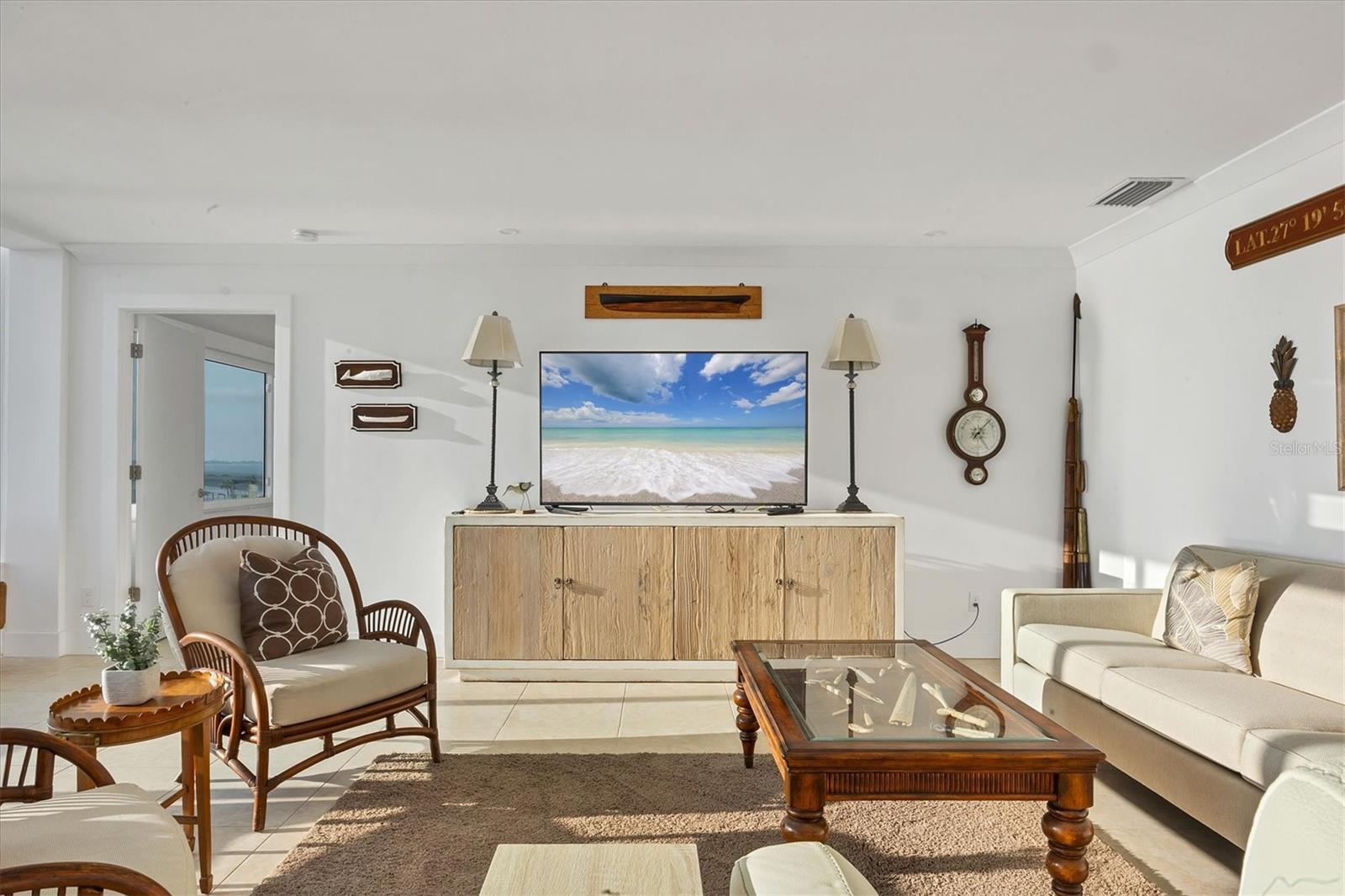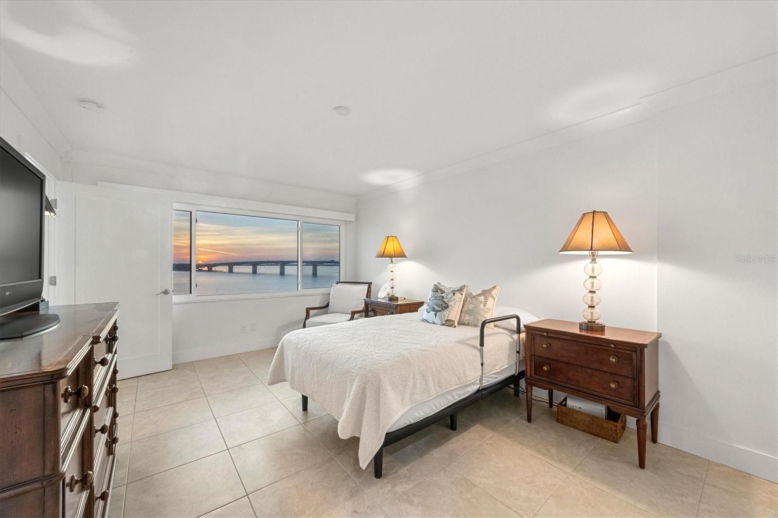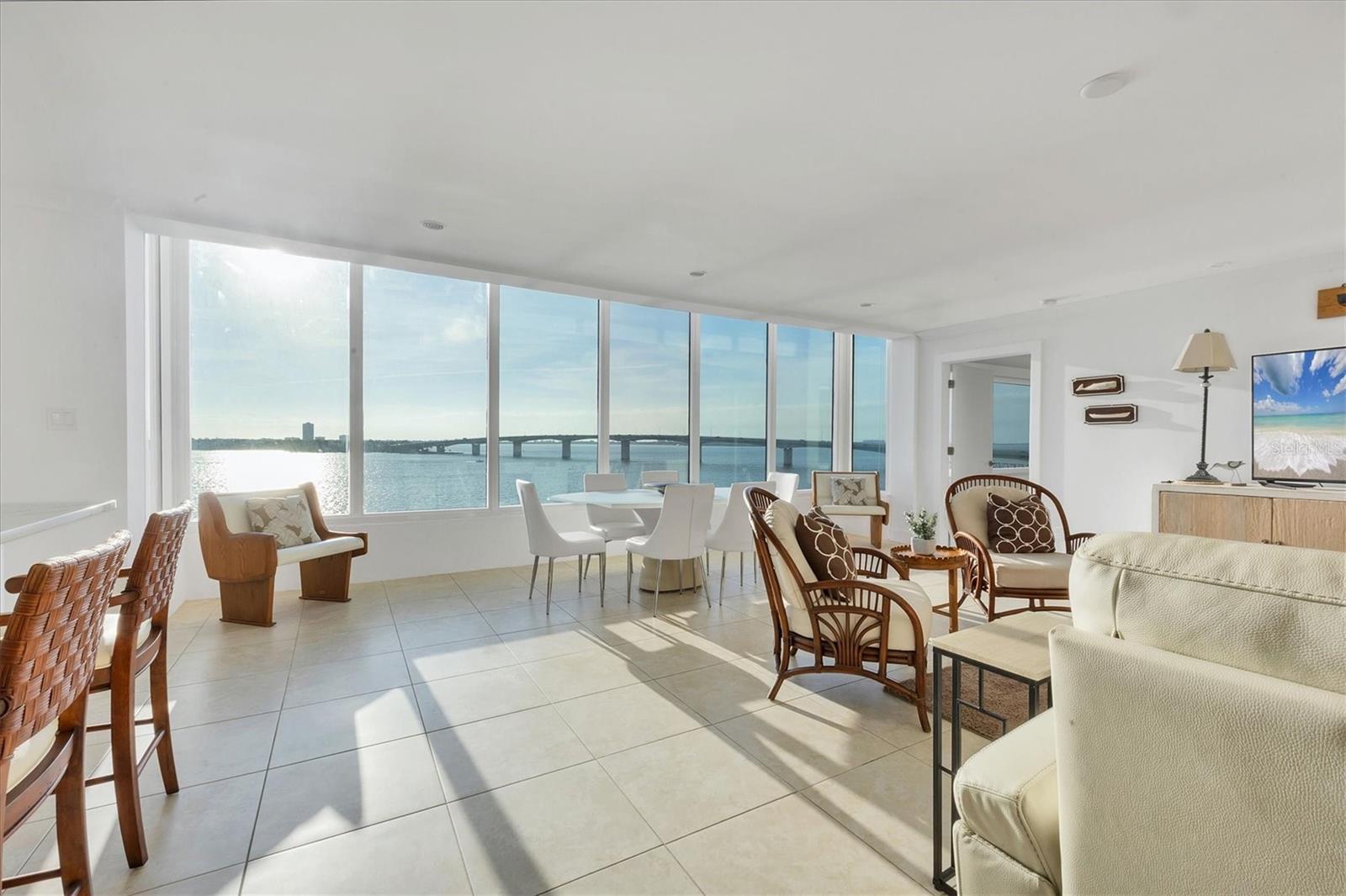 The first thing you notice is the view: a full sweep of Sarasota Bay through a wall of windows that defines the main living space. Natural light fills the open living and dining areas, where the water, the John Ringling Bridge, and the downtown skyline sit in clear, uninterrupted sight. A sizeable, light-filled great room anchors the floor plan, offering generous space for living, dining, and relaxing. The kitchen is designed for function and ease, with quartz countertops, white soft-close cabinetry, glass-front display cabinets, and stainless-steel appliances. A peninsula with bar seating connects the kitchen to the main living area, and a built-in desk overlooks the bay as an ideal workspace or breakfast bar with a true waterfront backdrop. The primary suite continues the same water-facing views, offering a wide picture window, recessed lighting, and an en-suite bath with a dual-sink vanity, quartz countertops, tall storage cabinetry, and a seamless-glass walk-in shower. The guest bedroom offers bay views as well, and a second full bathroom features an updated vanity and walk-in shower. Tile flooring runs throughout, maintaining a cohesive flow from room to room. Bay Point Apartments offers a relaxed waterfront lifestyle with a community pool, outdoor lounging space, and a day dock for fishing, launching kayaks, or welcoming friends arriving by boat. Located on quiet Golden Gate Point, the building is minutes to downtown Sarasota, St. Armands Circle, and Lido Beach.