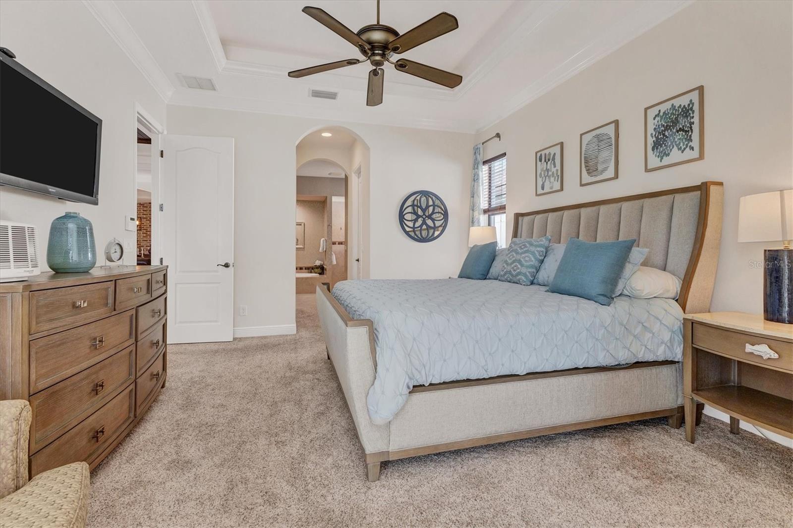 Welcome to this stunning former Lee Wetherington model home, with breathtaking views of a serene lake and lush golf course in Country Club East. This meticulously designed three-bedroom, two-bath home, complete with a den, offers the ideal balance of luxury, privacy and comfort. Decorative features like crown moldings, tasteful arches, neutral paint and subtle wallpaper finishes add elegance throughout. The large great room is an entertainer's dream, with a wood-inlaid tray ceiling, built-in shelving and a decorative brick wall finish that adds warmth and character. The great room opens directly to the expansive paver and brick lanai, which includes a saltwater pool and spa, ideal for relaxing or hosting guests while enjoying the stunning views. Directly off the great room is your kitchen with wood cabinetry, granite countertops, farm-style oversized sink, stainless steel appliances and eat-in dinette area with aquarium windows. The expansive primary suite, at the rear of the home, features a separate sitting area that overlooks the sparkling saltwater pool and spa. The suite also boasts three spacious walk-in closets and a luxurious en-suite bath with dual vanities, a soaking tub and a large walk-in shower. Two additional guest bedrooms at front of the home share a bath, ensuring privacy for all. The den, which features French doors, built-in shelving, and engineered hardwood floors, is ideal for a home office or library. The home also features a three-car garage with plentiful storage space, as well as energy-efficient upgrades, including Icynene attic insulation, Energy Star certification and Greenbuild Certification, contributing to a more sustainable lifestyle. Additional highlights include hurricane-impact sliders and front door, hurricane shutters for other windows and a water softener system for enhanced water quality. Recent upgrades include new pool pump, air-conditioning open free flow system, hurricane impact front door, new electric hot water heater, and updated smoke and carbon monoxide detectors. Country Club East residents enjoy exclusive access to The Retreat, a neighborhood amenity center boasting a resort-style pool, fitness center and billiards room. Additionally, The Residents Club offers another pool, spa, and a volleyball court for residents to indulge in leisure and recreation. For those seeking even more recreational options, just a few streets away lies the Lakewood Ranch Golf & Country Club, featuring 54 holes of golf, 20 Har-Tru tennis courts, multiple pools, and The Lodge bar and restaurant. Residents have the option to avail themselves of these facilities through various membership packages. This home is districted for top A-rated schools and only walking distance to Willis Elementary School and the beautiful Country Club Park, offering both exceptional education and abundant recreation. Discover this gem in Lakewood Ranch, America's top best-selling, planned multigenerational community.