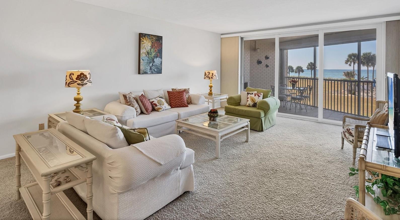 The unobstructed Gulf View greets you as you enter this 2nd floor unit. The spacious living area overlooks the large screened lanai out to the Gulf of Mexico. All units at The Westchester community have new impact resistant sliders and windows that meet Miami Dade code in order to reduce insurance premiums for all. This unit also has extra protection as both lanais have electric shutters that also help with energy cost while you are away. The windows, sliders and shutter cost were the responsibility of the owners. Brand new Hunter Douglas honeycomb blinds on both sliders. A/C is 3 years new, water heater 1 year ago. The entire unit is freshly painted and the ceilings refinished. A new GE Profile combo washer/dryer was just installed so you won't need to use the community laundry. The galley kitchen is tastefully updated with soft close cabinetry and quartz countertops. The refrigerator was replaced 2 years ago; it has a purified water option for drinking water and ice. The primary bedroom has a private lanai that overlooks the Gulf. Both en-suite bedrooms are split to offer privacy. Both have walk in closets as well as a second closet in the main bedroom area. The primary bathroom was renovated with a beautiful shower and dual vanity; The second bath was also renovated and has a large Kohler soaking tub and Kohler fixtures. The guest bedroom is large enough to accommodate 2 double beds. There are 3 entry storage closets as well as a large private storage room downstairs close to your assigned carport space. Westchester is situated on 7 acres with 700 feet of beach. There are loungers on the beach, 2 heated pools, 3 beachside tiki huts, pickleball/tennis court, kayak/bicycle storage, BBQ grills and shuffleboard. The new clubhouse with fitness center is currently under construction. The Gulf side of the property is undergoing improvements to the pool area as well as landscaping. Westchester is a very well managed property with in-house manager and maintenance staff. The unit is being offered unfurnished. BE SURE TO CHECK OUT THE VIRTUAL TOUR LINK FOR THE 3D TOUR - BETTER THAN PICTURES!