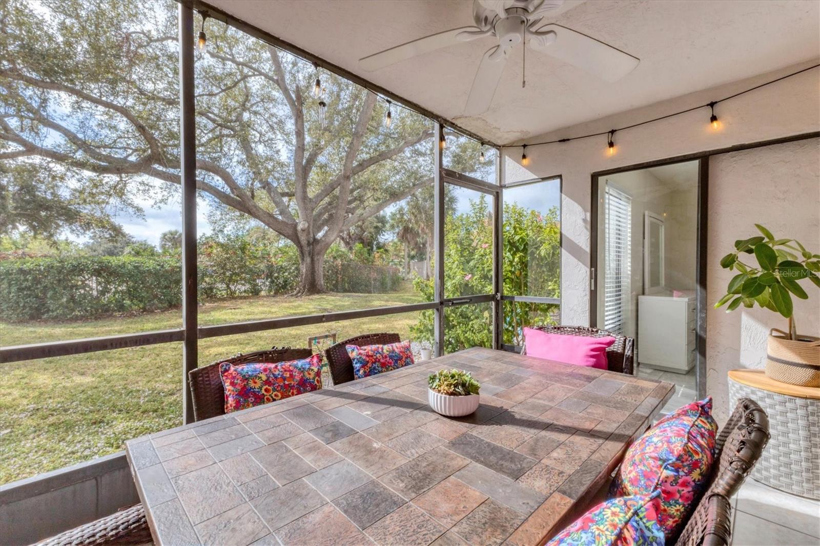 Welcome home to this beautifully updated ground-floor residence in the highly desirable Gulf Gate area. This 2 bedroom, 2 bathroom condo provides the maintenance-free lifestyle you've been looking for. The refreshed kitchen features brand new stainless steel appliances, contemporary tongue-and-groove wood ceiling, and several new cabinets topped with a crisp quartz countertop. The functional breakfast bar opens into the welcoming living room and dining space. Sliding glass doors lead to your charming screened lanai, which overlooks a peaceful grassy backyard with paver patio--perfect for morning coffee or evening relaxation. Inside, you'll appreciate the indoor laundry room and an ideal split floor plan for privacy. Other upgrades include a new AC system in 2021, new light fixtures throughout, new dryer, new sinks, faucets, and shower heads, a contemporary tv wall panel and new paint throughout. In the community, you'll enjoy the mature landscaping and manicured scenic grounds, all impeccably maintained by the association. The amenities offered at The Crossings include a swimming pool with outdoor showers, a bath house, gazebo, and clubhouse. This quiet community is located in an A+ school district and welcomes residents of all ages. Perfectly positioned near Palmer Ranch, you'll have access to championship golf, shopping, neighborhood parks, The Legacy Trail, and a wide range of dining options. You're just a short drive from I-75, Downtown Sarasota, and our famous white sand beaches. Don't miss your chance to enjoy comfort, convenience, and carefree living in one of Sarasota's most sought-after locations!
