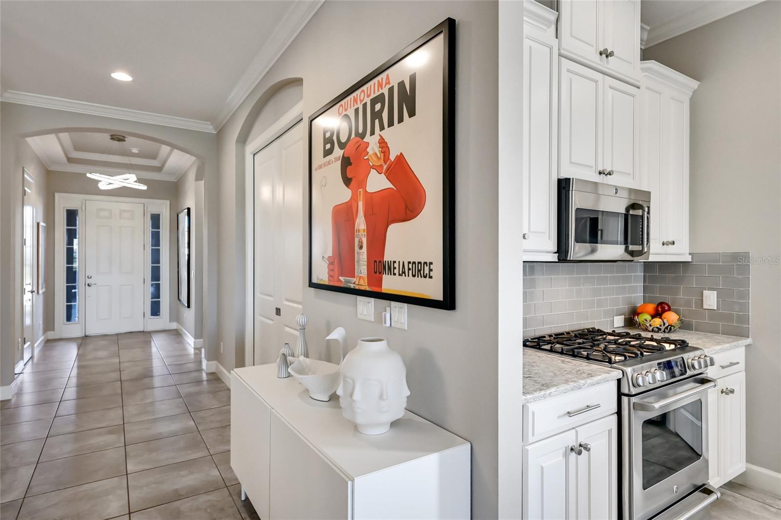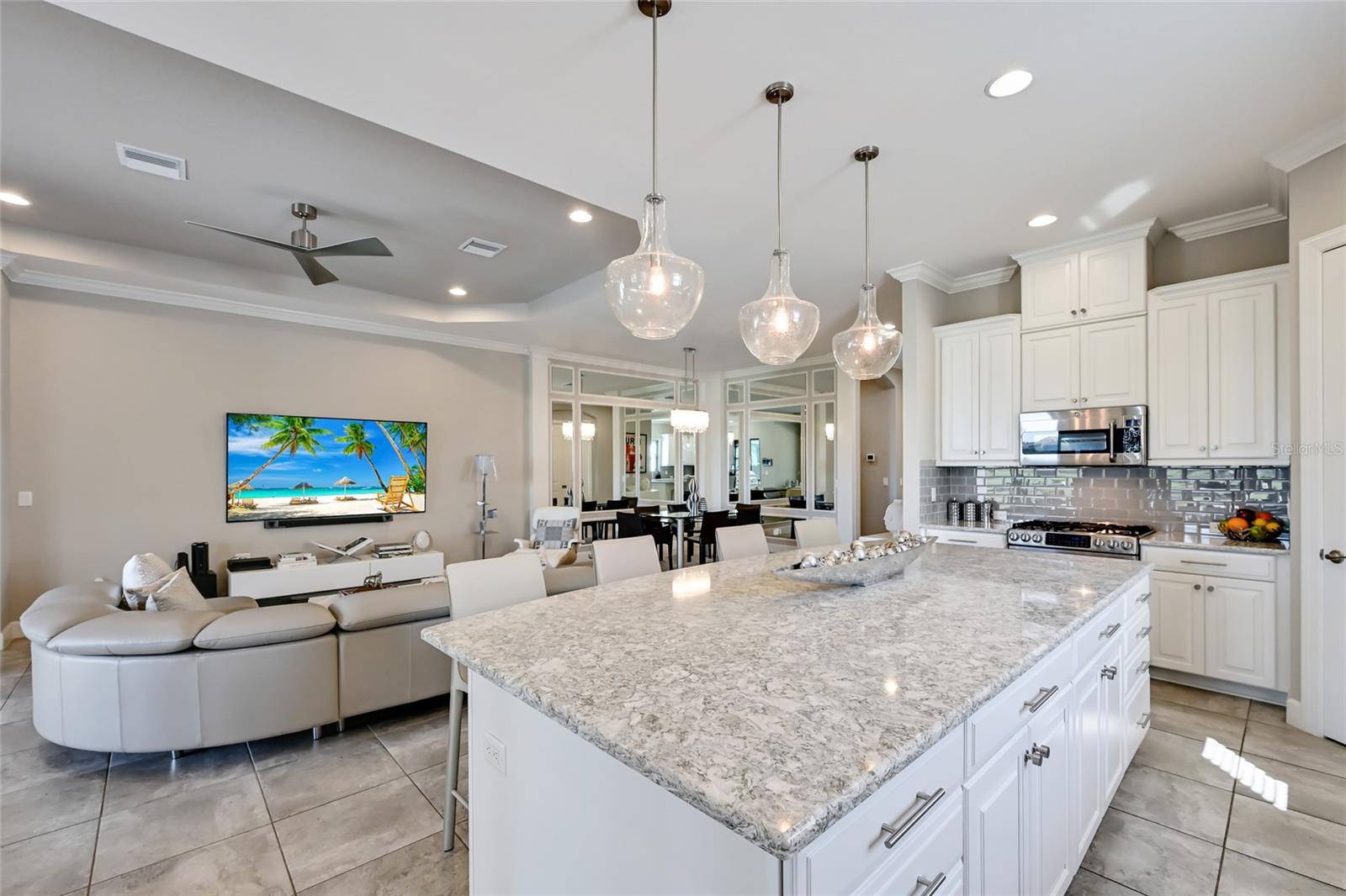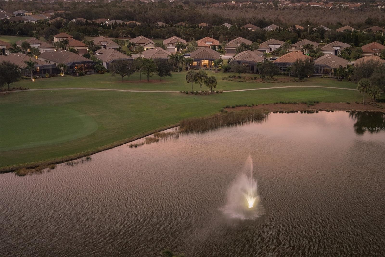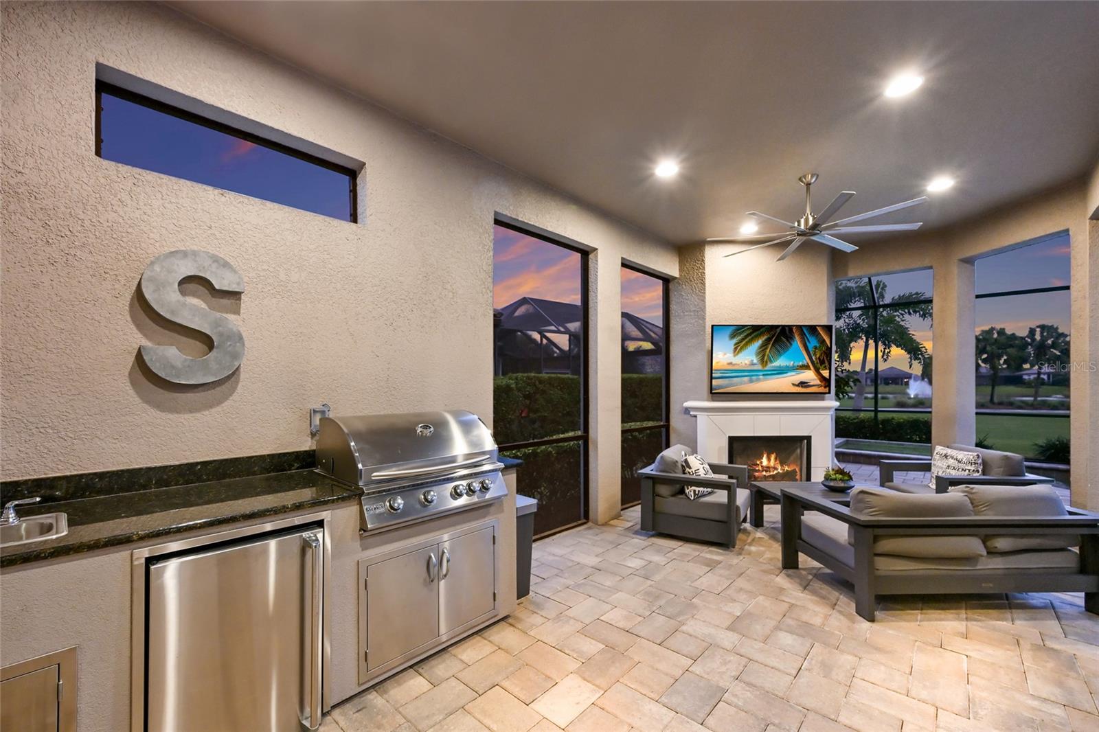 Experience the epitome of Florida escapism in this well appointed three bedroom plus den residence positioned on a south-facing golf and lake view setting in the gated Esplanade Golf & Country Club of Lakewood Ranch. GOLF MEMBERSHIP is INCLUDED from this perfectly poised Lazio showcasing 2,311 square feet of open one-story living, a stylish palette with a bright and airy interior, crowned volume ceilings, and an extended lanai package with gas fireplace seating area, full Summer kitchen, heated pool and spa, accent lanai cage lighting, Sonos speakers, and abundant open and under cover spaces for entertaining. Seamlessly connecting the outdoor retreat to the great room, kitchen and dining areas, sliders reveal a large open living concept with tray ceiling, designer light fixtures, accent-mirrored wall, and porcelain tile flooring.. Meanwhile chefs will rejoice in the inviting gourmet kitchen with a sprawling island, wood cabinetry with new hardware, stainless steel appliances, and large pantry with recently added custom shelving. Relax and unwind in the owner's retreat positioned on its own wing, offering breathtaking golf course and lake view, airy tray ceiling, a newly added customized walk-in closet, and luxuriously appointed bath with dual sink vanity, invigorating large shower, and separate water closet. Meanwhile, overnight visitors will be right at home in two generously sized guest suites with custom closets, one with a private ensuite full bath, while the other on a separate wing has its own third full bath access. The residence also boasts a large den with disappearing double-entry pocket doors, optimal as a home office, library, music room, or even wellness space. Other notable highlights of this all-encompassing 3,225 square foot three bedroom and three full bath maintenance-free residence includes outdoor Sonos speakers, large laundry room with cabinetry and sink, 8' foot interior doors, hurricane shutters, tankless water heater, and a two-car garage with new epoxy flooring and ceiling storage racks. Catering to discerning expectations, live a life well deserved in the area's preeminent golf and lifestyle community to enjoy golf, tennis, pickleball, bocce ball, and fitness center, along with resort-style pools, private cabanas, spa services, upscale restaurant and bar in the Culinary Center, a poolside full-service Tiki Bar restaurant and even two dog parks. Esplanade has something for everyone, all near dining, shopping, polo, community events and entertainment in the vibrant Lakewood Ranch, Waterside Place, Centerpointe and UTC area, surrounded by the enriching culture and the beaches of Sarasota.