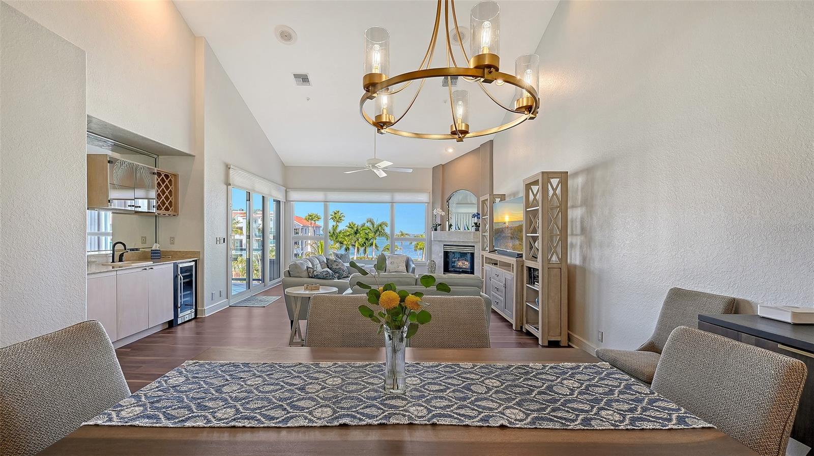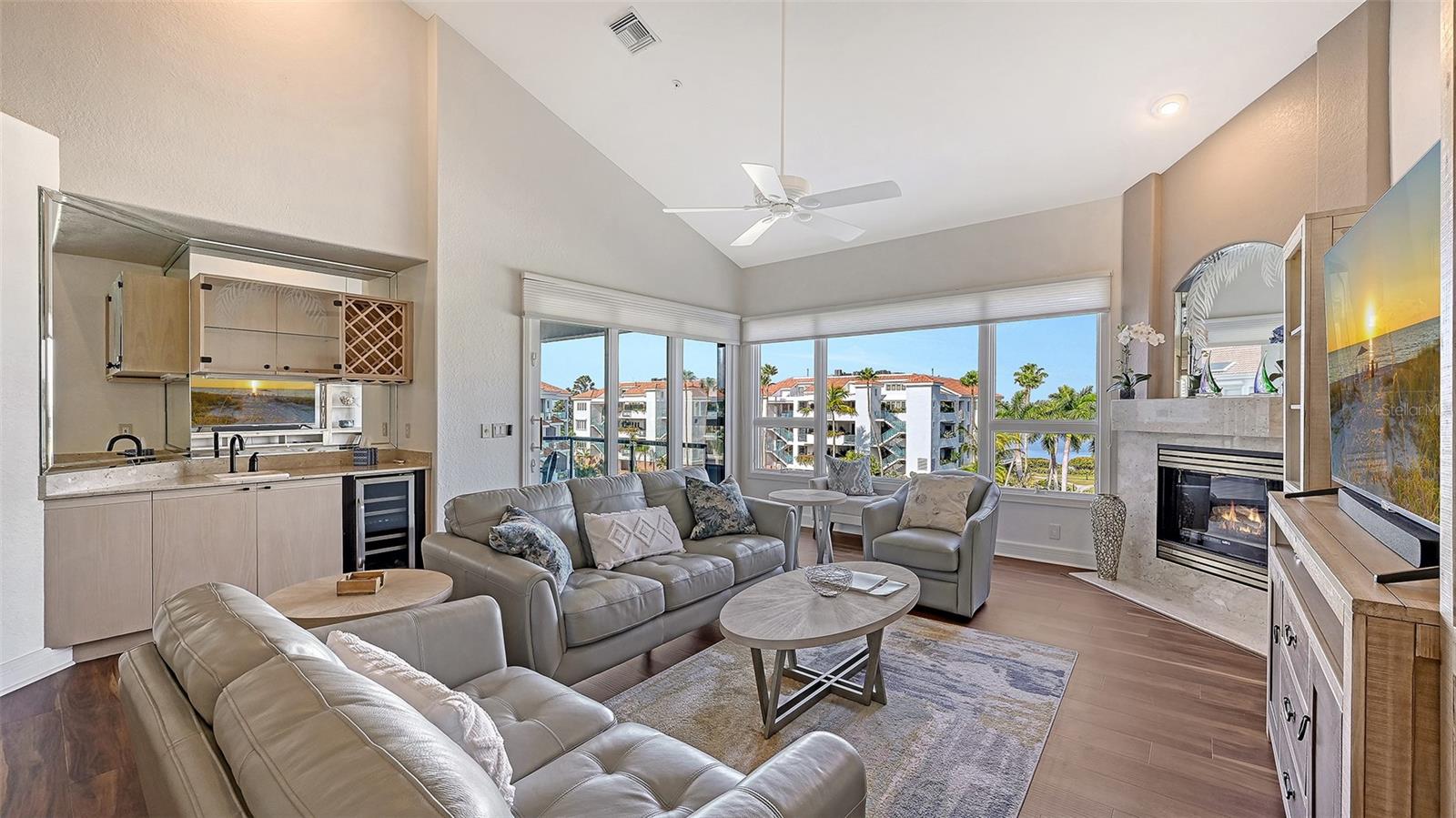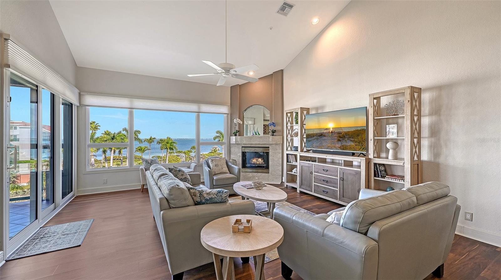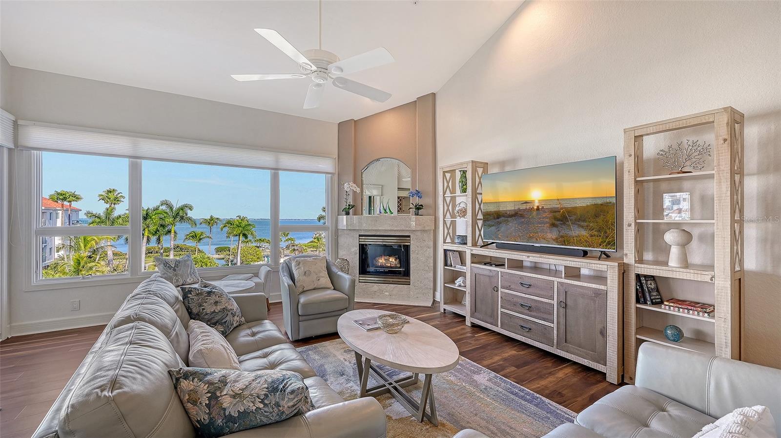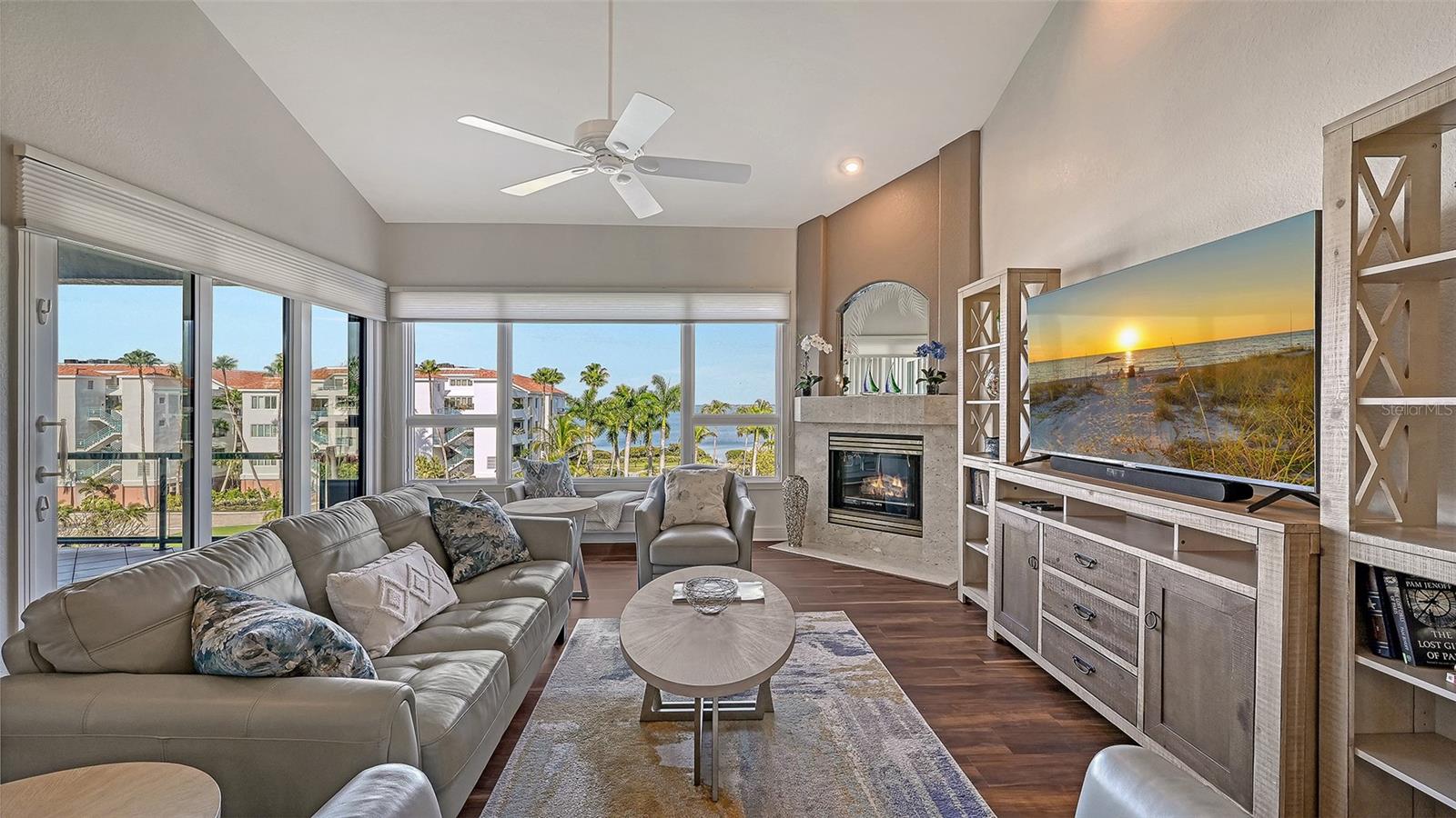 Welcome to this exceptional penthouse residence at Tangerine Bay on Longboat Key. This three-bedroom, three-and-a-half-bath home is one of the largest floor plans in the community and was originally designed and built as the builder's personal residence, offering features and scale not found in other units. Spanning two levels, the layout lives like a private home with soaring ceilings, abundant natural light, and generous indoor-outdoor spaces. The main level offers a spacious primary suite, an additional guest bedroom, a fireplace, granite countertops, a full laundry room, and all hurricane-impact windows and sliders, complemented by added storm shutters for extra protection. From the main living areas, enjoy beautiful views of Sarasota Bay along with lush tropical foliage and the resort-style pool. The pool area at Tangerine Bay is one of the most impressive on Longboat Key, designed with meandering landscaping, a surrounding lagoon, and the ambiance of a five-star resort -- truly a special setting to overlook each day. The second level features an oversized guest suite, an office, and an additional large living room complete with a Murphy bed, offering great flexibility for guests or multigenerational living. A private two-car garage located conveniently next to the elevator adds ease and security. Tangerine Bay is a gated, amenity-rich community offering a heated pool and spa, cabana, fitness center, clubhouse, community day dock, kayak launch, two pickleball courts, a tennis court, on-site management, and beautifully maintained tropical grounds. This rare penthouse combines generous space, exceptional design, and resort-style living in one of Longboat Key's most desirable waterfront communities.