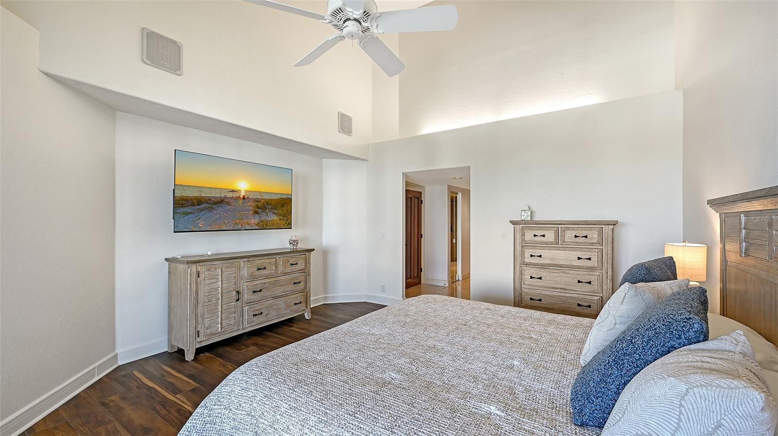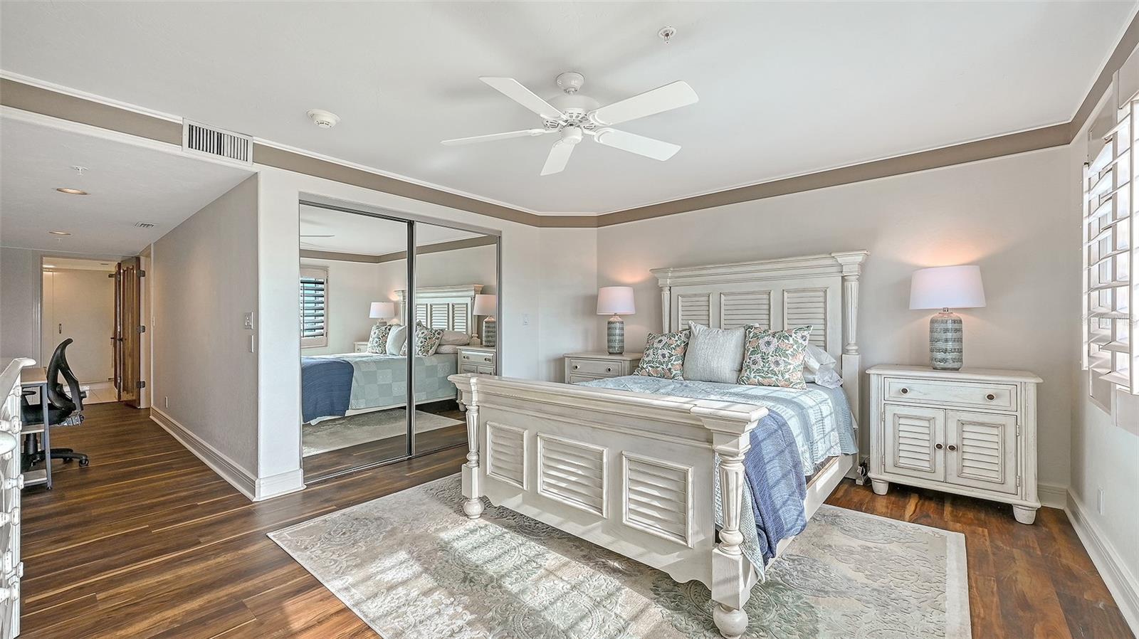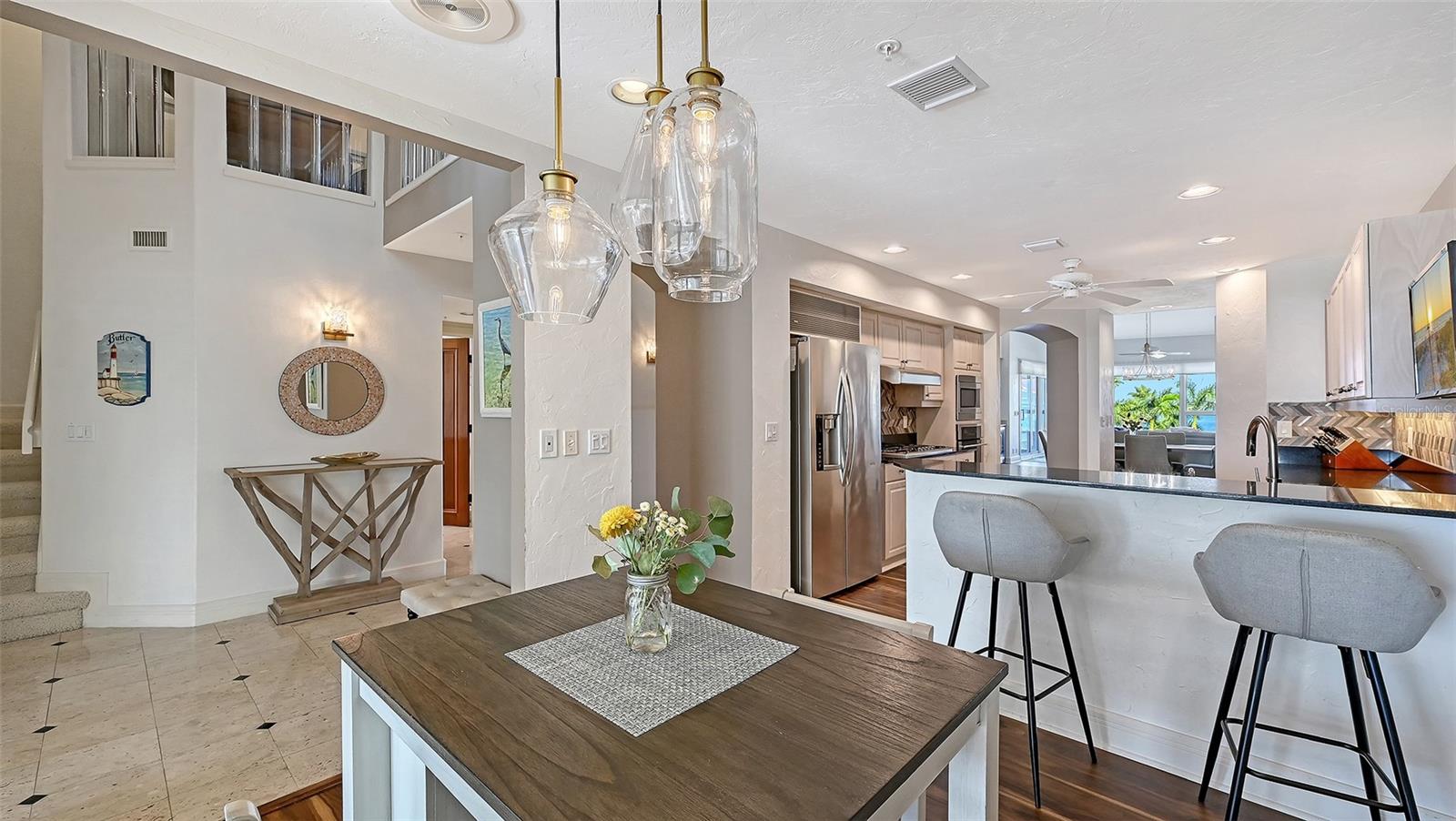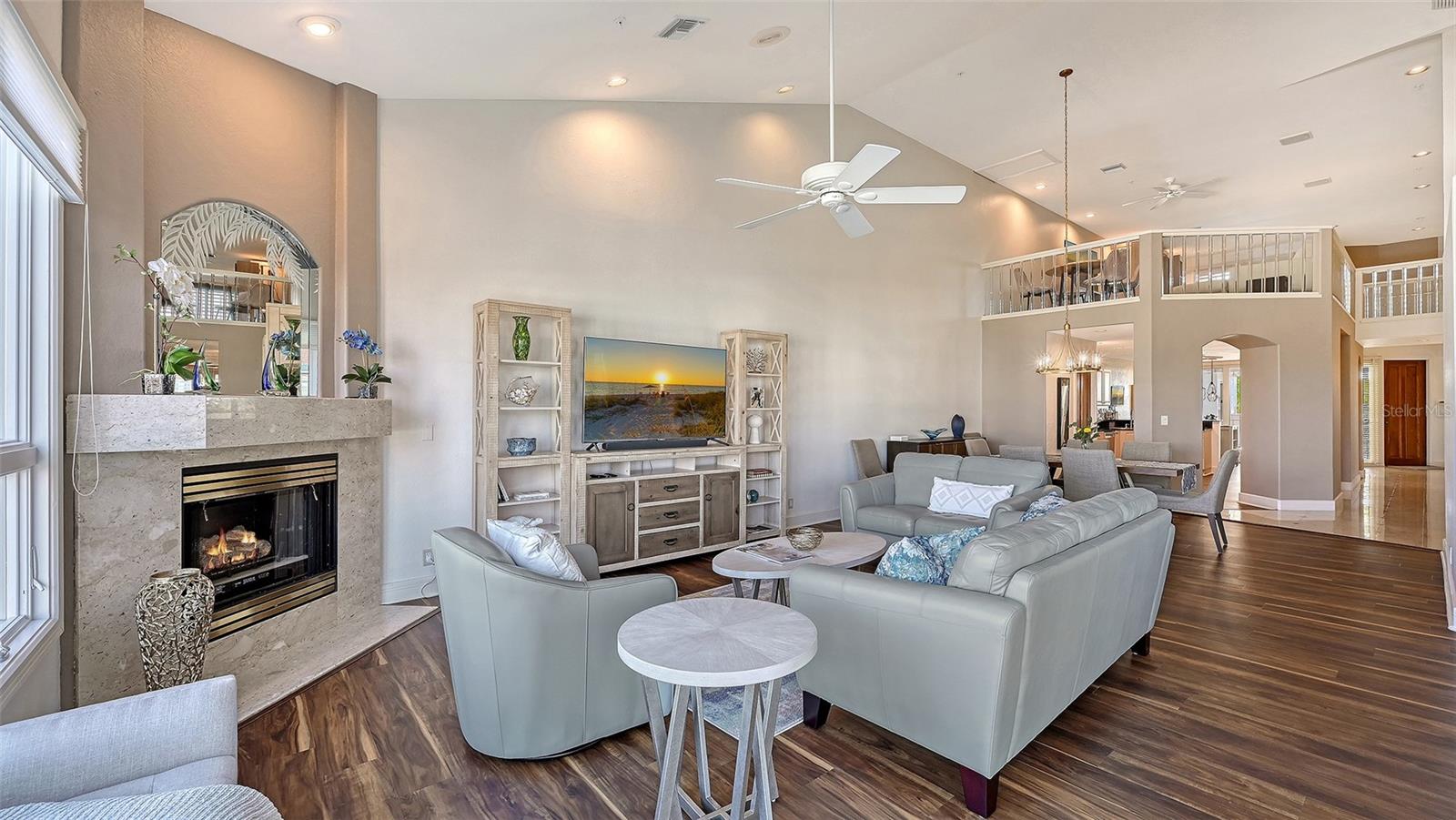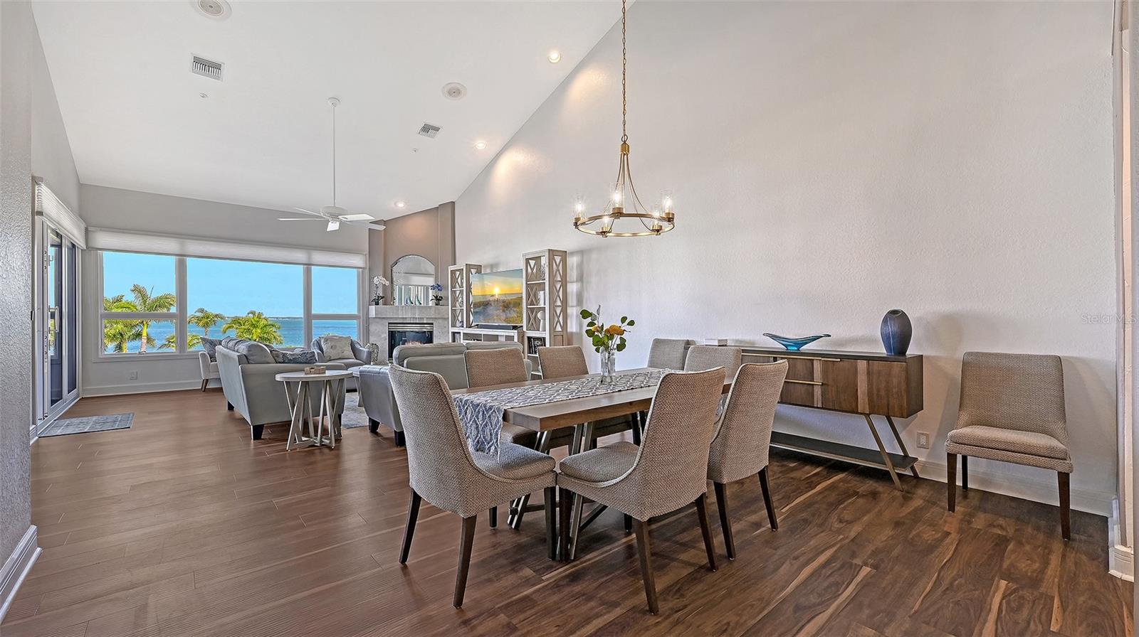 Welcome to this exceptional penthouse residence at Tangerine Bay on Longboat Key. This three-bedroom, three-and-a-half-bath home is one of the largest floor plans in the community and was originally designed and built as the builder's personal residence, offering features and scale not found in other units. Spanning two levels, the layout lives like a private home with soaring ceilings, abundant natural light, and generous indoor-outdoor spaces. The main level offers a spacious primary suite, an additional guest bedroom, a fireplace, granite countertops, a full laundry room, and all hurricane-impact windows and sliders, complemented by added storm shutters for extra protection. From the main living areas, enjoy beautiful views of Sarasota Bay along with lush tropical foliage and the resort-style pool. The pool area at Tangerine Bay is one of the most impressive on Longboat Key, designed with meandering landscaping, a surrounding lagoon, and the ambiance of a five-star resort -- truly a special setting to overlook each day. The second level features an oversized guest suite, an office, and an additional large living room complete with a Murphy bed, offering great flexibility for guests or multigenerational living. A private two-car garage located conveniently next to the elevator adds ease and security. Tangerine Bay is a gated, amenity-rich community offering a heated pool and spa, cabana, fitness center, clubhouse, community day dock, kayak launch, two pickleball courts, a tennis court, on-site management, and beautifully maintained tropical grounds. This rare penthouse combines generous space, exceptional design, and resort-style living in one of Longboat Key's most desirable waterfront communities.