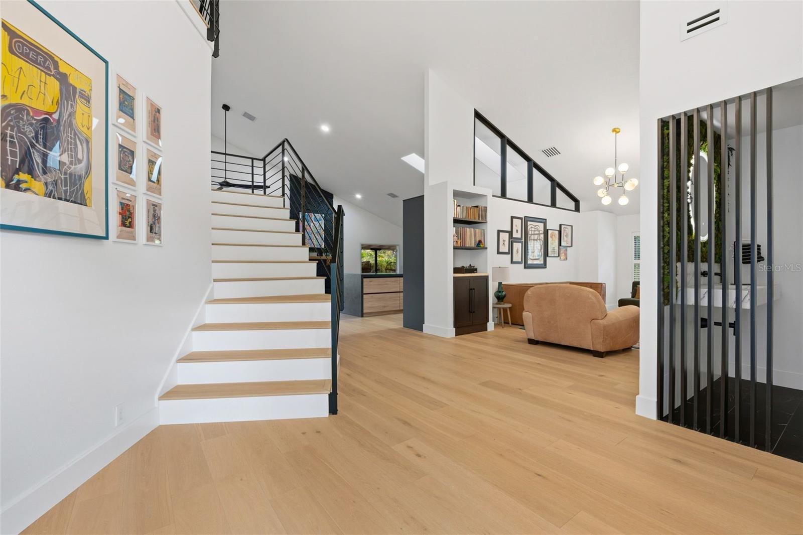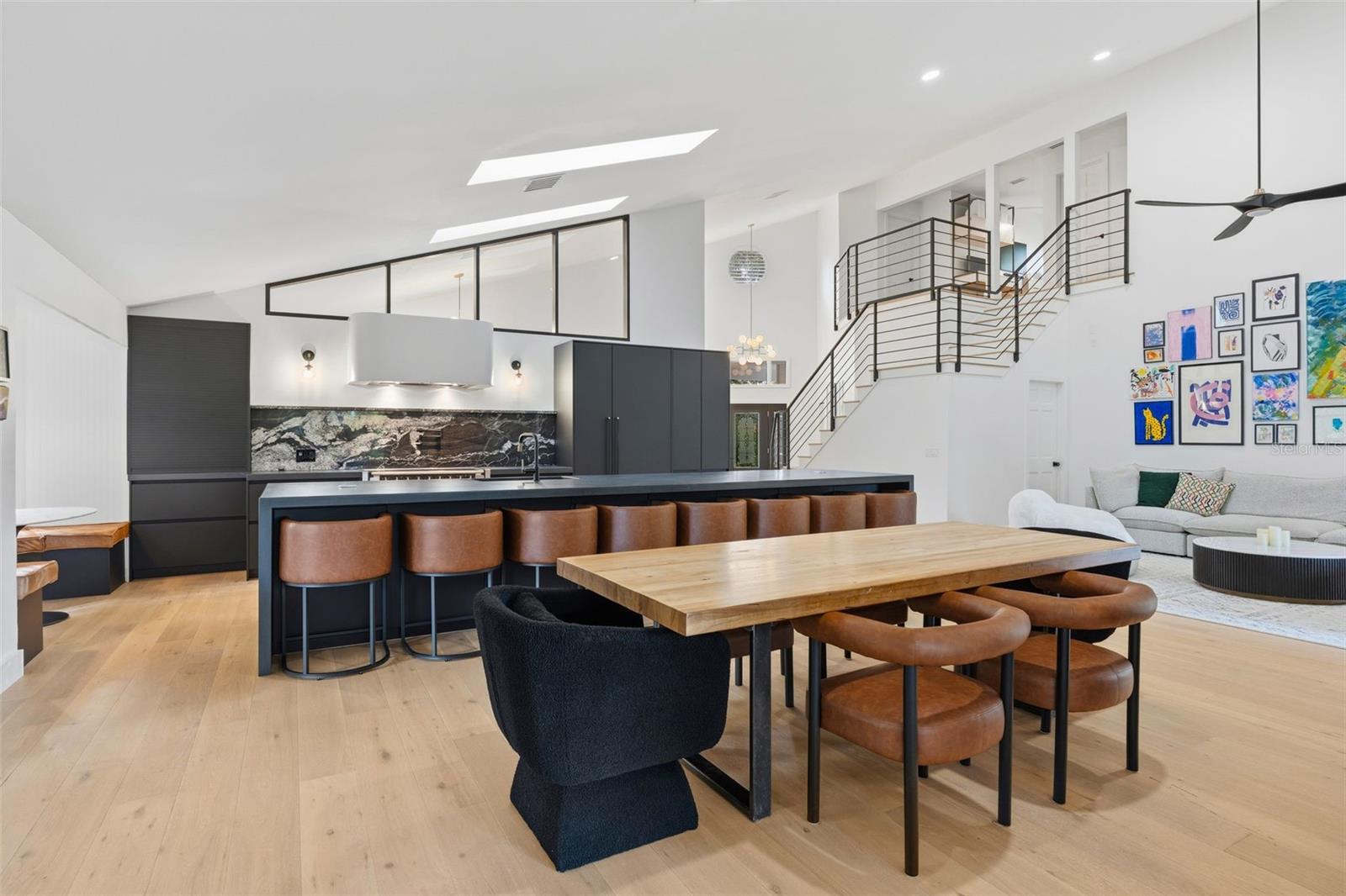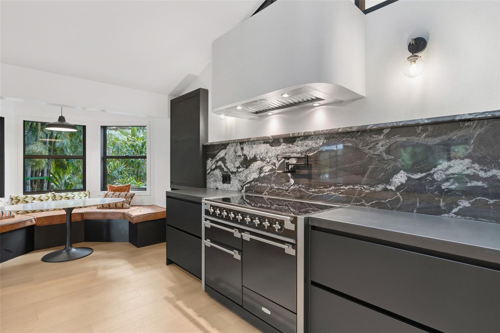 Tucked away on the tranquil cul-de-sac of Ravenwood Way, this architecturally rich home blends European elegance with modern, thoughtful design. The 1-acre waterfront estate is designed for gathering, entertaining, growing, creating, and living beautifully. Upon entry you are met with soaring 27-foot cathedral ceilings in an open, free-flowing floorplan ideal for entertaining. The space has Canadian white oak engineered floors, offering warmth against the sleek black accents, natural cement touches, and refined marble details found throughout. The chef-inspired kitchen is a distinctive statement -- truly crafted, using German engineering principles, intelligent design storage, and premium integrated appliances. A striking 16-foot cement waterfall island, created by local artist Jake Brady, captures the spirit of the home -- artisanal, durable, and functional. The kitchen features a 48" AGA British induction stove, dual Fisher & Paykel built-in fridge & freezer, elegant pot filler, Italian Elica Arrezzo ventilation system, two Asko stainless steel dishwashers, and an appliance garage. Off the kitchen is the relaxing bay-window breakfast nook. The living area, with a fully functional wood-burning fireplace, creates an atmosphere of intimate gatherings. Adjacent is the TV projection room -- a cozy retreat designed for shared experiences. The staircase's modern single-piece aluminum railing enhances the home's architectural lines. The first floor main suite, features a custom white oak privacy wall, dedicated workspace nook, and thoughtfully designed walk-in closet with white pine industrial-style storage. The main bathroom continues the aesthetic: double vanities, soaking tub, shower, and soft neutral design. Upstairs, the two bedrooms were both designed with comfort in mind -- sliding closet doors, built-in storage, one with a window seat, and the other has a private balcony overlooking the lake. The second-floor landing, ideal for a study, office, or creative space, serves as a vibrant corner for kids, professionals, or guests. The upstairs bathroom embraces a refined black-and-white marble theme. The downstairs half-bath is a true conversation piece featuring a living wall, one-piece violet marble sink imported from Turkey, and a technologically advanced toilet with heated seat, handless flushing, and luxury finishings. Three sets of French doors open to the L-shaped covered lanai, transforming indoor living into outdoor lifestyle. Overlooking the lake, private dock, mature trees, and native wildlife. Enjoy the lake while kayaking, pole fishing, or relaxing on a small boat. The saltwater heated pool sits within lush low-maintenance tropical landscaping, framed by Sarasota-native palms, fragrant ginger plants, and fruit trees (mango, banana, pomegranate, guava, & starfruit. The home offers an updated laundry room, new garage cabinetry and flooring, and additional attic storage. The Ravenwood community is known for its generous lot sizes, architectural individuality, and rapid gentrification. Ideally located close to Nathan Benderson Park (with rowing, trails, world-class events), UTC Town center mall, dining galore and championship golf courses. It is a short drive to Airport or I-75 for easy commuting and a short drive to Downtown & Sarasota's world-famous beaches. Secluded, yet minutes from everything that defines Sarasota living. It is the perfect address for those who value serenity without sacrificing access or lifestyle.