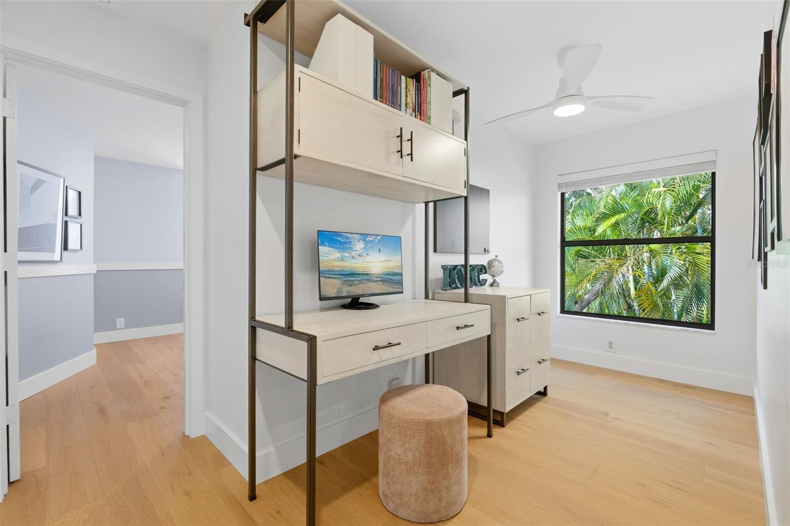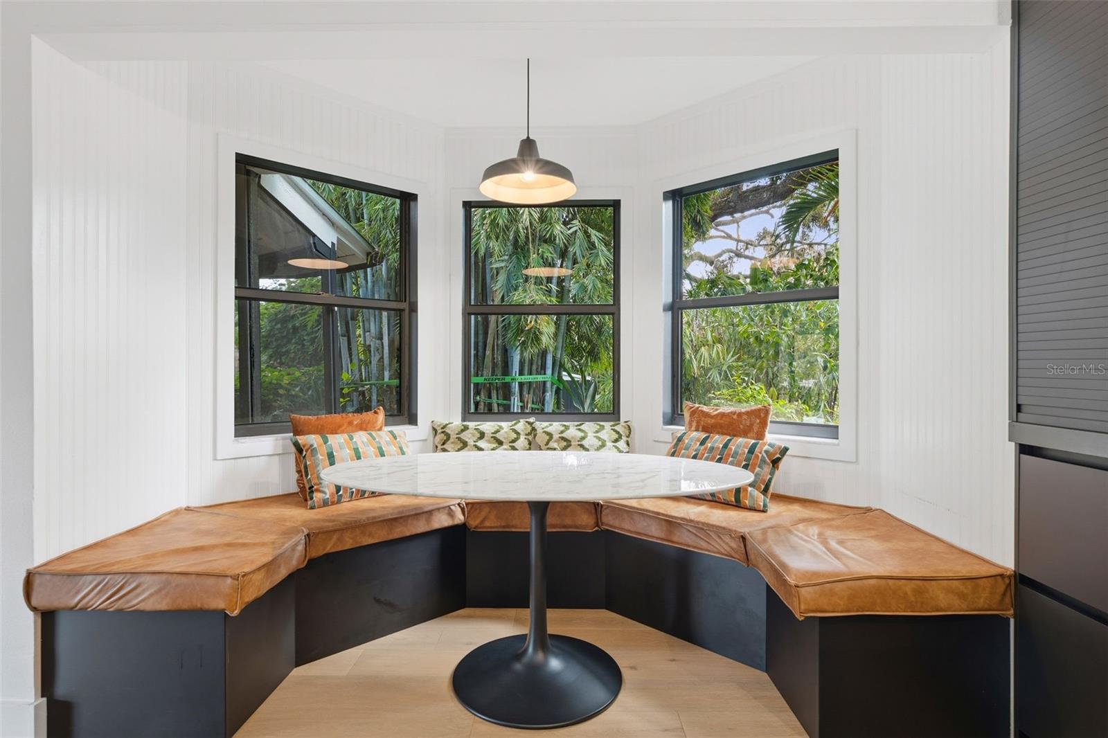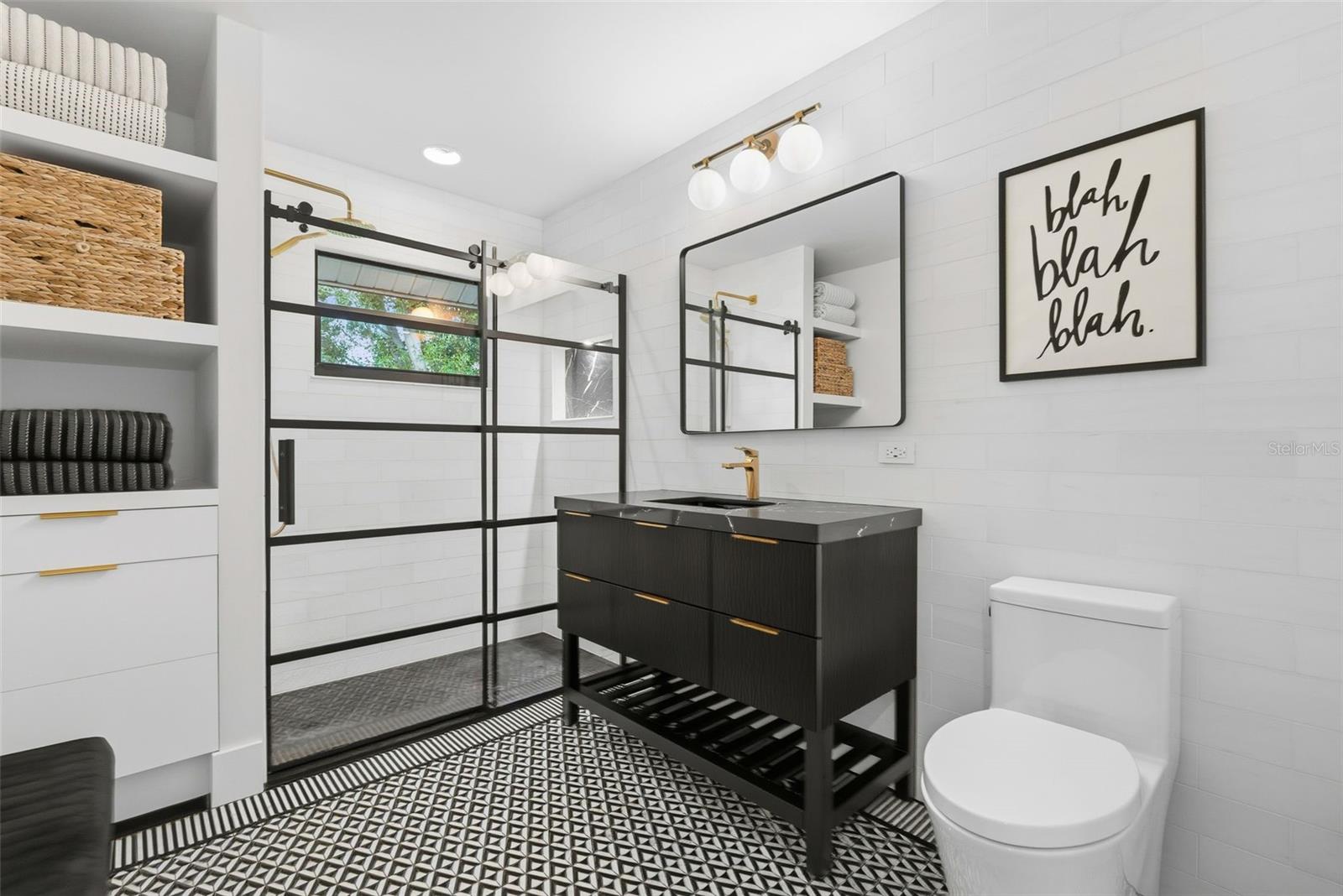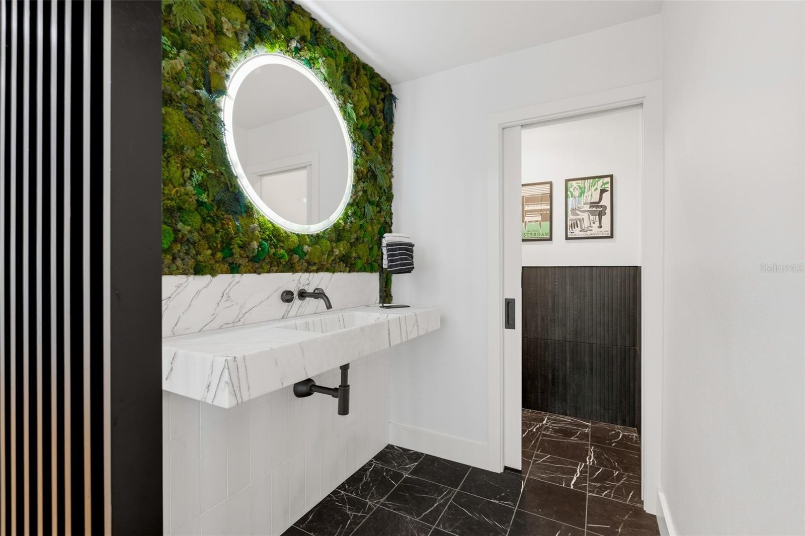 Tucked away on the tranquil cul-de-sac of Ravenwood Way, this architecturally rich home blends European elegance with modern, thoughtful design. The 1-acre waterfront estate is designed for gathering, entertaining, growing, creating, and living beautifully. Upon entry you are met with soaring 27-foot cathedral ceilings in an open, free-flowing floorplan ideal for entertaining. The space has Canadian white oak engineered floors, offering warmth against the sleek black accents, natural cement touches, and refined marble details found throughout. The chef-inspired kitchen is a distinctive statement -- truly crafted, using German engineering principles, intelligent design storage, and premium integrated appliances. A striking 16-foot cement waterfall island, created by local artist Jake Brady, captures the spirit of the home -- artisanal, durable, and functional. The kitchen features a 48" AGA British induction stove, dual Fisher & Paykel built-in fridge & freezer, elegant pot filler, Italian Elica Arrezzo ventilation system, two Asko stainless steel dishwashers, and an appliance garage. Off the kitchen is the relaxing bay-window breakfast nook. The living area, with a fully functional wood-burning fireplace, creates an atmosphere of intimate gatherings. Adjacent is the TV projection room -- a cozy retreat designed for shared experiences. The staircase's modern single-piece aluminum railing enhances the home's architectural lines. The first floor main suite, features a custom white oak privacy wall, dedicated workspace nook, and thoughtfully designed walk-in closet with white pine industrial-style storage. The main bathroom continues the aesthetic: double vanities, soaking tub, shower, and soft neutral design. Upstairs, the two bedrooms were both designed with comfort in mind -- sliding closet doors, built-in storage, one with a window seat, and the other has a private balcony overlooking the lake. The second-floor landing, ideal for a study, office, or creative space, serves as a vibrant corner for kids, professionals, or guests. The upstairs bathroom embraces a refined black-and-white marble theme. The downstairs half-bath is a true conversation piece featuring a living wall, one-piece violet marble sink imported from Turkey, and a technologically advanced toilet with heated seat, handless flushing, and luxury finishings. Three sets of French doors open to the L-shaped covered lanai, transforming indoor living into outdoor lifestyle. Overlooking the lake, private dock, mature trees, and native wildlife. Enjoy the lake while kayaking, pole fishing, or relaxing on a small boat. The saltwater heated pool sits within lush low-maintenance tropical landscaping, framed by Sarasota-native palms, fragrant ginger plants, and fruit trees (mango, banana, pomegranate, guava, & starfruit. The home offers an updated laundry room, new garage cabinetry and flooring, and additional attic storage. The Ravenwood community is known for its generous lot sizes, architectural individuality, and rapid gentrification. Ideally located close to Nathan Benderson Park (with rowing, trails, world-class events), UTC Town center mall, dining galore and championship golf courses. It is a short drive to Airport or I-75 for easy commuting and a short drive to Downtown & Sarasota's world-famous beaches. Secluded, yet minutes from everything that defines Sarasota living. It is the perfect address for those who value serenity without sacrificing access or lifestyle.