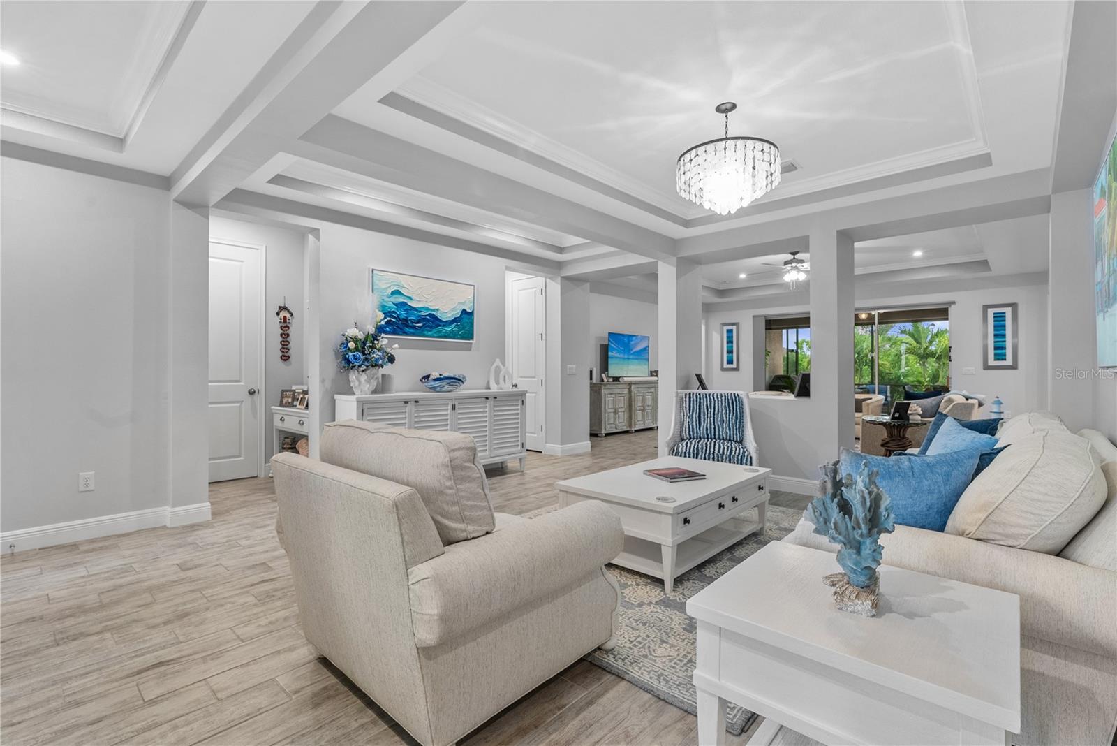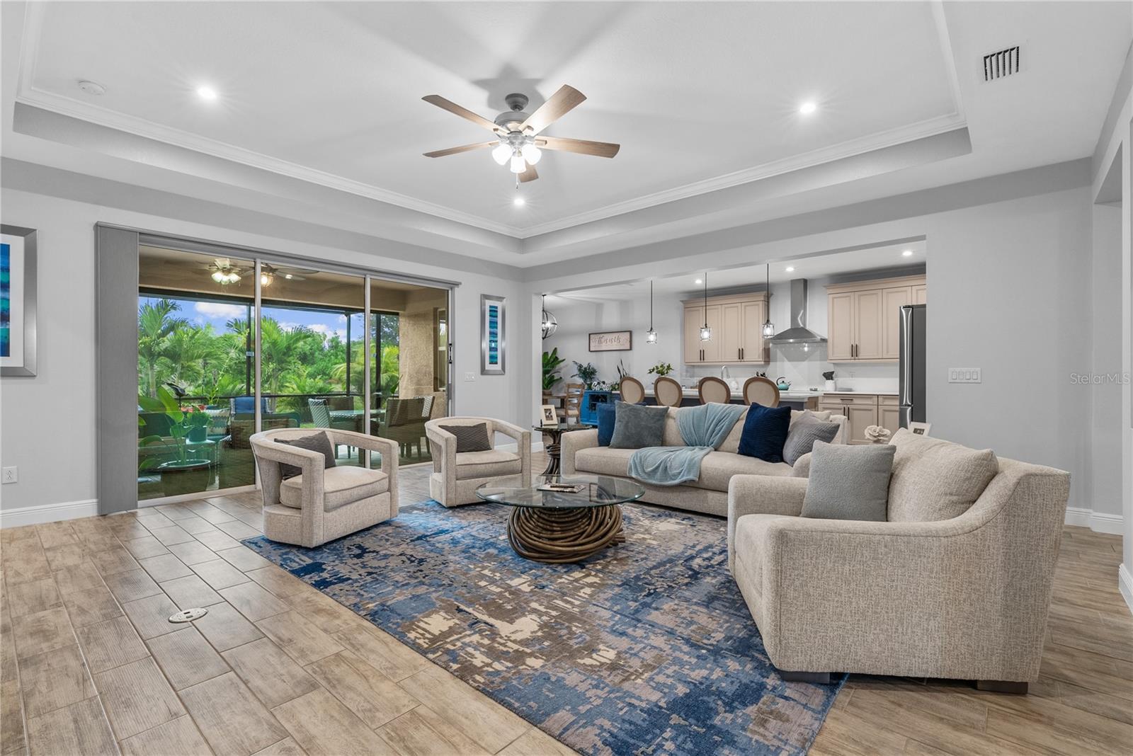This exceptional and highly upgraded Nantucket II model stands out as one of the finest homes in Renaissance at Wellen Park. Featuring four bedrooms, three baths, and a three-car garage, this residence offers a rare multigenerational layout with the ability to create a private in-law or guest suite with its own entrance and garage access. Best of all, this home is located outside of a flood zone and does not require flood insurance. The kitchen has been completely transformed with custom 50-inch solid maple cabinetry, quartz countertops, a stunning oversized island, and premium appliances including a KitchenAid wall oven/microwave, Samsung FlexZone refrigerator (2022), LG three-tray dishwasher with warranty, Whirlpool cooktop, and a stainless steel vented hood. Wood plank tile flooring runs through all main living areas, complemented by designer tray ceilings with crown molding, neutral upscale finishes, and custom window treatments. The owner's suite and main living spaces exude a refined aesthetic, while the extended screened lanai, pre-plumbed for an outdoor kitchen, offers peaceful outdoor living surrounded by lush tropical landscaping. The homesite accommodates a future pool, providing flexibility to design your ideal backyard retreat. Additional upgrades include $25,000 in storm protection (accordion shutters, automatic lanai screen, and 2023 impact-glass front door), upgraded laundry cabinetry with folding surface, and a Sentricon termite system. Renaissance at Wellen Park offers resort-style amenities including a clubhouse, pickleball, tennis, bocce, playground, direct access to the 33-acre Blue Heron Park, and proximity to downtown Wellen Park, CoolToday Park, golf, shopping, and Gulf beaches. This is a rare opportunity to own a one-of-a-kind home with luxury finishes, thoughtful upgrades, and no flood insurance required.