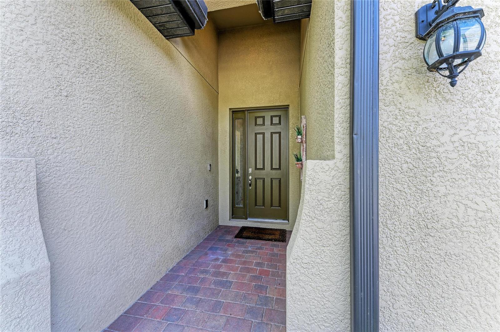 Exterior: Hurricane Shutters, Rain Gutters, Sidewalk, Sliding Doors