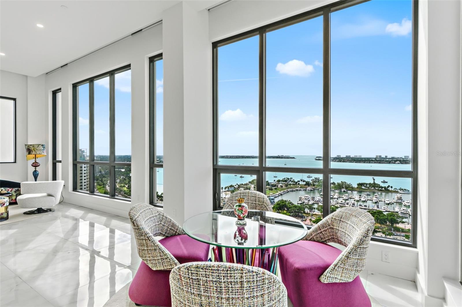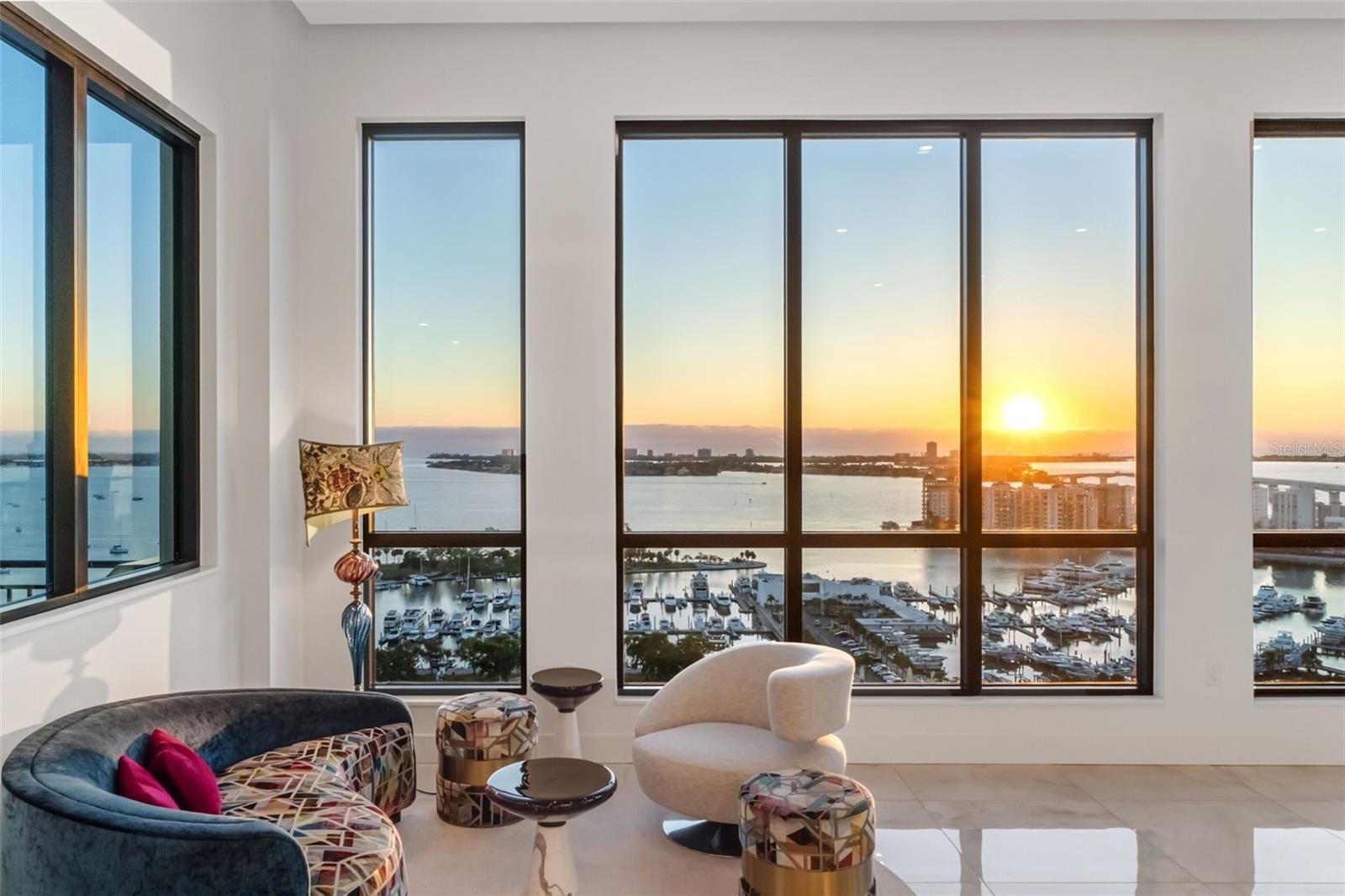 UNPARALLELED LUXURY HIGH ABOVE SARASOTA BAY!! Are you looking for the best views in Sarasota? Look no further...Soaring 17 stories above Sarasota's most coveted address, this extraordinary 3,407-square-foot residence redefines elegance. Residence 1701 at 33 South Palm Avenue presents a rare opportunity to own one of the finest penthouses in Sarasota, where breathtaking panoramic views meet impeccable Italian craftsmanship. From the moment you enter, floor-to-ceiling windows framed by 12-foot ceilings unveil a mesmerizing 360-degree canvas. Watch sailboats glide across Sarasota Bay, admire the barrier islands stretching toward the Gulf of Mexico, observe the vibrant marina below, and take in the glittering city skyline. These aren't just views--they're an ever-changing masterpiece visible from every room. The gourmet kitchen stands as a testament to culinary excellence, featuring custom Italian cabinetry, premium Miele cabinet-panel appliances including gas cooking, dual ovens, and dual dishwashers. Quartz countertops and walls provide both beauty and durability, while a full standing freezer in the walk-in pantry ensures you're always prepared for any occasion. Wine connoisseurs will marvel at the custom 2,500-bottle climate-controlled wine room--a sophisticated showcase for your collection and the perfect conversation piece for entertaining. This three-bedroom haven offers ultimate privacy with en-suite bathrooms for each bedroom, all appointed with spa-like finishes that transform daily routines into restorative rituals. A dedicated office with a private balcony and custom built-in wall units and desk provides the perfect work-from-home sanctuary, while a convenient powder room accommodates guests. The living spaces feature custom built-in entertainment centers and bar cabinetry, seamlessly integrating technology and function with Italian design sensibility. Ascend to the rooftop oasis where a sparkling pool, spa, and outdoor kitchen await against a backdrop of endless sky and sea. The rooftop lounge with catering kitchen makes entertaining effortless, while the fitness center keeps you at your best. Two assigned valet parking spaces ensure convenience and security. This is more than a residence--it's a front-row seat to Sarasota's cultural renaissance, steps from world-class dining, performing arts, and the marina. Experience the pinnacle of luxury living where every detail has been carefully considered and every view takes your breath away.