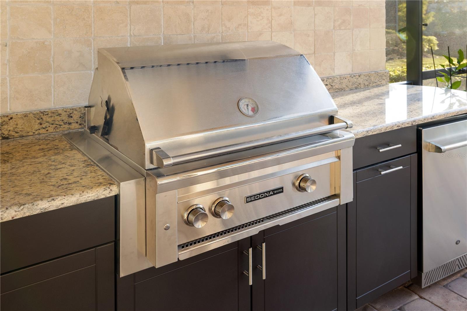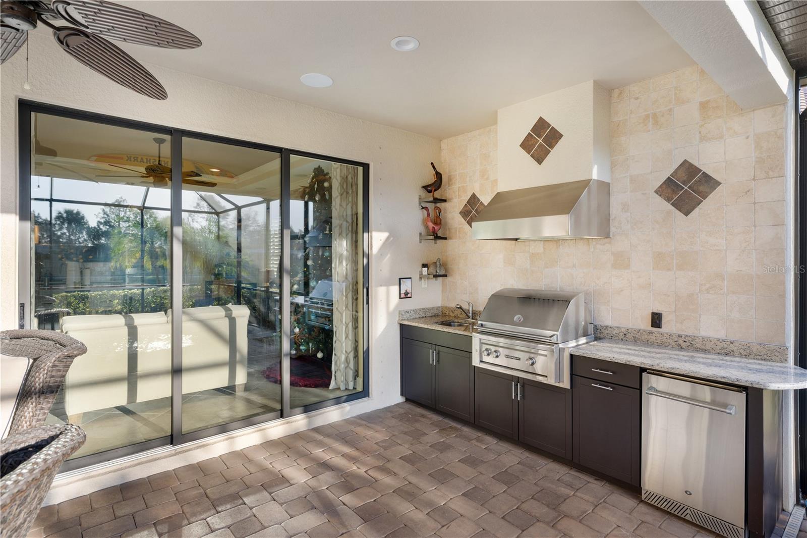Exterior: Hurricane Shutters, Lighting, Outdoor Grill, Outdoor Kitchen, Rain Gutters, Sidewalk, Sliding Doors