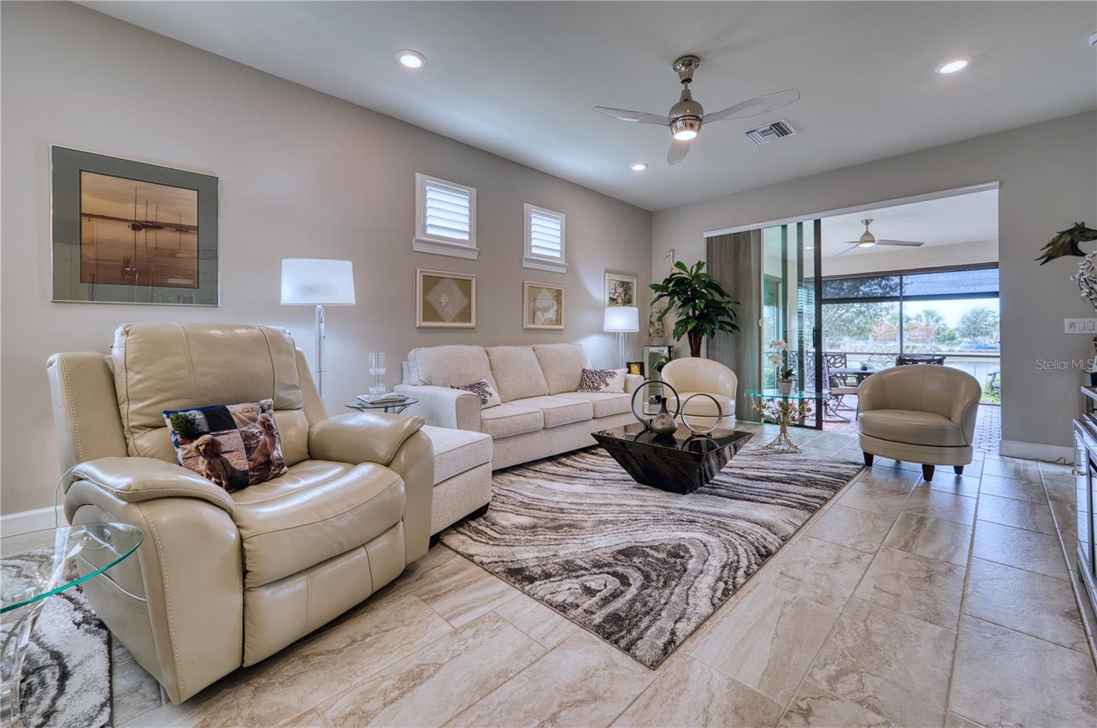 Inside Freshly Painted!!! Contemporary and Comfortable with a Fabulous view is what you will feel in this 2 Bed, 2 Bath plus Den Serenity paired villa. Beautifully appointed, you will want to relax on the extended lanai with storm screens - ( Accordion shutters are on the rest of the windows which will add to your peace of mind. )This home is ready for you to enjoy as either part time or full time, with plenty of space in the open floor plan. Del Webb offers resort style living with wonderful amenities including pickleball, tennis, and a fully equipped gym, card rooms, the "Lakehouse"restaurant, a resort style pool, a secondary pool and a full schedule of activities for every interest. With an entrance on Masters' Ave as well, the location is perfect- allowing access to University Pkwy, Waterside, UTC Mall, Mote Marine, downtown Sarasota, our beautiful beaches and everything North or South. This is a must see- your pathway to relax, renew and reboot!