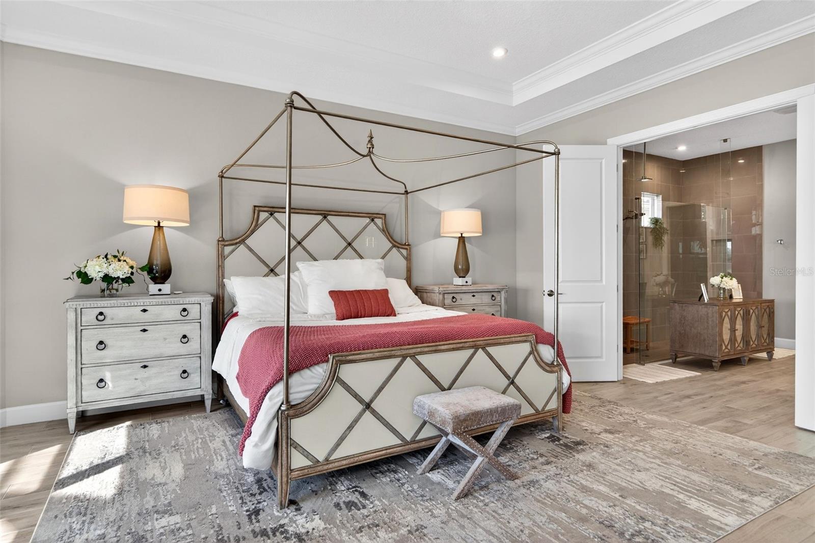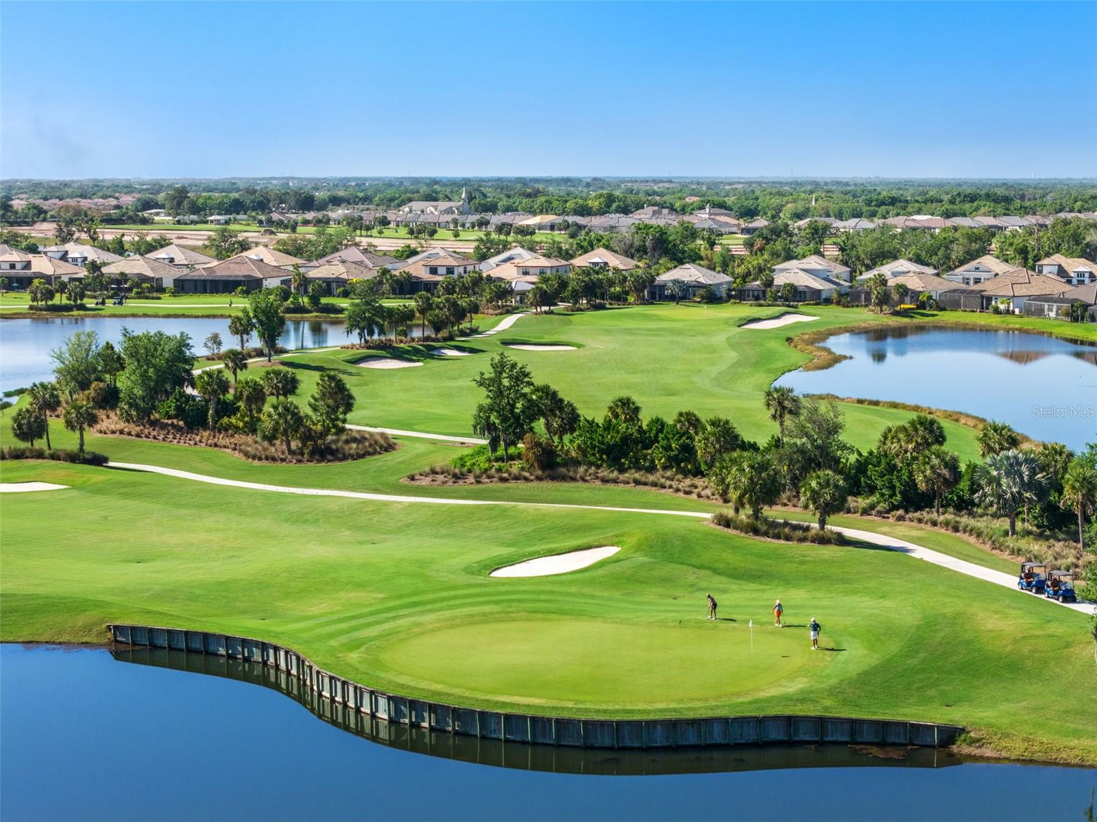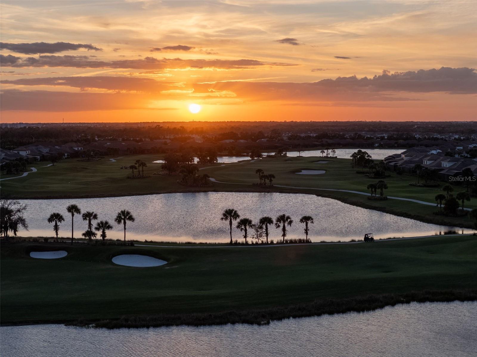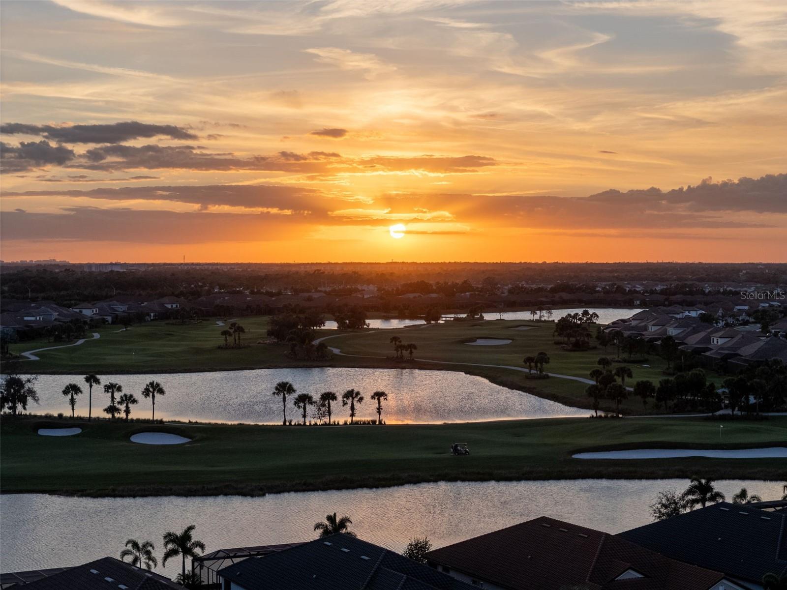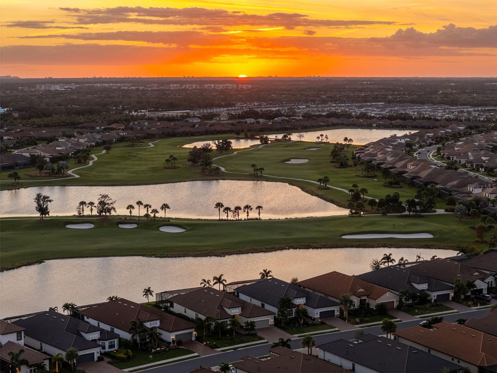 Welcome to you.r Fully Furnished Sunset Home!! Discover the perfect blend of luxury, comfort, and breathtaking views in this move-in-ready Pallazio floor plan, beautifully situated on a prime lake and golf homesite in Esplanade at Azario. From the moment you arrive, the upgraded landscaping and outdoor lighting set an inviting tone. Step through the elegant double glass doors and into a spacious three-bedroom, three-bath residence with a den, thoughtfully designed with high-end custom finishes throughout. All major furniture conveys; accessories, dcor, artwork, small kitchen appliances, dishes etc. and personal items will be at the seller's discretion. All bikes, wine and liquor does NOT convey.The enclosed office with glass doors provides a quiet workspace, while both guest suites offer ideal privacy. A custom wine wall and bar create a warm, stylish focal point in the dining area--perfect for entertaining. The gourmet kitchen features stainless steel Monogram appliances, abundant storage, and a layout designed for effortless hosting.Indoor living flows seamlessly to the stunning outdoor retreat, complete with an expansive pool and spa, travertine decking, outdoor kitchen, and fireplace. The panoramic screen showcases serene lake and golf views and unforgettable sunsets.This true smart home allows you to control lighting, security, Sonos audio, thermostat, pool, spa, and more directly from your phone. Upgrades include impact windows, lanai sunshades, a tankless Rinnai water heater, designer tile flooring, upgraded baths, custom closets and pantries, security cameras, and a spacious three-car tandem garage.Located in the resort-style community of Esplanade at Azario, residents enjoy a championship golf course, resort pool, poolside bar, spa, fitness center, tennis, and pickleball. ($1000 annual food & beverage minimum and $5,000 capital contribution due at closing. Golf membership included.)