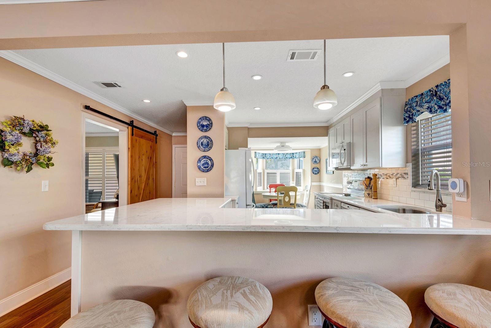 Welcome to Mount Vernon, a sought-after, maintenance-free 55+ waterfront community where a rare, turnkey 3-bedroom villa--the largest floor plan in the entire neighborhood--is now available. This light, bright residence has been thoughtfully updated in recent years and offers peace of mind with a new roof (2023), new A/C (2025), and hurricane-impact windows (2023) and plantation shutters thruout entire home. Step inside to discover a spacious and versatile layout, beginning with a third bedroom currently used as a home office or den, complete with a private sliding barn door. The beautifully renovated kitchen is both stylish and functional, featuring abundant cabinetry, a recently updated refrigerator, a breakfast bar, and a charming bay window that creates the perfect breakfast nook. The open design flows seamlessly into the generous living and dining areas, ideal for both everyday comfort and entertaining. A private screened lanai with a privacy fence provides a peaceful retreat, while a unique split layout offers a separate guest wing with a spacious guest bedroom, updated guest bath, ample hallway storage, and convenient indoor laundry. The primary suite is tucked away at the rear of the villa and features private lanai access, a large walk-in closet, an updated vanity, and a walk-in shower. The thoughtful design, abundant storage, and cozy yet expansive feel make this villa truly stand out. Additional highlights include an extra-wide carport and a large exterior storage area, perfect for bikes, tools, and beach gear. Mount Vernon's amenities elevate the lifestyle even further, offering private boat dock licenses on a first-come basis, a kayak launch, and watercraft storage. The beautifully remodeled clubhouse serves as the community's social hub with a heated pool, fitness center, sauna, tennis and pickleball courts, shuffleboard, bocce, and a putting green. Residents also enjoy scenic walking paths, butterfly gardens, a bayfront park, lakeside pavilion, woodshop, media room, and an active calendar of clubs and social events. Located just five minutes from Bradenton Beach, this home puts you close to Gulf sunsets, coastal dining, shopping, and endless opportunities for fun in the sun. Three-bedroom villas are rarely available in Mount Vernon, making this an exceptional opportunity you won't want to miss.
