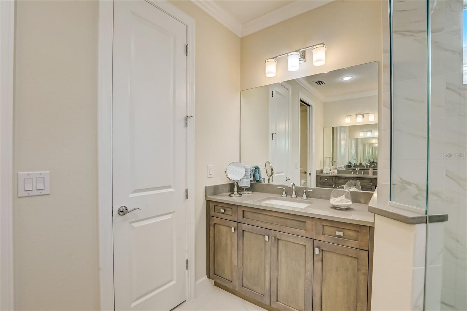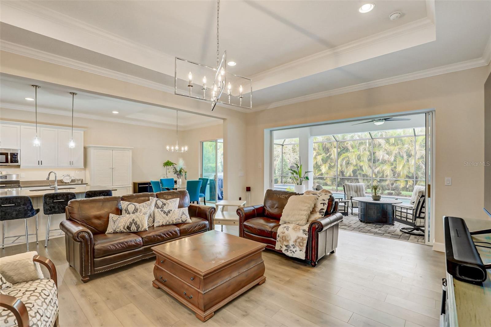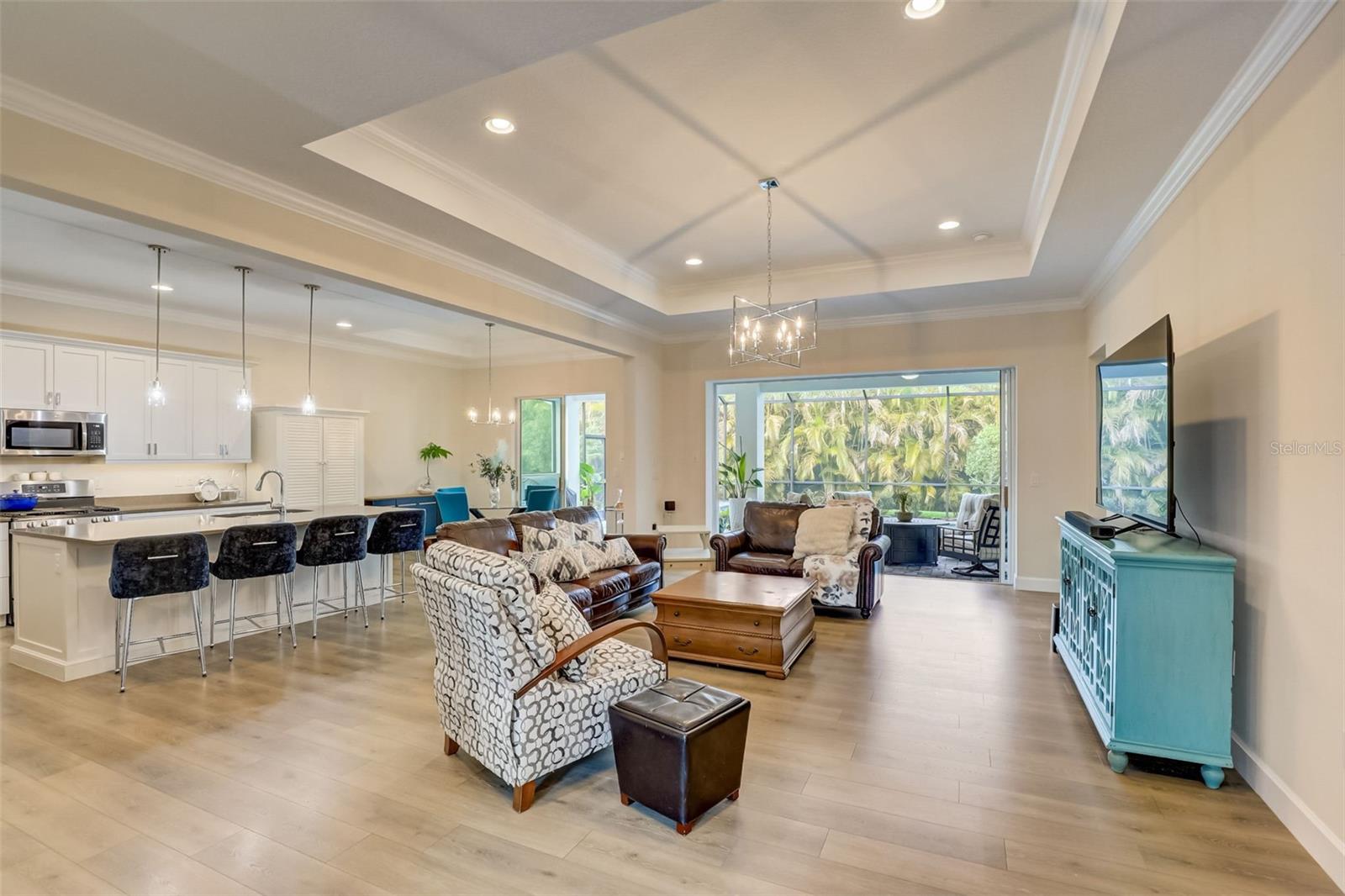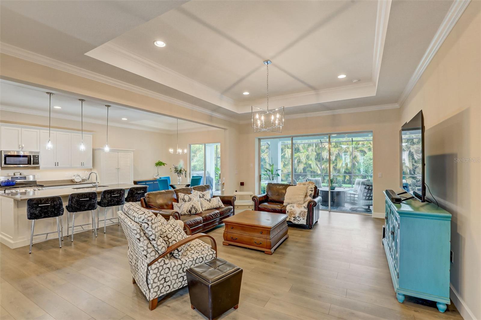 One or more photo(s) has been virtually staged. Welcome to your dream home! This stunning Magnolia designer model, quality built by the esteemed luxury builder Heritage Builders, offers an impressive 3 bedrooms, 3 bathrooms, and a versatile den, all within a spacious 2,600 square feet of expertly crafted living space. Ideal for multi-generational living, this home features two separate garages; one accommodating a single car and the other providing room for two, ensuring ample parking and convenience.Step inside to discover an award-winning open floor plan enhanced by soaring 12-foot ceilings and an abundance of natural light. Elegant laminated flooring and crown molding create a welcoming ambiance throughout. The gourmet kitchen is a chef's delight, featuring brand-new quartz countertops, a gas stove, custom cabinetry, and a walk-in pantry.Entertain effortlessly as the dining area opens directly to your heated saltwater pool and spa, beautifully illuminated by new pool lights and surrounded by lush landscaping for maximum privacy. The main bedroom offers direct pool access, a stylish tray ceiling, and two spacious custom walk-in closets. The spa-like en suite bathroom features porcelain tile and a generous shower for a truly indulgent experience.Outdoor entertaining is a breeze with the pre-plumbed area ready for your dream outdoor kitchen. This exquisite home also includes a new refrigerator, new garbage disposal, and a one-year home warranty for your peace of mind.Conveniently located just minutes from fantastic dining, premier golf courses, and the breathtaking Siesta Key beach, this residence boasts low HOA fees that cover lawn maintenance and pest control, with no CDD fees. Plus, it's situated in a highly-rated school district, making it perfect for families.Don't miss out on this exceptional lifestyle in a welcoming gated community; check out the attached Upgrades/Features Sheet for more details! Experience comfortable living at its finest today!