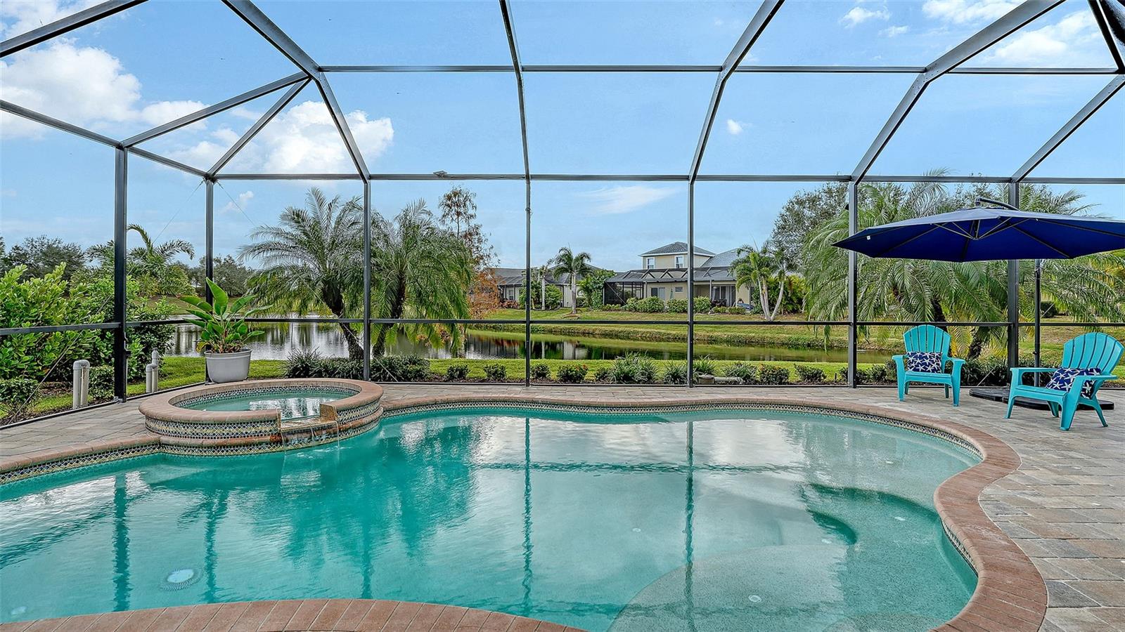 This 3 bedroom, 3 full bath home includes an oversized den/office, a gas heated pool and spa, water view, and tastefully stunning upgrades. The kitchen features 42" cabinetry, quartz countertops, a tile backsplash, a single basin undermount sink, oversized drawers, stainless steel appliances, a breakfast nook, and double glass French doors to the lanai. Interior features include tray ceilings, quartz countertops throughout, and LVP flooring in the guest bedrooms. The primary bedroom offers a tray ceiling, shiplap half walls, plantation shutters, access door to the lanai, and two custom walk in closets, and the ensuite bath includes shiplap accent walls, a chandelier, an oversized shower, a garden bath, and dual split vanities. The oversized den/office features bamboo flooring, a built in desk and cabinets, transom windows, a slider leading to the lanai, board and batten accent half walls, and a water view. The pool bath is located right off the pool and includes a shiplap accent wall, with the lanai entrance directly across from the pool bath. The laundry room is customized with two rows of upper cabinets and a linen closet. Exterior features include a front porch, a pavered lanai, exterior surge protetor, and gas-heated pool and spa with water view. ***HOA COVERS: Gated Community, Community Manager, Common Grounds Maintenance Trimming & Irrigation, Park & Pavilion, 2 Dog Parks, Playground & Splash Pad, Tennis Courts that sub as Pickleball Courts, and Sports Fields. ***LOCATION: Centrally located. Just outside the gates are A+ schools, Gullett Elementary, Lakewood Ranch High School, and Mona Jain Middle School, LECOM, & Manatee Tech East Campus. Minutes to shopping, restaurants, gyms, salons, bars, etc. Minutes to downtown, Sarasota International Airport, the top rated beaches in the country, UTC Shopping.