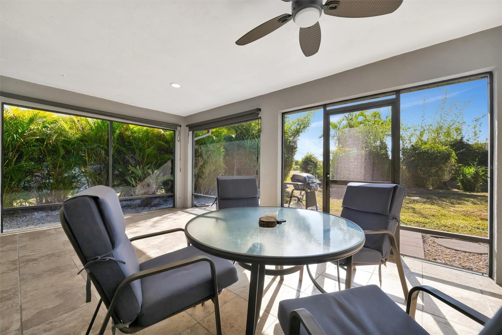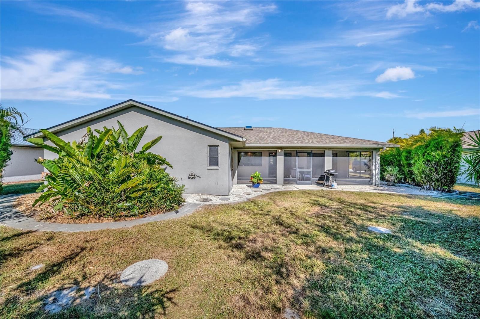 This beautifully maintained 3-bed, 2-bath single family home offers 1,680 sq. ft. of comfortable living space in the sought-after deed-restricted community of Deep Creek, located in desirable Punta Gorda and being offered partially furnish. As you arrive, you'll be greeted by freshly painted exterior and mature landscaping, with the home backing to a greenbelt for added privacy. The well-designed layout features a split bedroom plan, spacious family room, and an inviting family room/dining combo ideal for everyday living and entertaining. The primary suite is thoughtfully positioned on the opposite side of the home, boasting a sliding glass door that leads to the covered lanai, walk-in closet, and a private ensuite with dual vanities and a tiled shower. Two additional bedrooms share a second full bath, offering flexibility for guests, a home office, or hobby space. Upgrades & features include:Room for a pool if desired, newer roof, Granite kitchen counters with tile backsplash, ceiling fans in every room & custom built-ins, large lanai with sunshades . perfect for relaxing or entertaining outdoors and 2-car garage with workshop space + washer/dryer included. Don't miss your chance to own this comfortable and well-appointed home in a great neighborhood. Perfect as a year-round residence or seasonal getaway! #JustAnotherDayInParadise