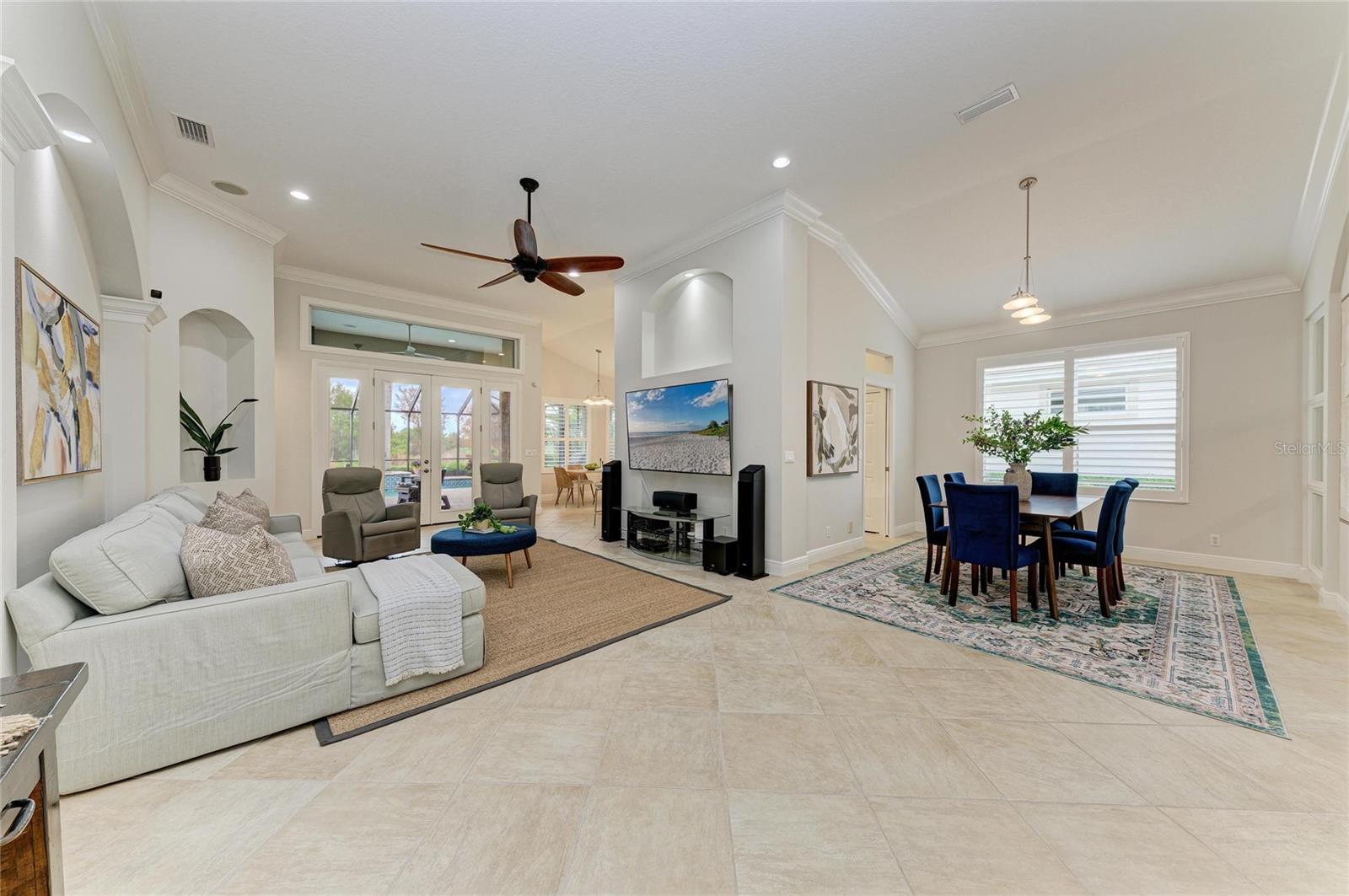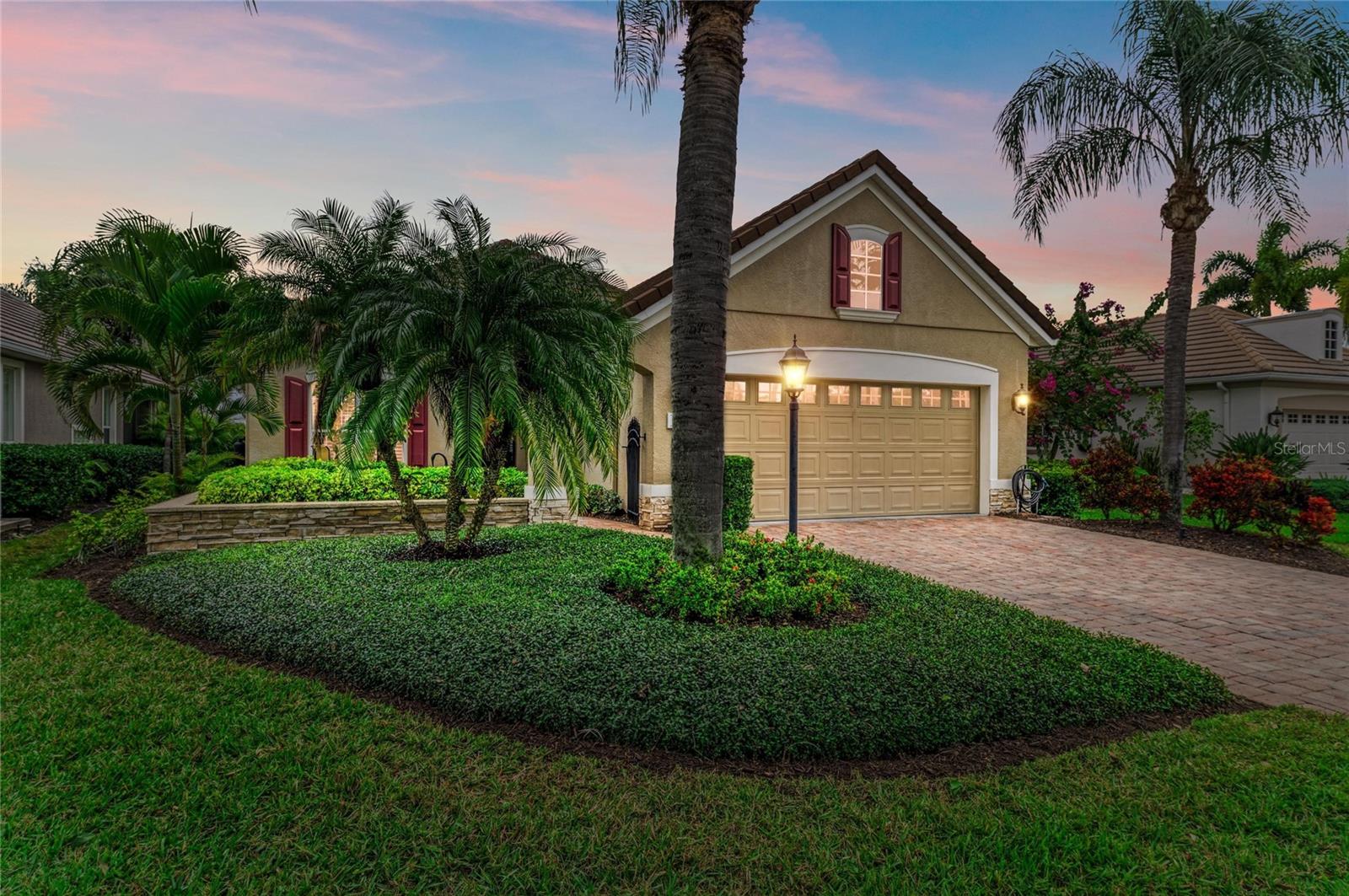 Perfectly positioned at the end of a quiet cul-de-sac, this beautifully updated pool and spa home sits on one of the most coveted lots in Lakewood Ranch Country Club, offering preserve, water, and Kings Dune golf course views. Located in Stone Ridge, one of the closest neighborhoods to the Country Club and golfing amenities, is sought-after due to the proximity. Designed by Neal Communities, the popular Burgundy floor plan showcases a rare, expansive open-air courtyard with a surrounding wall, leading to a beautiful French glass entry door. Inside, a gracious foyer opens to a light-filled Great Room features architectural detailing, soaring 12-foot ceilings, diagonal tile flooring, and transom window above the double glass lanai doors, seamlessly connecting indoor and outdoor living. Formal and casual dining spaces off the kitchen are enhanced by plantation shutters and Lutron lighting, creating an elegant ambiance. The chef's kitchen, beautifully updated in 2022, is a standout feature showcasing Calcutta Tuscany quartz countertops, custom-painted cabinetry topped with crown molding, and an illuminated glass-front upper cabinet that adds both sophistication and warmth. This refined space features a granite composite sink, glass tile backsplash, gas cooking stove, and stainless steel appliances, including several newer additions. A central vacuum system with an automatic toe-kick dustpan offers effortless convenience. The primary suite is a serene retreat featuring lanai access, a generous sitting area, custom built-in closets with no carpeting, and a lovely en-suite bath with dual vanities, a soaking tub, and a zero-entry walk-in shower. The two guest bedrooms are thoughtfully tucked behind a pocket door, creating a private wing with a shared bath, ideal for guests or family. Outdoor living truly shines with saltwater, gas-heated pool and spa with water feature, outdoor shower, and a rescreened lanai. The lanai is thoughtfully designed with two separate areas, an open space for enjoying the views and a covered entertaining area featuring ceiling speakers and a pre-wired gas line. The well-appointed laundry room offers upper cabinetry, a built-in sink, hanging rack and a top loading washer and dryer. Additional highlights include a whole-house surge protector, retractable screen doors at the front entry and lanai, a sealed roof with transferable warranty (2023), Rinnai recirculating tankless water heater (2023), Kinetico water softener and filtration system (2022), and Trane HVAC with warranty (2019). The extended garage provides space for a golf cart or additional storage and includes attic access with a pull-down ladder and shelving. Country Club membership is optional, with a variety of social, athletic, and golf memberships available, offering access to four championship golf courses, elegant clubhouses, a full-service athletic center, lap pool, fitness facilities, and a vibrant tennis and pickleball community with no wait list. Just minutes from Waterside Place, Lakewood Ranch Main Street, UTC shopping and dining, the Sarasota Polo Club, SRQ Airport, and the world-renowned Gulf Coast beaches. Low HOA fee includes lawn maintenance as an added benefit to this rare opportunity to experience the very best of Florida living.