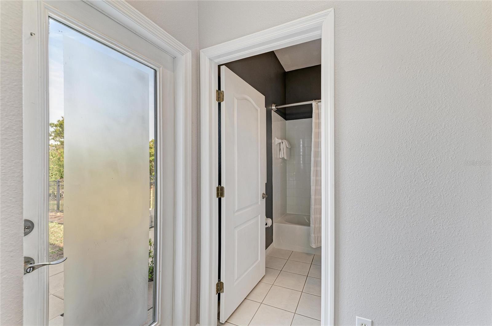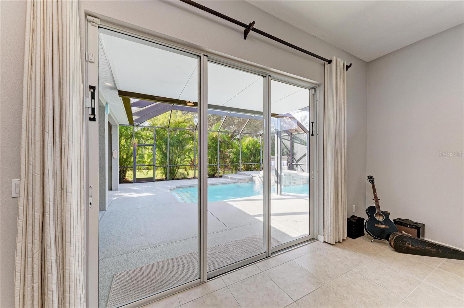 Exterior: French Doors, Rain Gutters, Sidewalk, Sliding Doors