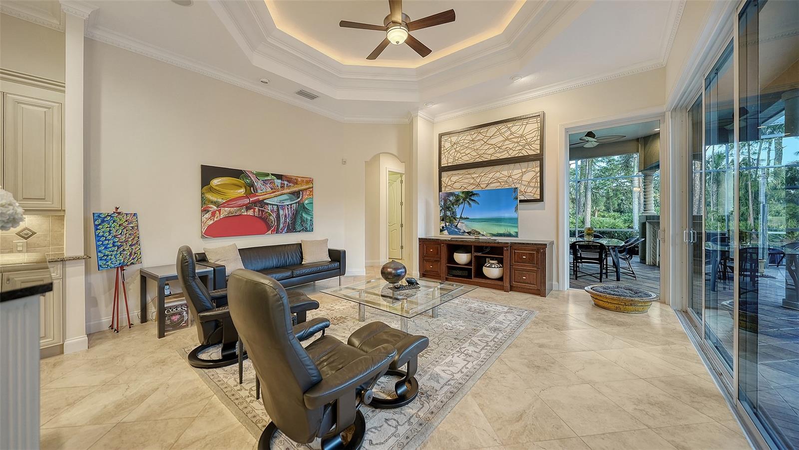 Perfectly positioned on a boulevard and a south-east facing premium homesite capturing perfect views of the 4th fairway in the heart of prestigious Grosvenor Gardens in University Park Country Club. Exceptional custom estate-style home expertly built by Todd Johnston showcasing superior construction, thoughtful design and upgraded finishes throughout. A striking entry greets owners and guests with a stone paver driveway and side-load motor court leading to a 3-car garage plus dedicated golf cart garage. Architectural details throughout, starting at the front with double wood / leaded glass doors. The spaces feature volume and double step ceilings, enhanced crown molding and baseboards, 8' solid wood doors, upgraded hardware, and abundant recessed lighting. Hard-surface flooring throughout: hardwood and 18" x 18" porcelain tile. A gracious living room features a gas fireplace with coral stone surround, illuminated built-in cabinetry, and expansive stacked sliding glass doors opening to the pool/lanai. A formal dining room with butler's pantry closet and dry bar sits adjacent to the kitchen, creating an ideal layout for entertaining. The gourmet eat-in kitchen is anchored by an oversized 11-ft island and showcases plenty of organized storage, custom two-tone cabinetry complemented by two-tone granite countertops and premium stainless-steel appliances: Wolf 6-burner gas range, convection oven, Sub-Zero refrigerator, 2 Asko dishwashers, and GE Monogram wine cooler. Seamlessly flowing into the family room with stacked sliding glass doors connecting to the outdoor living areas. The spacious primary suite is a serene retreat with a spa-like bath featuring marble floors, split vanities, oversized walk-in shower, jetted soaking tub, and two custom walk-in closets. Overlooking long views of the greens and fairway, a large private office with custom wood cabinetry and desk provides an ideal work-from-home space. The split plan ensures privacy with two additional first-floor en-suite guest bedrooms with custom closets and a well-placed, stylish powder room. A thoughtfully designed butler's corridor with extra refrigerator and built-in cabinetry leads to a spacious laundry room, enhancing everyday living and entertaining. The second level offers a versatile bonus room with wet bar and balcony, plus a substantial fourth bedroom with a custom walk-in closet and full bath. A perfect sanctuary for guests or multi-generational living. The home is perfect for seamless indoor-outdoor living, with an expansive screened lanai featuring a stone paver deck, outdoor kitchen with GE Monogram gas grill, gas fireplace with stone surround, and ample covered areas for alfresco entertaining. A heated pool and spa, complete with sun shelf and spillover, and new pool pump (2026) create a true resort-style retreat. While broad and open golf course views are the focal point, the home is set back from the fairway and the cart path is on the far side, offering optimal privacy. Residents of University Park Country Club enjoy a sought-after lifestyle, featuring 27 holes of championship golf, fine dining, tennis, pickleball, croquet, state-of-the-art fitness center, and an all-inclusive social calendar. Ideally located near UTC and a short drive to downtown Sarasota, world-class beaches, shopping, dining, entertainment, SRQ International Airport, and I-75, this extraordinary residence offers the very best of Florida's Gulf Coast living.