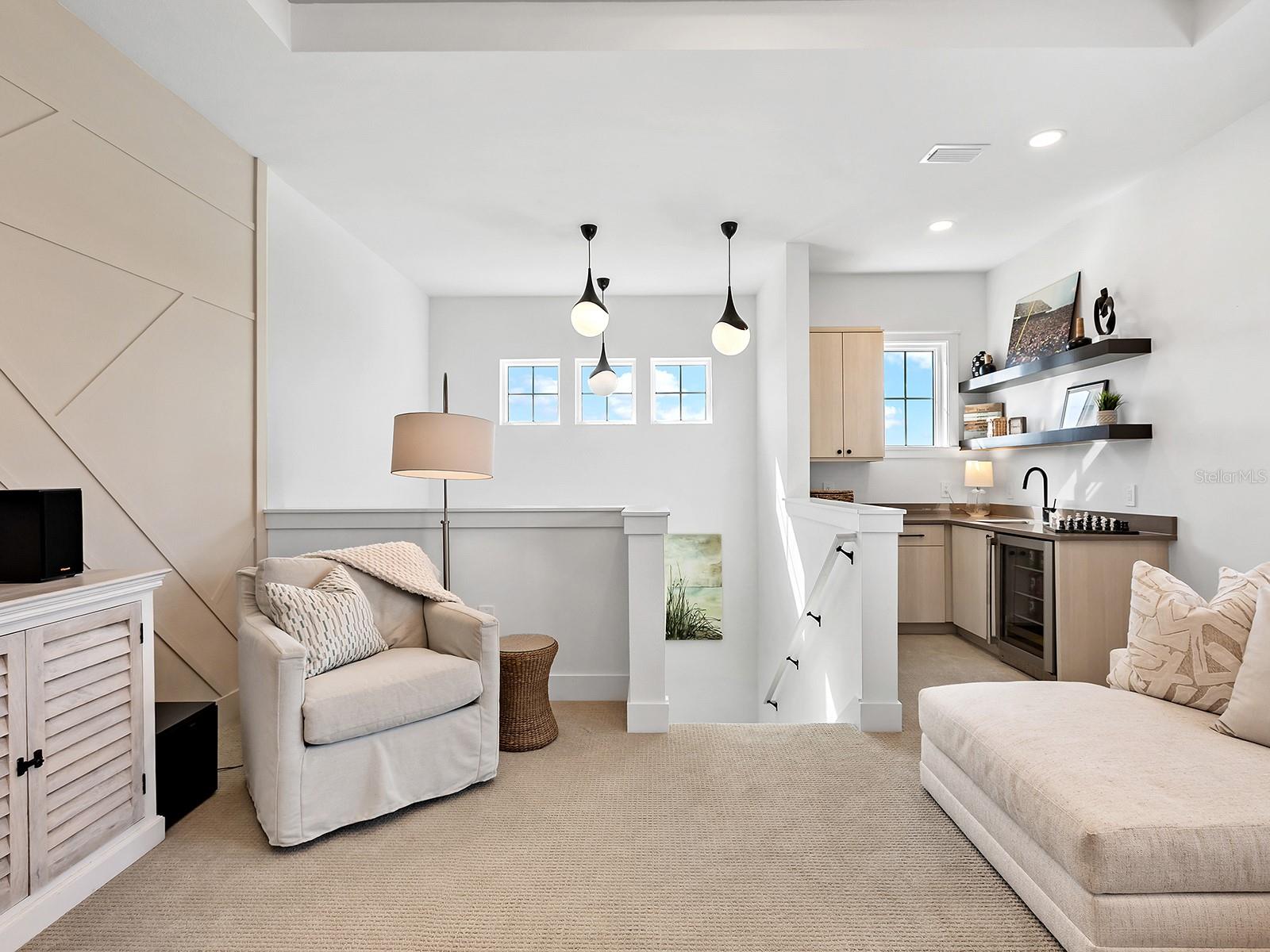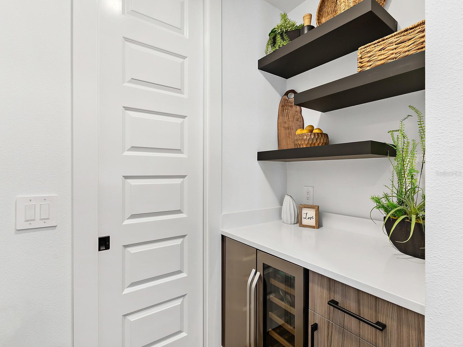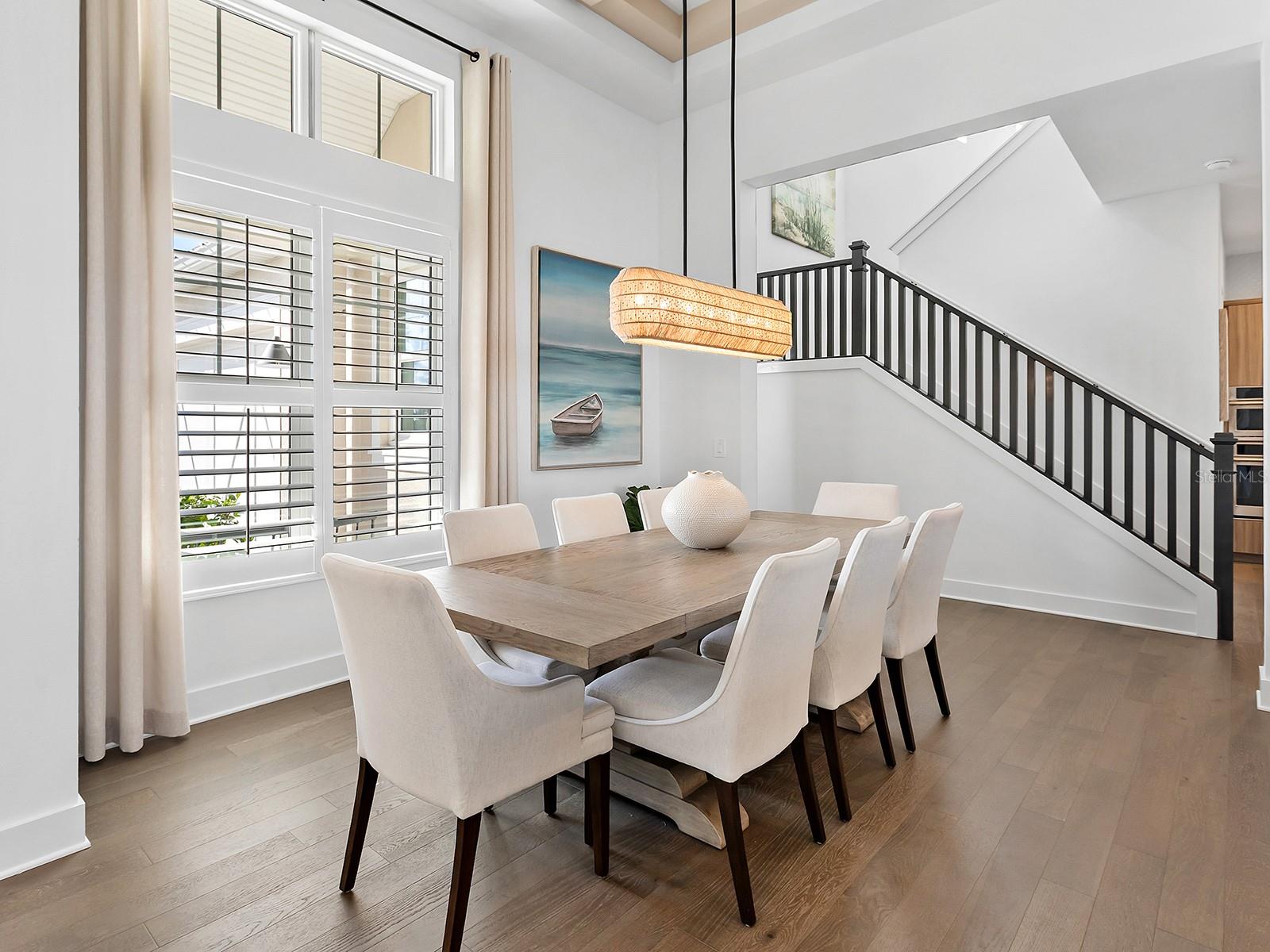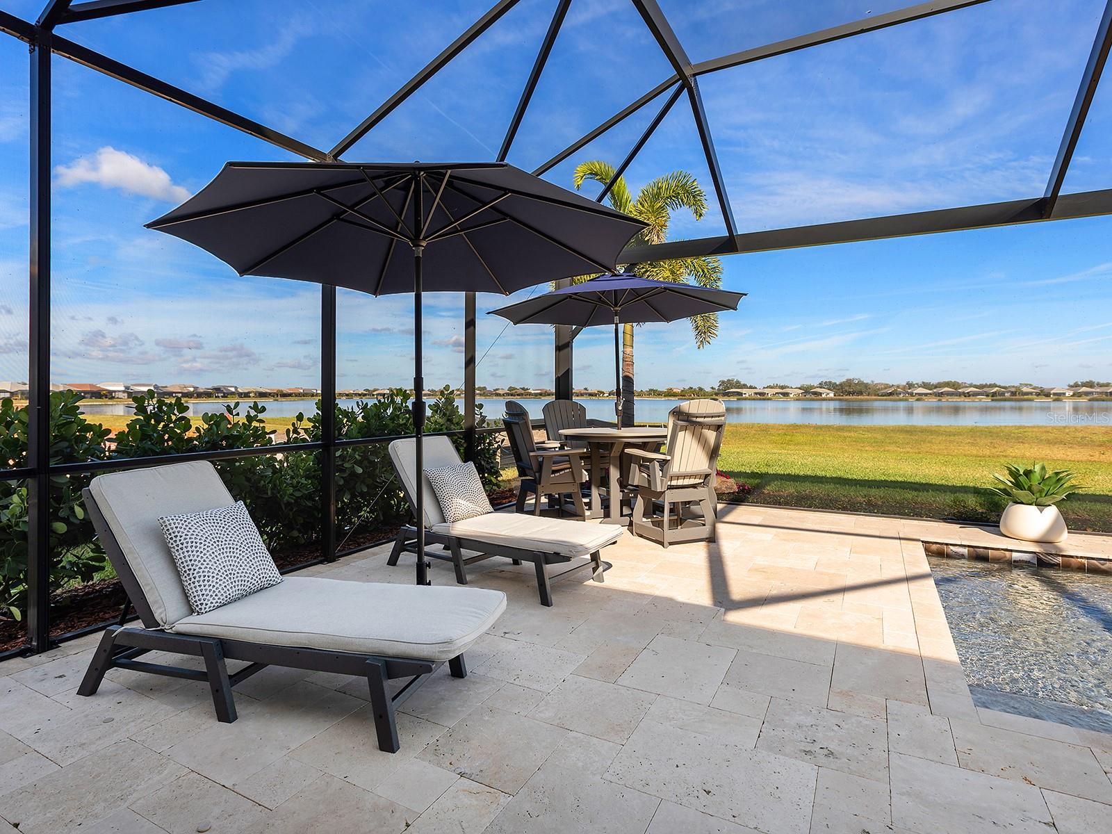 Elegant former model home filled with resplendent upgrades on a lakeside setting could be yours! This 2023 built model home offers every upgrade available on a premium homesite on Lake Ibis in Lakehouse Cove, just minutes from Waterside. This home's 3,500 SF is brimming with luxurious upgrades and modern style including engineered hardwood flooring, custom coffered ceilings, feature walls, designer light fixtures, 2025 window shades and plantation shutters, and a warm blend of textures and colors throughout. From the charming front porch you're welcomed home with instant views of the lake from 9' impact sliding glass doors. The central great room is the perfect place to gather, centered on a spectacular custom feature wall with fireplace, glass display shelving, and custom wood entertainment niche design. The adjacent formal dining room is flexible for upscale dinners to casual weeknights. Entertaining outdoors is just as delightful on the travertine lanai with views of Lake Ibis through the panoramic screen enclosure and surrounded by 2025 upgraded landscaping, covered entertaining area with ceiling fan, and 2025 outdoor kitchen including stainless steel Bull bar fridge and 30" grill. The heated pool and spa is the ideal place to take the northern views over the lake, and also includes water features, sunshelf, and 360 degree spill edge on the spa. Inside, chef's will love the modern design of the kitchen with warm wood textured cabinetry on the perimeter and smart espresso cabinets on the island, counter-to-ceiling white beveled backsplash, large modern pendant lights, quartz counters, 2025 reverse osmosis system, and a stainless steel appliance suite by GE Monogram including a range with oven and gas burners, additional wall oven, microwave, refrigerator, and dishwasher. Extra storage is found in the custom butler's pantry with wine refrigerator, coffee area, and floating shelving that's connected to the spacious walk-in pantry with custom shelving. Even working from home is a joy at this residence with a lakeside rear study featuring frosted glass barn door for privacy, tray ceiling with uplighting, and impact sliders to the lanai. The nearby powder bathroom doubles as both a pool bath and a guest bath for even more functionality. The upscale custom finishes carry into the primary suite with coffered and shiplap ceiling, shiplap and mirrored feature wall, impact sliders with sparkling lake views, and dual walk-in closets. The spa-like en-suite bath showcases dual split floating vanities, designer wallpaper, and an oversized walk-in shower with multiple showerheads and frameless glass enclosure. Guests have the ultimate choices in privacy, with one guest bed with en-suite bath on the main level, and a second guest bedroom with adjacent bath on the upper level. Also on the upper level is the ultimate bonus room featuring a custom wet bar with wine refrigerator and floating shelves, custom ceiling, and custom designed feature wall. Additional spaces include a laundry with lots of cabinetry, mudroom entry, and 3-car side-loading garage. Peace of mind is ensured with impact windows and doors, 2025 Generac 24kw whole-house generator, and 2025 Generac surge protection. Lakehouse Cove offers the best amenities in Waterside with an upscale clubhouse, lakeside pool and spa, fitness center, playground, dog park, walking trails, tennis and pickleball courts, dock house for lake access and kayak storage.