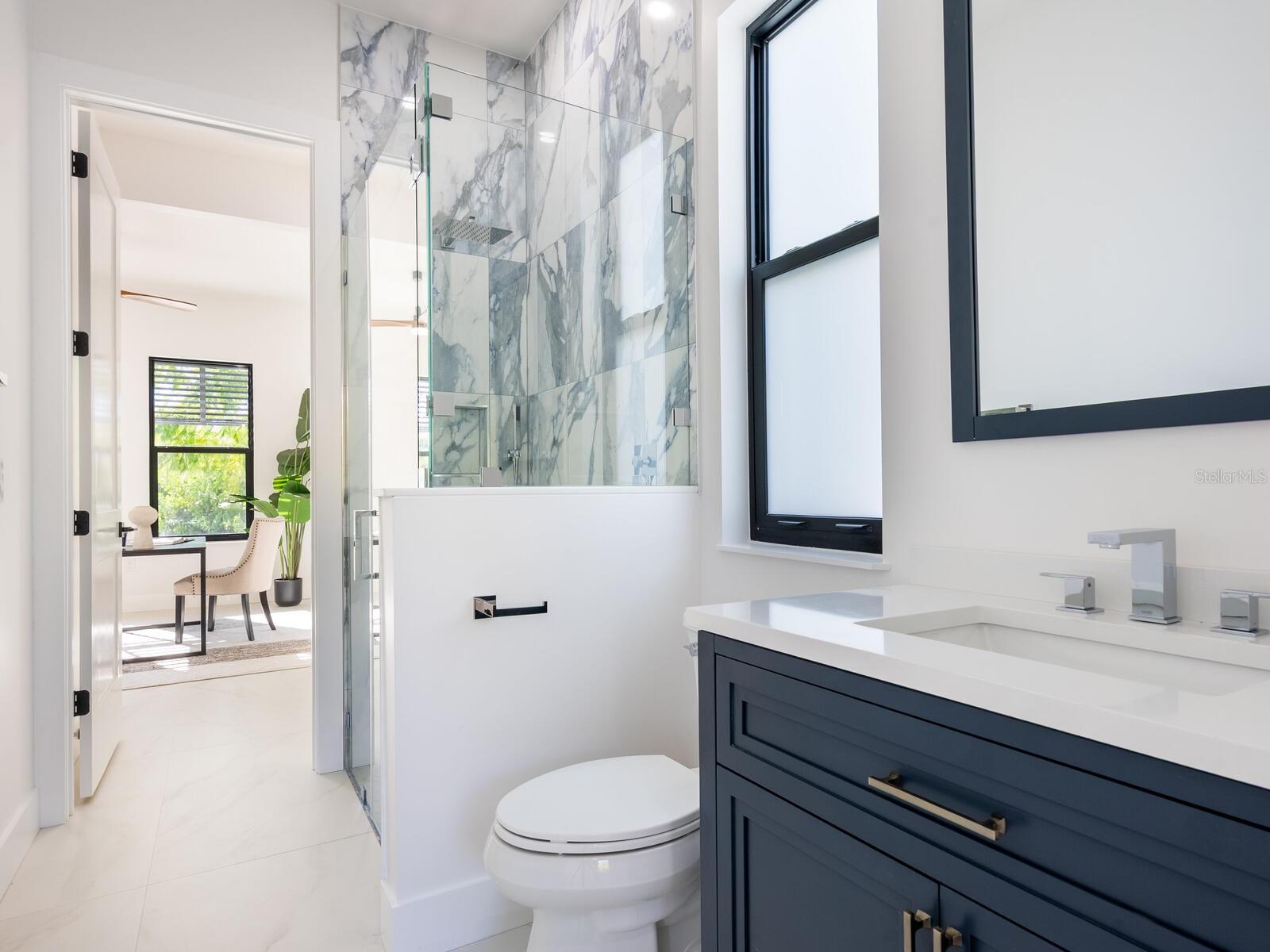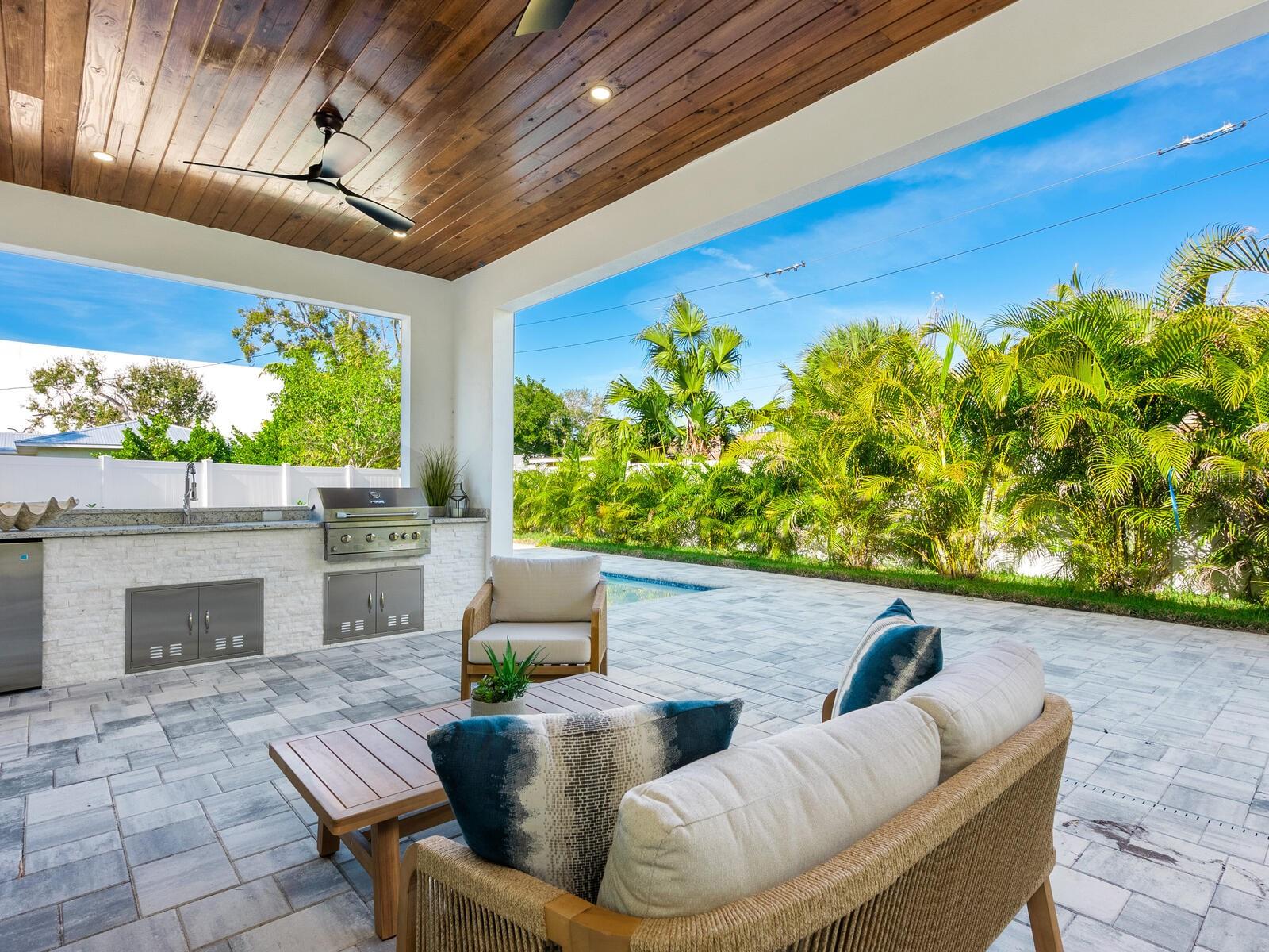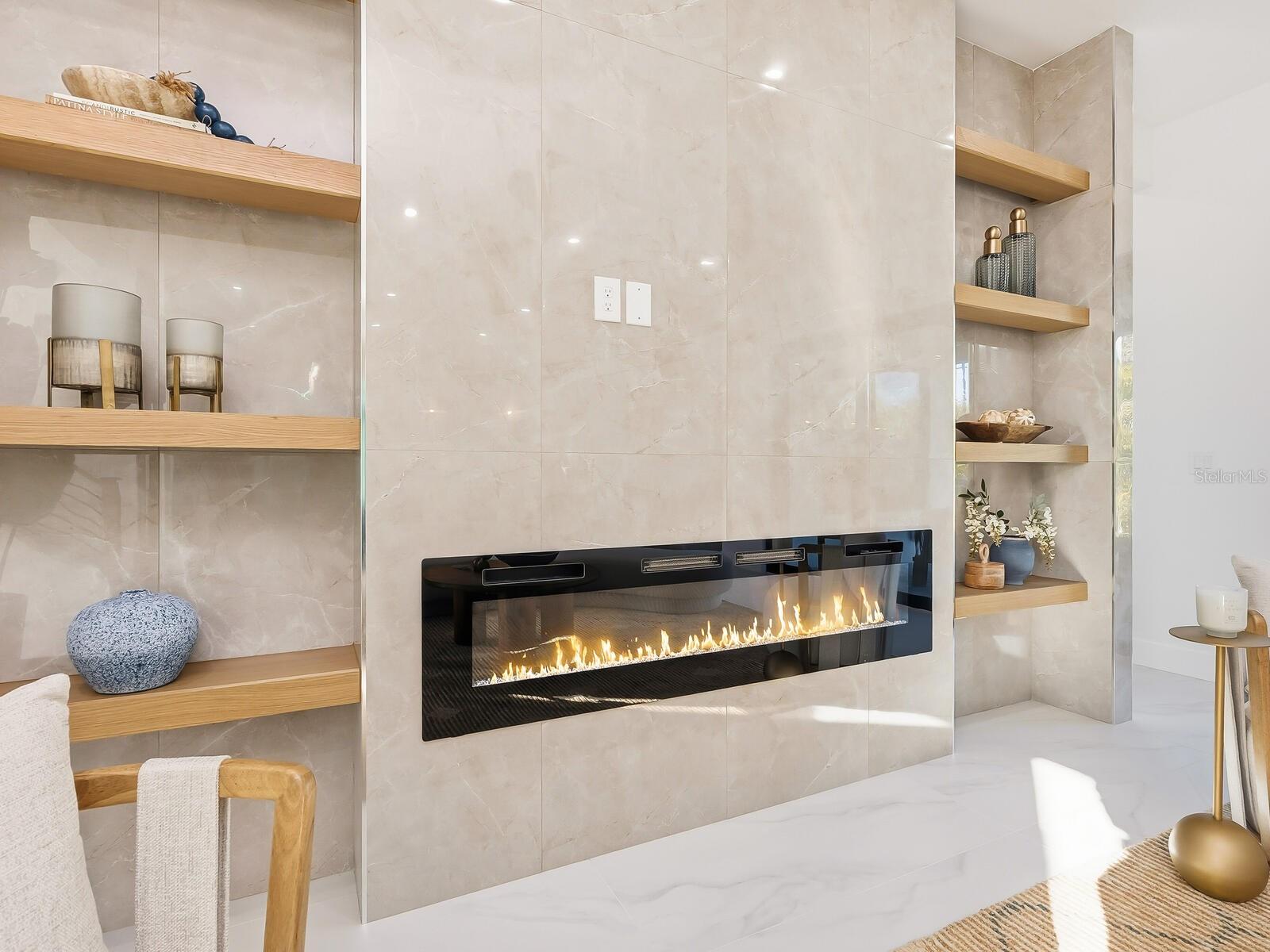 In the well-established Loma Linda Park neighborhood in Sarasota, this new construction, Divald Homes custom-built two-story home offers a blend of modern design and traditional elements. The home is ideally near downtown Sarasota, Siesta Key and Sarasota Memorial Hospital, with no deed restrictions or HOA fees. The home features four bedrooms and three baths, including a spacious primary suite on the main floor. The open-concept floor plan featuring a 24-by-48-inch modern floor tile throughout, hurricane impact sliding doors and windows offers a light-filled welcoming space ideal for entertaining. The main floor includes a gourmet kitchen, dining area, living room, private den/bedroom 4, primary suite with an ensuite bath and a dedicated laundry room. The chef's kitchen is a centerpiece, showcasing Bosch appliances, an oversized island with waterfall quartz countertop, and custom floor-to-ceiling full-overlay cabinetry in a beautiful honey-stained wood tone. The living room is highlighted by a striking tile accent wall with custom wood shelving and modern designed 42-inch linear electric fireplace. The living room opens seamlessly to the lanai, complete with an outdoor kitchen, including a gas grill, refrigerator and sink. You will also enjoy the pool with sundeck, oversized outdoor patio and a beautiful backyard with lush native plantings. A convenient pool bath offers direct access from the lanai and the private den. The dining area is elegant and inviting, featuring a statement iron chandelier and a wall of windows overlooking the backyard. Just off the kitchen, the main-floor primary suite serves as a private retreat with a luxurious en-suite bath featuring a marble stone accent wall, a large walk-in shower with seamless glass enclosure, a sculptural slipper tub, double vanity with quartz countertops, natural wood cabinetry, LED mirrors and a spacious walk-in closet with custom built-ins. The laundry room is conveniently near the oversized two-car garage with 12-foot ceilings, large windows for natural light and direct access to the side yard. Upstairs, an ornate wrought-iron and hardwood staircase leads to two additional bedrooms, a beautifully finished guest bath and a versatile flex room ideal for a game room, study or guest accommodations. This thoughtfully designed home offers refined finishes, flexible living spaces and an exceptional location, ideal for enjoying the Sarasota lifestyle.