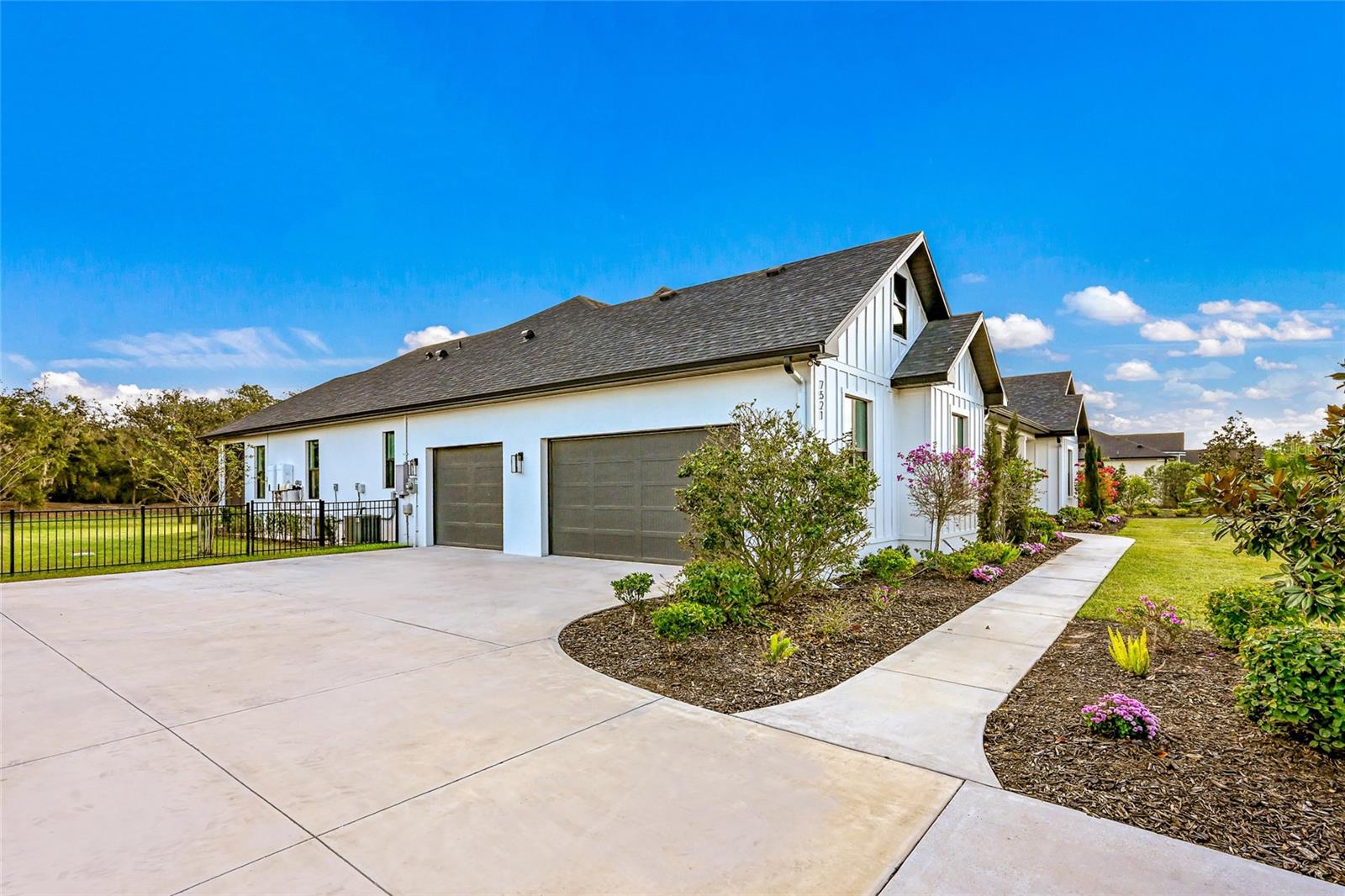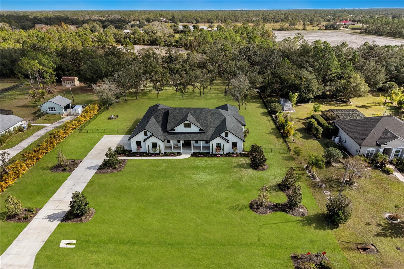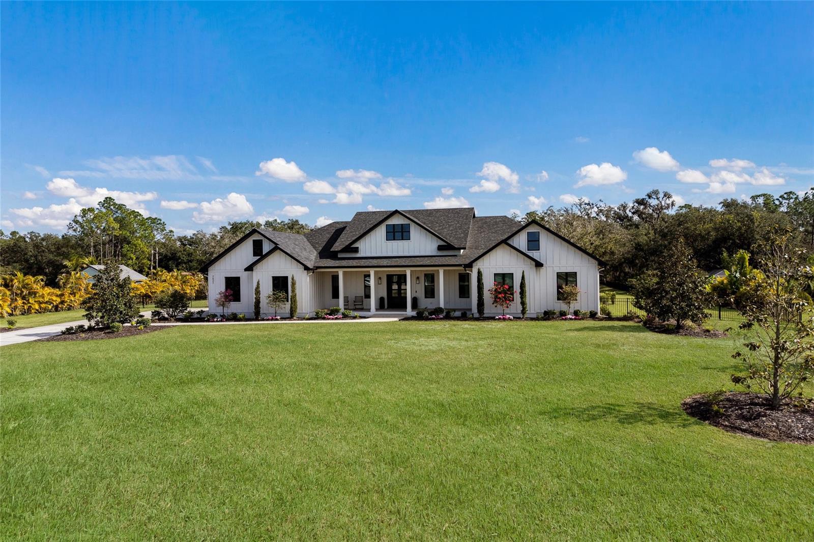 Welcome to Magnolia Oaks, a newly built modern farmhouse estate set on more than 1.7 acres of fully fenced, picturesque grounds in the heart of Lakewood Ranch. Framed by majestic oak trees and expansive open skies, this exceptional property offers a rare blend of space, privacy, and refined craftsmanship--an inspired blank canvas for elevated living. Spanning over 3,900 square feet, the thoughtfully designed residence features four bedrooms, four full baths, a private office, and a versatile bonus room, all wrapped in timeless farmhouse elegance. Soaring 12-foot ceilings grace the main living areas, enhancing the expansive open-concept floor plan with an abundance of natural light and an inviting atmosphere ideal for both everyday living and entertaining. At the heart of the home, the chef's kitchen is a true showpiece--equipped with a professional-grade cooktop, dual ovens, oversized refrigerator, elegant walk-in pantry, and a stunning oversized island with sink, perfectly designed for gatherings, conversation, and culinary creativity. Designed for both beauty and peace of mind, the home is outfitted with impact-rated windows and sliding glass doors throughout, and is further enhanced by a whole-house generator, providing year-round security, comfort, and uninterrupted living. Indoor-outdoor living takes center stage with four inviting porches, including an extraordinary 1,000+ square-foot covered back lanai featuring a custom roll-up screening system for year-round enjoyment. Additional private porches extend from the primary suite and in-law suite, while the oversized front porch offers the perfect setting for sunset views and peaceful moments beneath the oaks. Each bedroom is designed as a private retreat, with three en-suite bedrooms providing exceptional comfort and privacy for family and guests. The flexible bonus room--currently utilized as a gym--can easily transition into an additional bedroom, nursery, office, or dream closet. A private in-law suite with its own porch offers independence and comfort, ideal for extended family or visitors. Completing the residence is an oversized 939-square-foot three-car garage, providing ample space for vehicles, storage, and hobbies. Outdoors, Magnolia Oaks truly comes alive. The beautifully landscaped grounds provide endless opportunities to roam, entertain, or simply relax in the shade of mature oak trees. The property also allows for the addition of a casita or guest house, creating exciting possibilities for future expansion. More than just a home, Magnolia Oaks is a lifestyle--a serene, private oasis where you can stretch out, breathe deeply, and create something truly special. This is modern farmhouse living at its finest.
