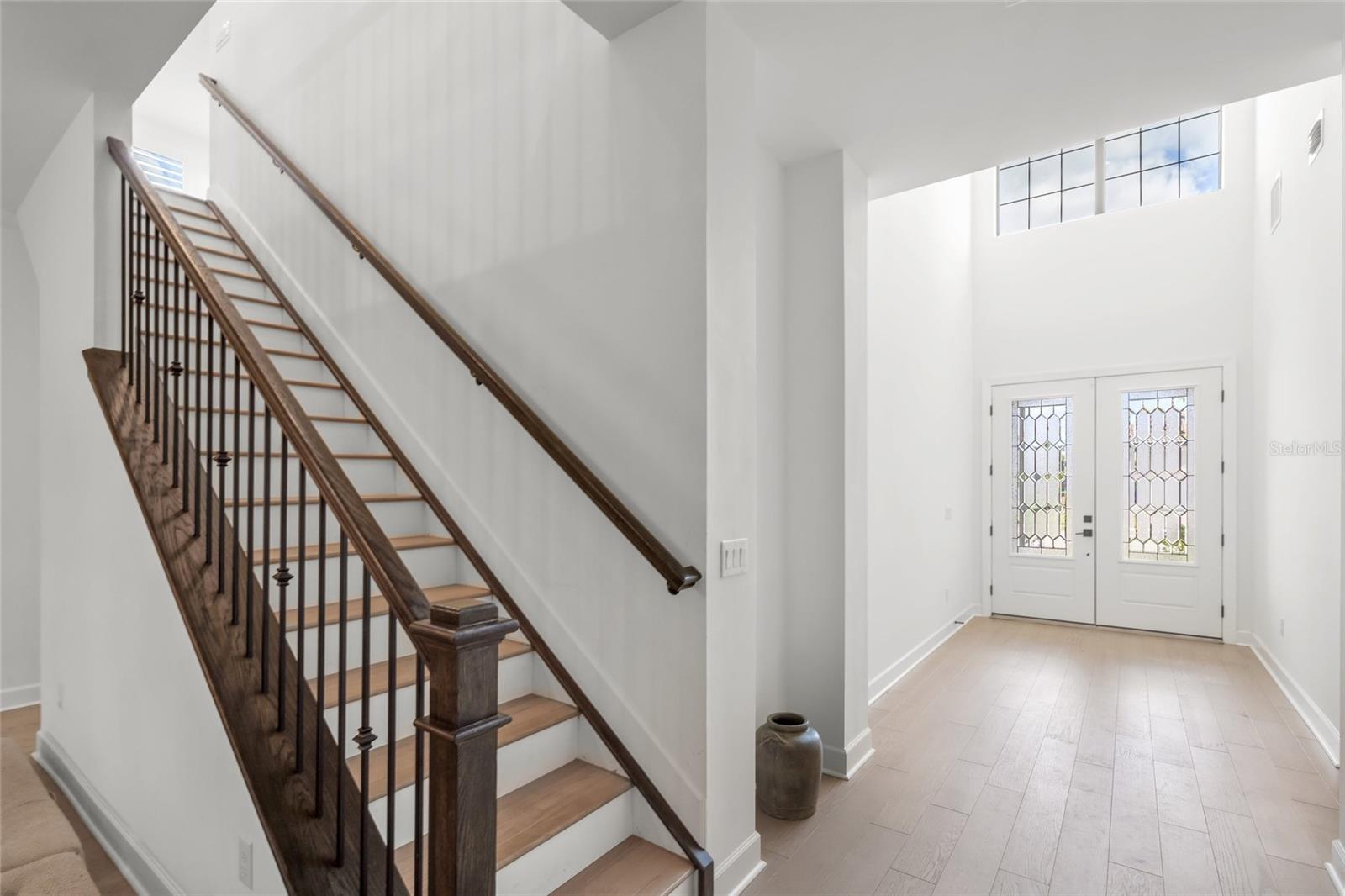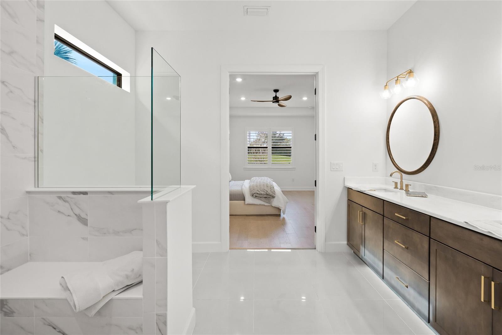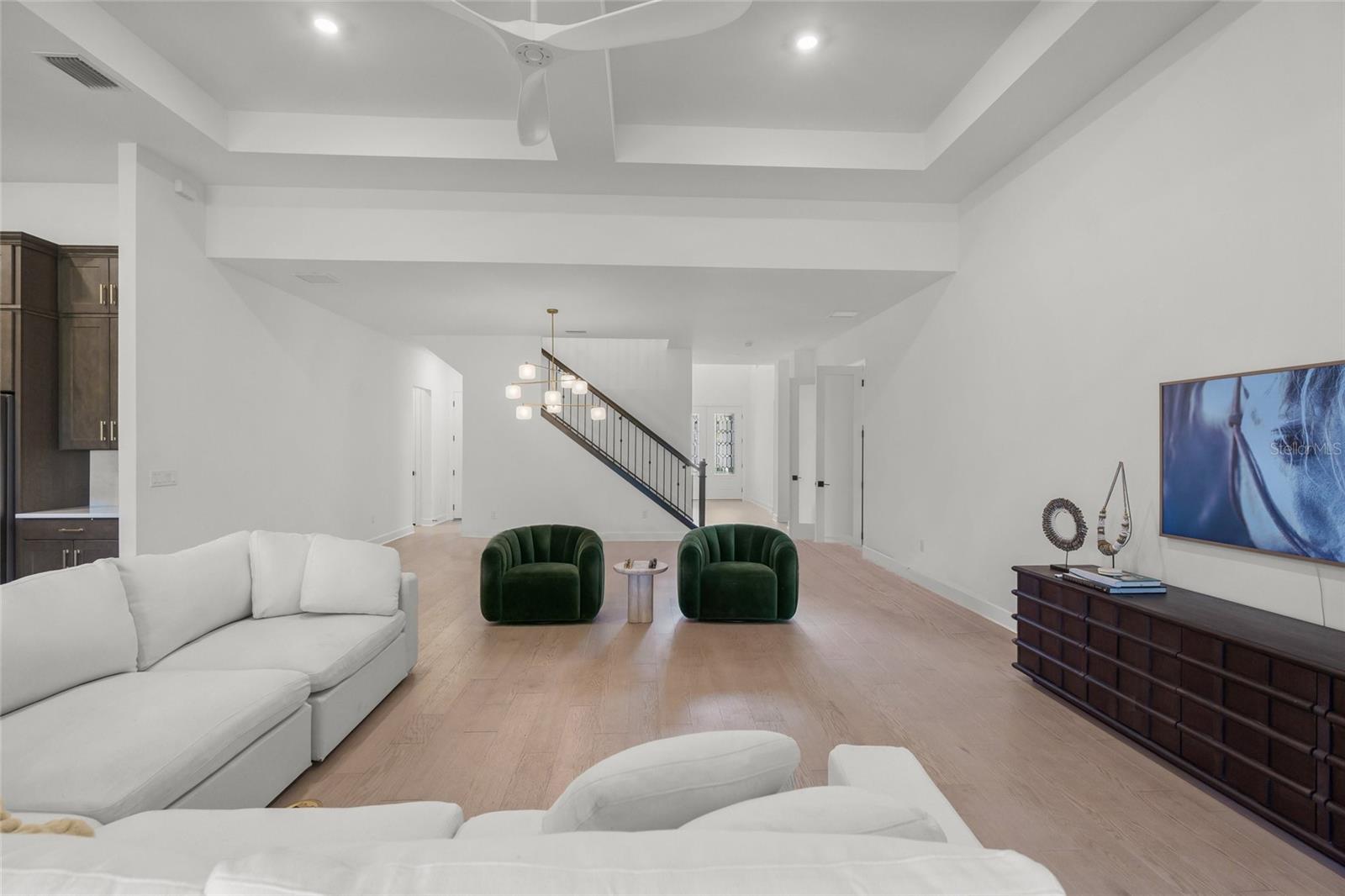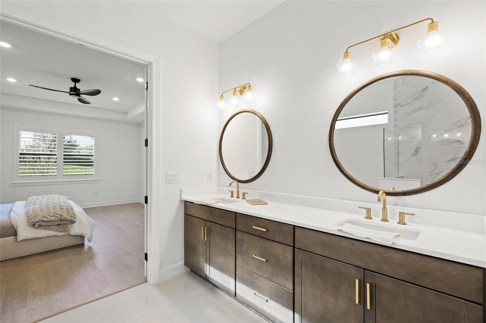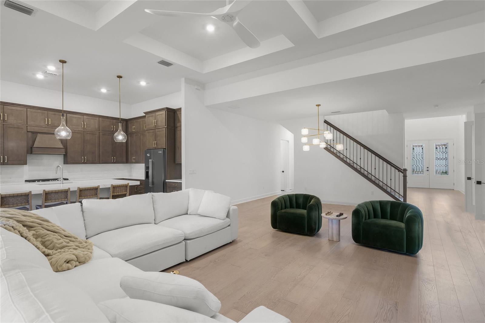 Set within the refined enclave of Shoreview at Lakewood Ranch Waterside, this extraordinary residence delivers a rare blend of contemporary sophistication, thoughtful design, and effortless luxury. Completed in 2024 (the newest home in the community) and spanning nearly 3,900 square feet, the home presents a striking architectural presence paired with interiors curated for elevated everyday living. With four generously sized bedrooms, four beautifully appointed baths, a private den, and a sprawling bonus room, the layout offers both flexibility and refinement for modern lifestyles.From the moment you arrive, the attention to detail is unmistakable. Double glass entry doors open to a dramatic foyer filled with natural light, soaring ceilings, and refined finishes that set the tone throughout. The main living level is anchored by engineered hardwood flooring and an expansive open-concept design that effortlessly connects the great room, dining area, and gourmet kitchen--creating a seamless flow ideal for entertaining on any scale. Impact-rated windows and doors provide peace of mind, while designer lighting and plantation shutters lend a polished, custom feel.At the heart of the home, the chef's kitchen is both stunning and functional, featuring double-stacked cabinetry, quartz countertops and backsplash, a built-in KitchenAid oven and microwave, gas cooktop, and an oversized walk-in pantry. A dramatic center island with mitered-edge detailing becomes a natural gathering space for casual meals or elegant entertaining. Walls of glass sliders extend the living area outdoors to a covered lanai overlooking tranquil water views--perfect for al fresco dining, sunset cocktails, or quiet moments of relaxation.The primary suite on the main level is a true retreat, offering serene views and a spa-inspired en suite bath with dual vanities accented by gold hardware, a spacious walk-in shower, and a custom-designed walk-in closet. Two additional main-level bedrooms with nearby baths provide comfort and privacy for guests or family, while a well-equipped laundry room with additional storage enhances daily convenience. Upstairs, a large bonus room, private bedroom, full bath, and storage closet create an ideal space for guests, a media lounge, or multi-generational living.Every detail has been elevated, from iron and wood stair railings to floor-to-ceiling tiled showers, marble countertops in select guest baths, custom mirrors, updated HVAC system and epoxy-coated garage flooring--ensuring this home feels both luxurious and impeccably finished.Residents of Shoreview enjoy a maintenance-free lifestyle complemented by resort-style amenities, including a stunning clubhouse, fitness center, sparkling pool, pickleball and tennis courts, kayak launch, and inviting social spaces. Just moments away, Waterside Place offers vibrant dining, boutique shopping, live music, weekly farmers markets, and community events. With effortless access to Lakewood Ranch and the cultural attractions, beaches, and dining of Sarasota, this is more than a home--it's a lifestyle defined by elegance, connection, and the luxury of having everything at your fingertips.