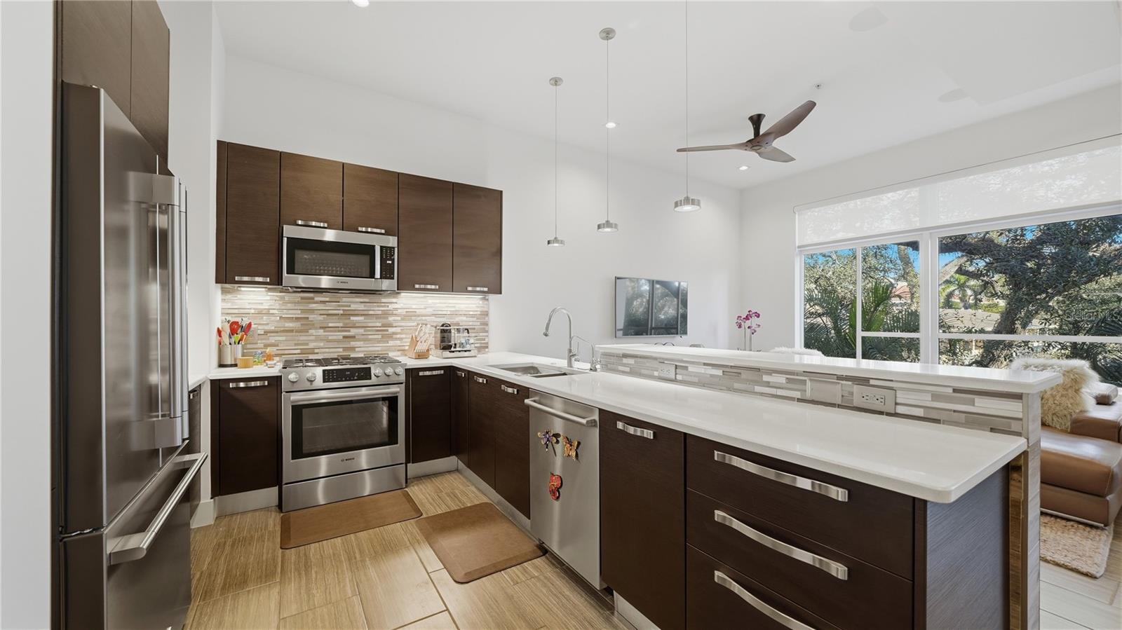 Amazing property and location! This Townhome is located between Osprey and Orange Avenues off of Ringling Blvd. in downtown Sarasota with 2 spacious bedrooms and 2.5 Baths. The Q is a unique enclave of 40 individually owned townhomes (not a condo). The moment you enter the front door, you will be mesmerized by the 13-foot-tall ceilings, the 8'-foot-tall solid wood Italian doors and a serene view through the foyer out the back door to historic Laurel Park. The downstairs area (11' x 10') is a great office space with large windows that could also work as a den. The second bedroom is conveniently located on the first floor and boasts both a walk-in closet and a double closet. This spacious second bedroom has an ensuite bathroom with a Lube single sink cabinet with quartz countertops and an oversized walk-in shower. Landry room is also, conveniently located on level one. On level 2, At the top of the stairs you are greeted by an amazing kitchen with Modern cabinets, quartz countertops and stainless-steel appliances. The glass tile backsplash and knee wall facing the living room are stylist and accessible, shimmering with light from the over-sized windows. The view from the upstairs living room and dining room is a scenic view of the treetops of historic Laurel Park. Step out onto the serene, private balcony where you feel like you're in the treetops. All windows are impact glass. The attached 2-car garage has spacious storage. The location is ideal. You are two blocks from the Saturday farmer's market and one block from amazing restaurants. If that's not enough, stroll to the theater, opera, or the marina. The Q is a very short ride or walk to the Legacy Trail connecting you from downtown to Venice. The free Breeze trolley runs every 30 minutes to takes you to St. Armand's Circle or out to Lido Beach. Buyers and/or Buyers Agent to verify all pertinent information, including room sizes, as they may be approximate. All Association information should be verified with Property Management Company or Association. Information deemed reliable but not guaranteed.