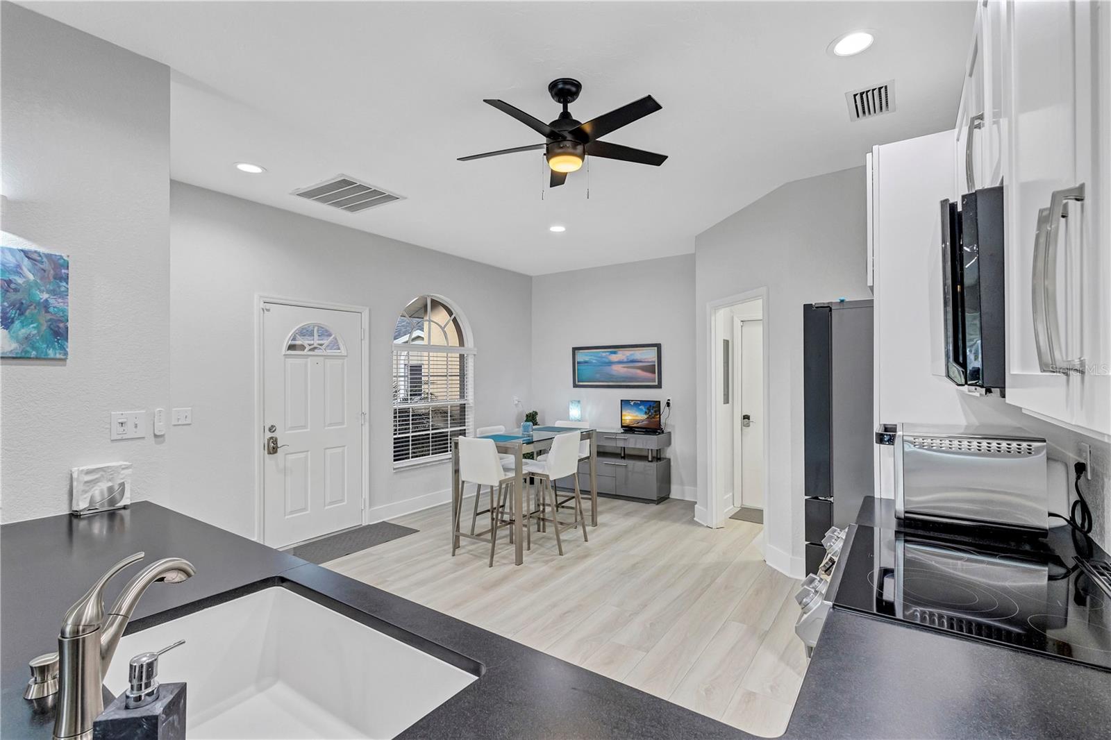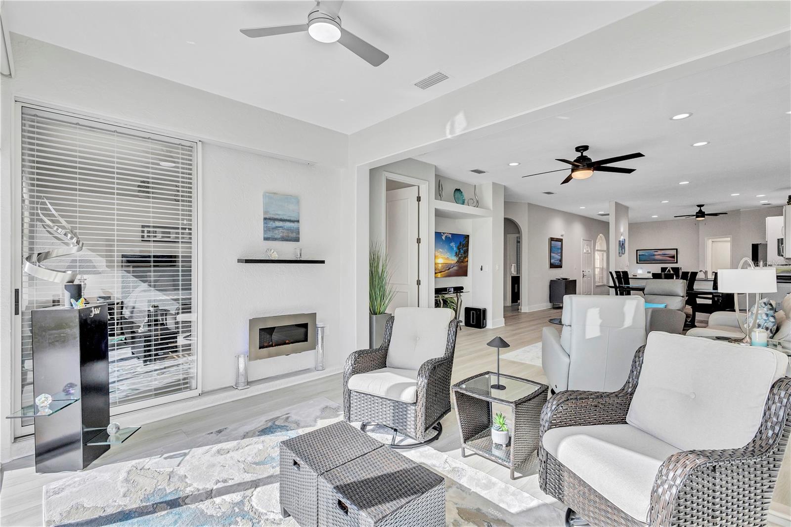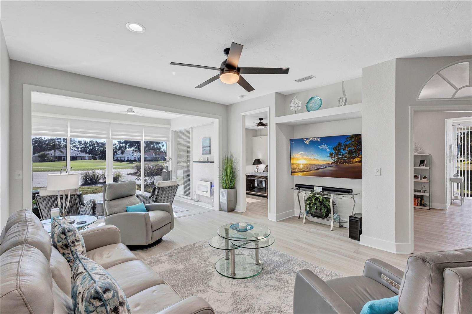 Stop! In the Name of Love, because you are going to love this maintenance-free Villa that has stunning golf course views and is perfectly positioned along a large tranquil lake in the Stoneywalk Association of TGCC. Walls have been taken down so you walk into an open floor plan flooded with natural light, Eat-in kitchen has been updated with newer cabinets, counters and Samsung appliances. Living room/Dining Room flows into an extended lanai area that has been glassed in with floor to ceiling sliders, screens, and power blinds.. Two bedrooms and a den. Den has additional niche with glass sliders, which overlook a private yard and views of the golf course. Primary bedroom is its own private sanctuary with extraordinary views, an en-suite updated bath with walk-in shower and walk-in closet. Split floor plan has the second bedroom in the front of the villa with a full remodeled bath with walk in shower. The home was remodeled in 2025 with new luxury vinyl plank flooring, all plumbing in the floor was removed and re-directed through the walls, new paint, new Hot water tank, new garage door opener, new pull down aluminum stairs to attic, new utility tub in garage, new faucets, and door handles throughout, new lighting in Primary closet and utility room. Two car attached garage, extra long driveway. Screened enclosure can be added to the back patio space (15 x 12) Located on the ninth hole of Tara Golf and Country Clubs Championship Private Golf course. Comes with a Class A membership, golf, tennis, full fitness center, bocce, Pickle Ball, clubhouse dining and endless activities, community pools. are all included in this full Florida active lifestyle. Stoneywalk Villas have a private community pool for the residents. New Pickle Ball facility, with 5 courts, is across the street from the Stoneywalk Villas. Tara Golf and Country Club is a private, bundled golf community in a fabulous location. Close to shopping, dining, highways, airports and the best beaches on the east coast of Florida, Welcome to Taradise!
