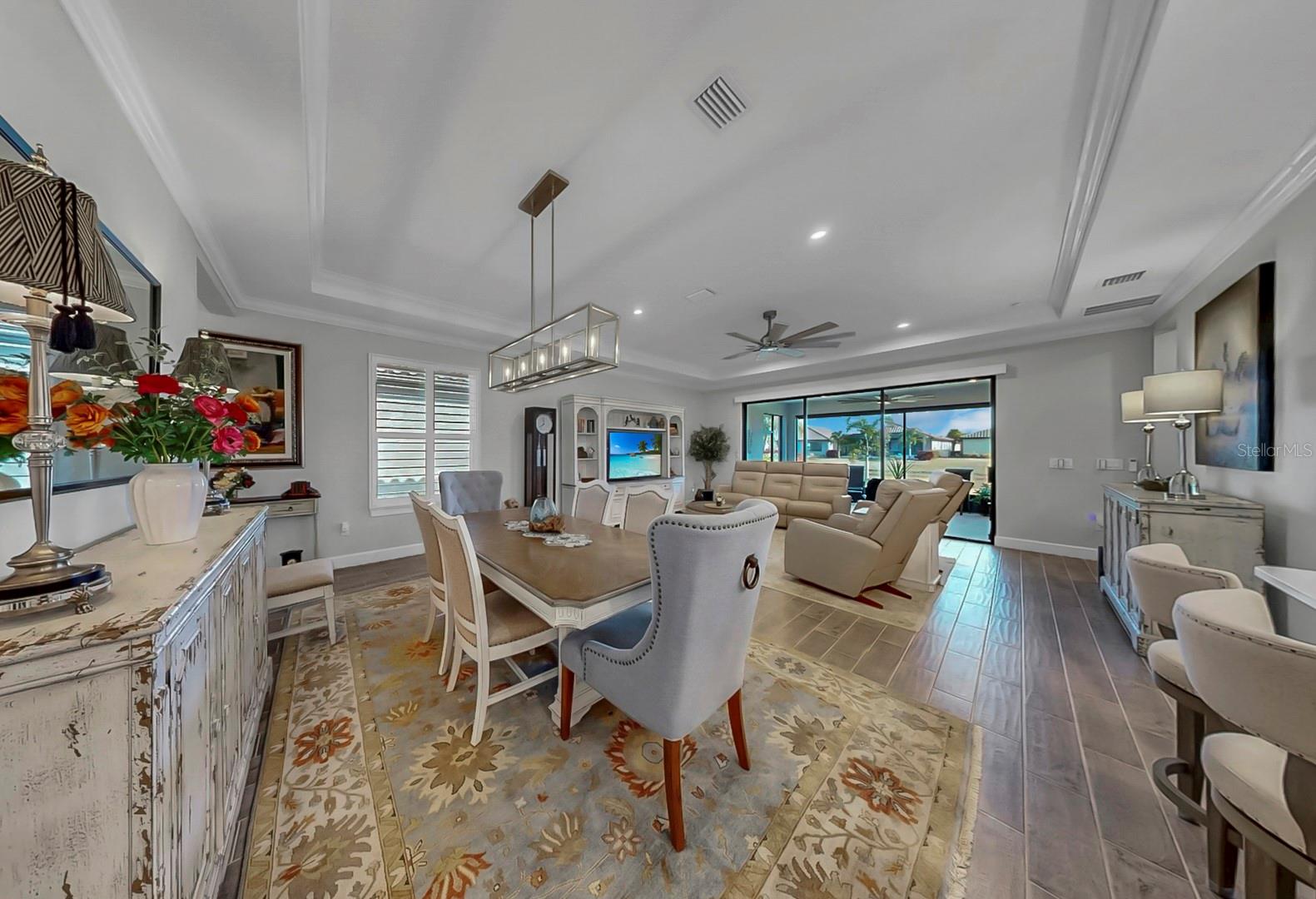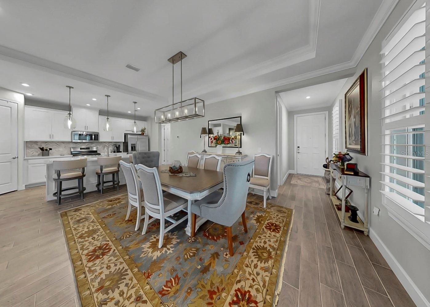 Enjoy resort style & maintenance free living in this beautifully updated Matera model, offering 3 bedrooms, 2.5 bathrooms, an open floor plan, and tranquil water views that set the tone for relaxed Florida living. From the moment you arrive, attention to detail is evident with upgraded landscaping and lighting, rain gutters, and a sealed paver driveway. A whole-home water softener and purification system adds comfort and convenience throughout the home. Inside, the space feels open, bright, and inviting. The kitchen, dining, and living areas flow seamlessly together, making this home ideal for everyday living and entertaining. Wood-look porcelain tile runs throughout the main living areas, creating a clean, cohesive aesthetic that is both stylish and easy to maintain. Crown molding, updated lighting, and ceiling fans provide a refined finish, while tray ceilings and 8' doors enhance the home's open, airy feel. Plantation shutters add timeless character, complemented by sun screens that provide privacy and help manage the Florida sun. The kitchen is thoughtfully designed with a herringbone tile backsplash, a functional island, a dedicated nook ideal for a coffee or beverage station, and a five-stage water filtration system at the sink. Custom pantry shelving enhances storage and organization. Nearby, the laundry room features additional cabinetry and a window that brings in natural light. The home offers a desirable split-bedroom layout, with the primary suite privately situated at the rear to take full advantage of peaceful water views. Two additional bedrooms are located at the front of the home, providing excellent separation for guests, family, or a home office. The primary suite serves as a relaxing retreat and features an ensuite bathroom with double vanities, a spacious walk-in shower with an upgraded rain shower head and frameless glass enclosure, and a custom walk-in closet with built-in storage. Step outside to the extended lanai overlooking the water, where it's easy to imagine enjoying this space year-round. The lanai is plumbed for an outdoor kitchen, includes a sink and ceiling fan, and offers ample room to add a pool. Remote-controlled sun shades allow you to comfortably enjoy the view--whether you're having morning coffee, entertaining, or unwinding at the end of the day. The extended garage with a 4-foot extension adds exceptional value, featuring an epoxy-coated floor, custom cabinetry, overhead storage, an organizer system, and a dedicated breaker ready for a home generator. Esplanade at Artisan Lakes offers unmatched resort-style amenities, including two clubhouse centers with beautifully designed social and activity spaces. Residents enjoy two resort-style pools, a resistance pool, two spas, a state-of-the-art fitness center, movement studio, and outdoor recreation such as tennis, pickleball, bocce ball, and cornhole. Additional highlights include a fire pit, multiple lounging areas, both small and large dog parks, and a playground. A full-time lifestyle manager curates events, clubs, and activities, creating a vibrant community atmosphere. Conveniently located near I-75 and I-275, this home provides easy access to Tampa, St. Petersburg, Bradenton, Sarasota, airports, dining, shopping, golf, and the award-winning Gulf Coast beaches. Beautifully maintained, thoughtfully upgraded, and located in one of the area's most desirable maintenance-free communities--this home is truly a must-see. *See attached video and 3D Tour*