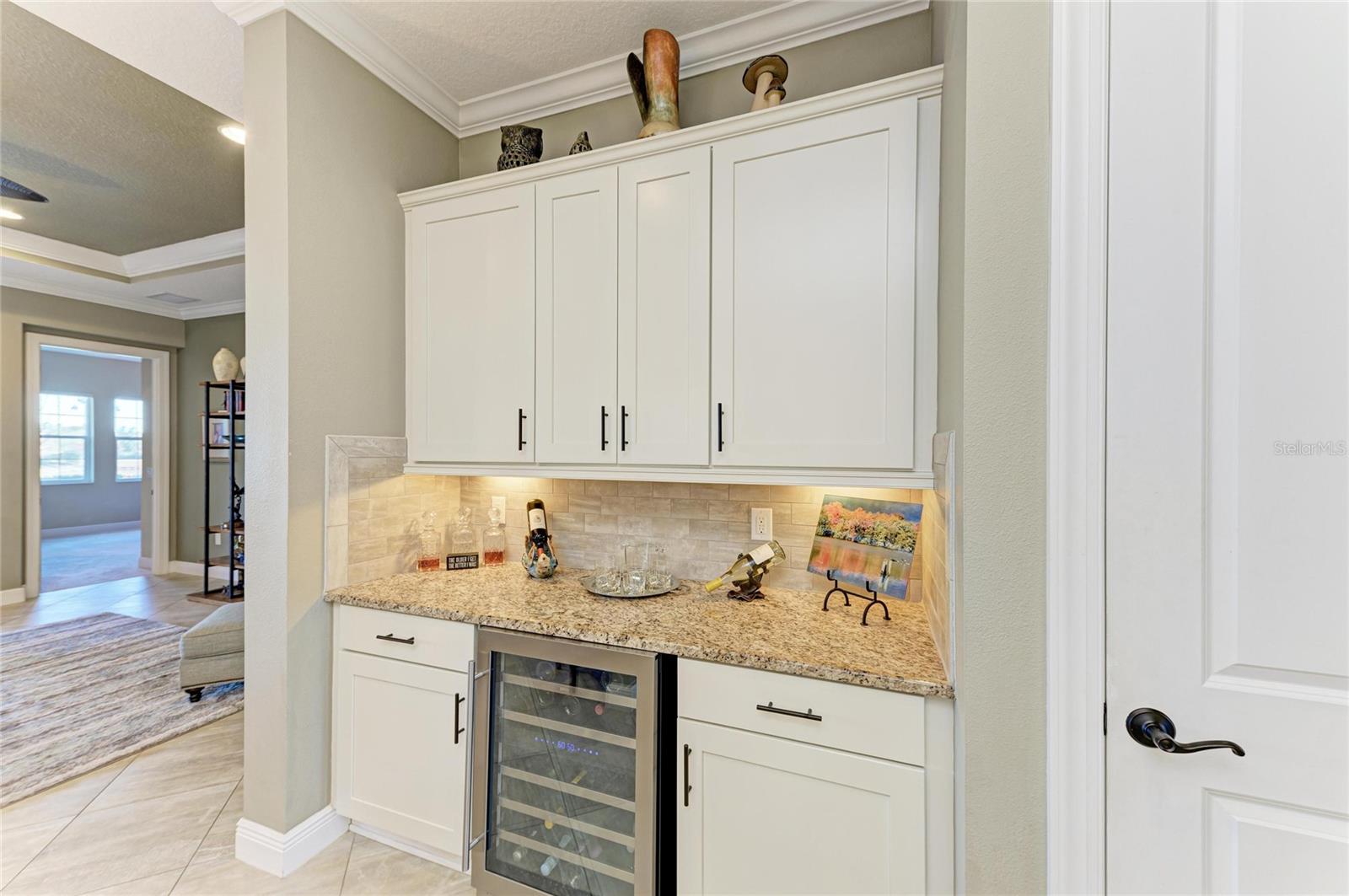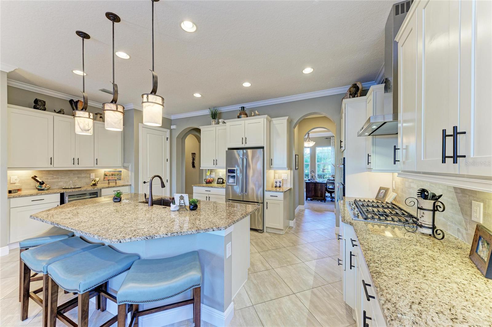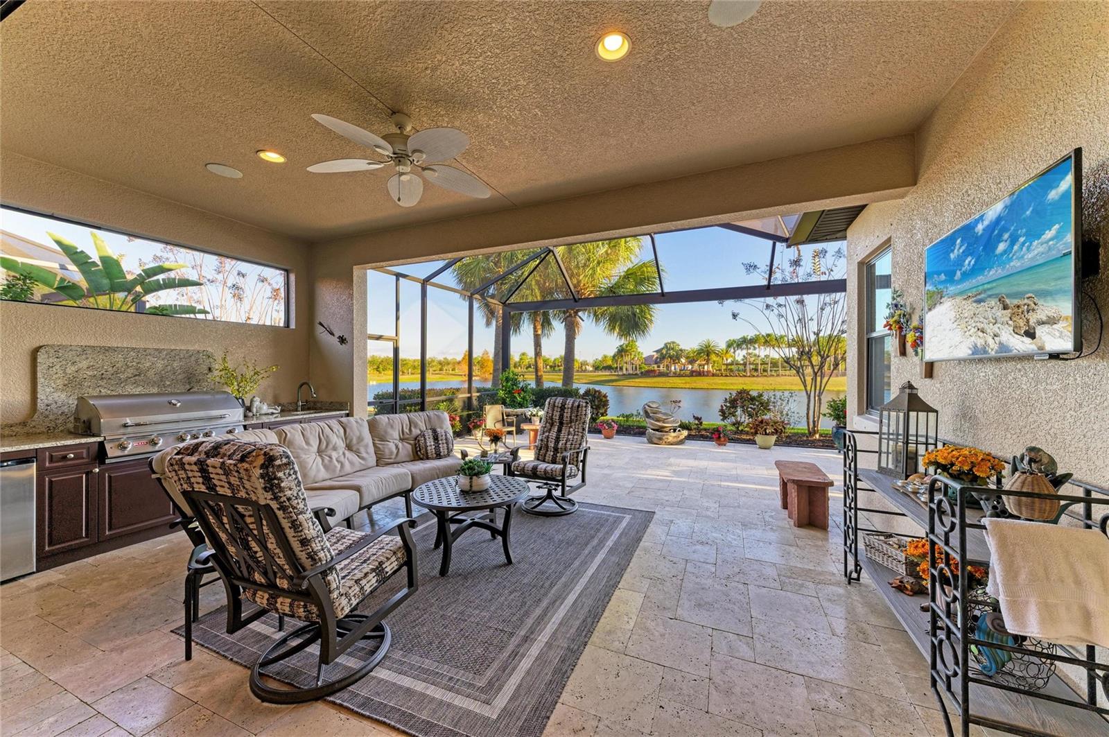 Designed for effortless living and entertaining, this beautifully upgraded residence is located in the gated Country Club East community of Lakewood Ranch. This popular WCI San Remo floorplan offers a thoughtfully designed blend of modern elegance and everyday comfort, featuring 3 bedrooms, 2.5 baths and a private office. From the moment you enter, the attention to detail is evident. 8-foot doors, 5 " base molding, 5 '' crown molding, high ceilings, upgraded designer lighting, and neutral tile laid on the diagonal create a bright, refined atmosphere throughout the home. The heart of the home is designed for seamless indoor-outdoor living and entertaining. A wall of sliding glass doors open to a spacious covered and extended travertine lanai with southeast exposure, offering comfortable temperatures, abundant natural light, and tranquil views through a clear-view screen. The fully equipped outdoor kitchen includes a grill with hood, refrigerator, sink, and outdoor polymer cabinets with pull-outs ideal for relaxed gatherings or evening dinners outdoors. Inside, a chef's kitchen impresses with KitchenAid stainless steel appliances, granite countertops, large center island, 42" solid-wood cabinetry with crown trim, soft-close drawers, under-cabinet lighting and a two zone wine refrigerator, all flowing effortlessly into the main living area. The primary suite serves as a private retreat, highlighted by a generous walk-in closet with custom built-ins and a beautifully appointed bath featuring dual vanities and an oversized glass-enclosed walk-in shower, creating a spa-like escape at the end of the day. A thoughtfully designed split-bedroom layout provides privacy for guests with two bedrooms and a full bath located in a separate area of the home. Additional upgrades include custom closet systems, recessed ceilings, a central vacuum system with kitchen toe-kick, sound-reducing insulation in the baths and laundry room, ceiling speakers in great room and lanai areas, dimmer lighting throughout, and outdoor holiday lighting outlets with a single interior switch. Residents of Country Club East enjoy exclusive access to two private amenity centers. The Retreat, featuring a resort-style pool, fitness center, and social gathering space and the Residents Club, offering an additional pool and volleyball court. Optional memberships are available at the Lakewood Ranch Golf & Country Club, proving 72 holes of championship golf, tennis, pickleball, dining and social activities. Ideally located, Country Club East offers convenient access to Waterside Place, Lakewood Ranch Main Street, UTC shopping and dining, world-class Gulf Coast beaches, and SRQ International Airport. This exceptional home delivers the perfect balance of luxury, comfort and Florida lifestyle, offering a relaxed yet refined way of living in Lakewood Ranch.