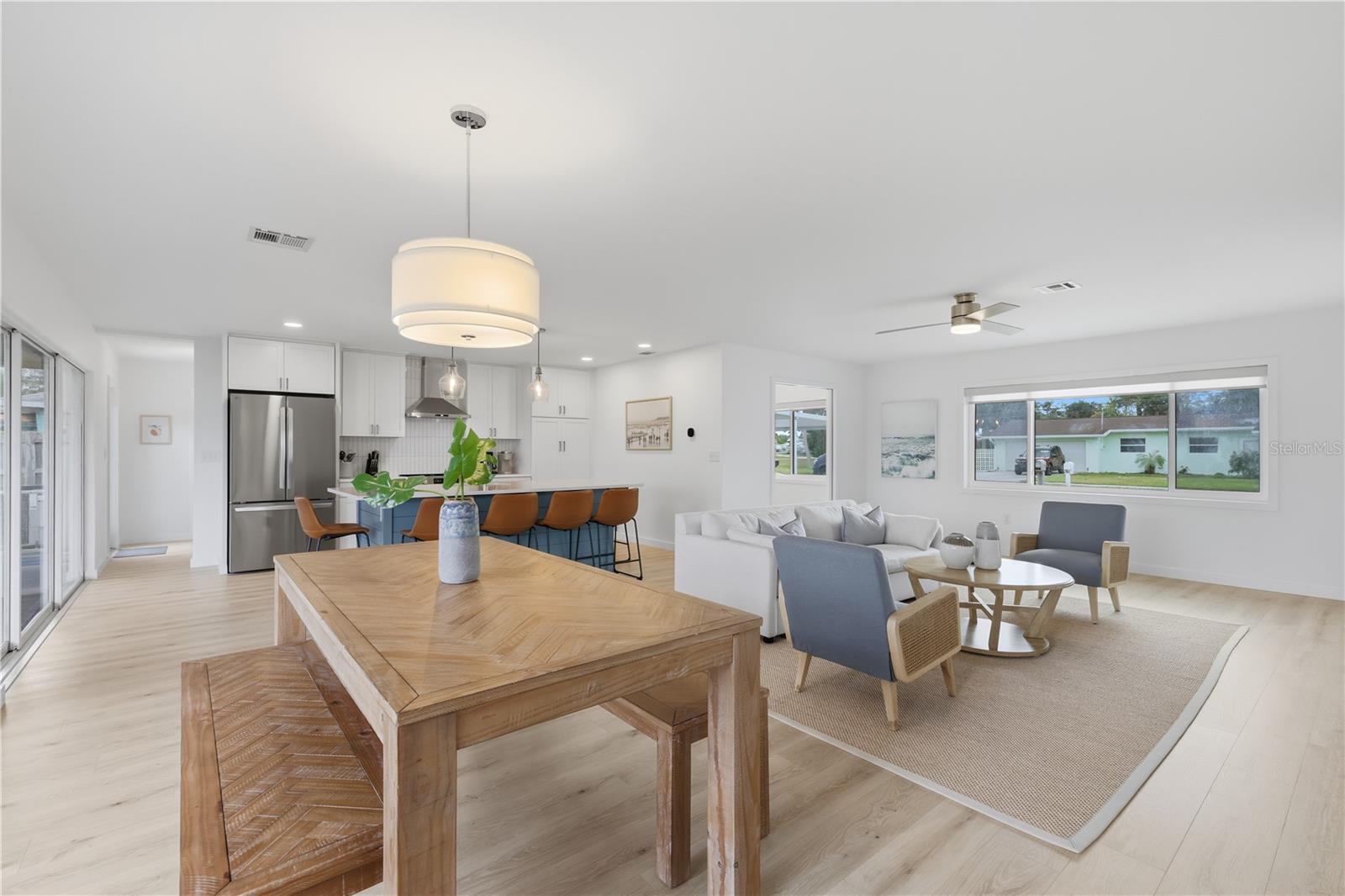 Welcome to this beautifully updated waterfront home in the desirable Dona Bay Shores community, featuring a full renovation completed in 2025 and set on nearly 0.21 acres along a saltwater canal. This boater's paradise offers direct access to Dona Bay and is just minutes from the Intracoastal Waterway, Snake Island, the North Jetty, and the sparkling Gulf coast. With no HOA or CDD fees, this three bedroom, two bathroom home offers over 1,900 square feet of thoughtfully updated living space designed for effortless Florida living. True peace of mind comes standard with a roof replacement in 2023, all new plumbing throughout including the sewer main, and hurricane impact windows and doors installed in 2022. Step inside to an open concept floorplan featuring brand new luxury vinyl plank flooring and a renovation where no expense was spared. The stunning kitchen is the heart of the home, showcasing quartz countertops, a large island with generous bar seating, stainless steel appliances including a vent hood, and a classic subway tile backsplash. The owner's suite offers double closets and a beautifully updated ensuite bathroom with dual sinks and a stand up shower finished with floor to ceiling tile. A split bedroom layout provides added privacy, complemented by an updated guest bathroom and the convenience of an indoor laundry room with washer and dryer included. Double sliding glass doors lead to a screened in lanai overlooking peaceful canal views, creating a seamless indoor to outdoor living experience. The backyard is ideal for entertaining, featuring a pergola, a firepit, and plenty of space to relax or gather with friends. A 2024 Trex private dock with a bench invites you to cast a line, launch a kayak, or simply enjoy the waterfront lifestyle. The home also offers ample room for RV, boat, or trailer parking, adding to its flexibility and appeal. Located in a quiet and peaceful Nokomis neighborhood, this home places you close to some of Southwest Florida's most loved destinations. Just steps away from the Legacy Trail, outdoor enthusiasts will appreciate this location where you can enjoy the powder white sands of Siesta Key, the shark tooth shores of Venice Beach, and local favorite, Nokomis Beach. Downtown Venice offers charming boutiques, dining, parks, and Paw Park, the area's only dog friendly beach, while vibrant downtown Sarasota with its renowned restaurants, gardens, and cultural attractions is just a short drive away. With major expenses already taken care of, beautiful updates throughout, and an unbeatable waterfront location, this move-in ready home is the one you've been waiting for. Schedule your private showing today and start living the coastal lifestyle you've been dreaming of.