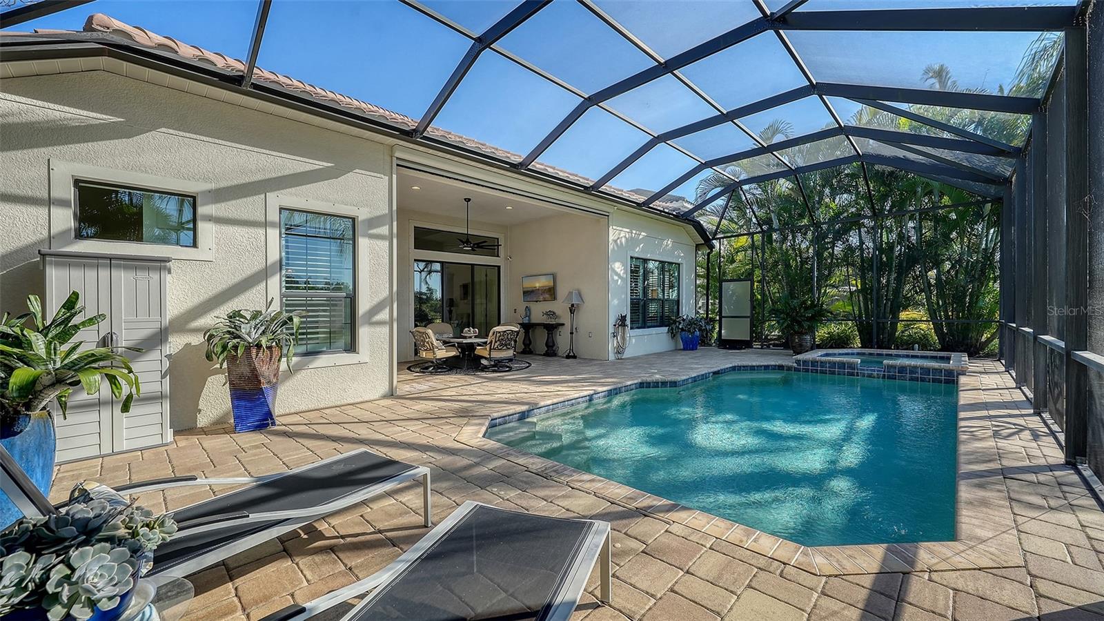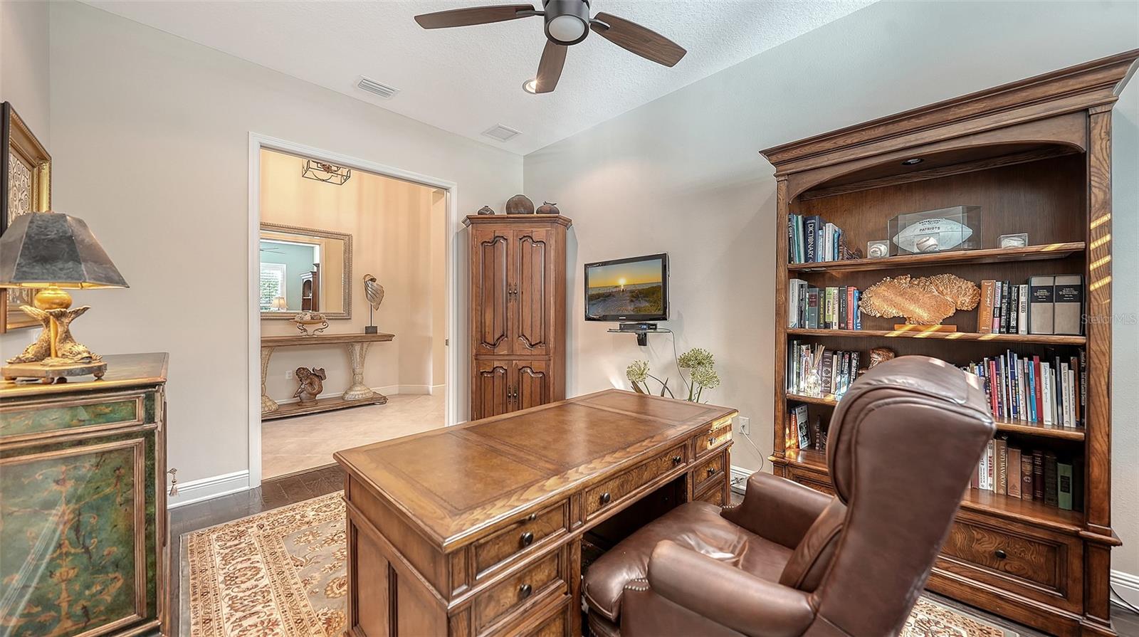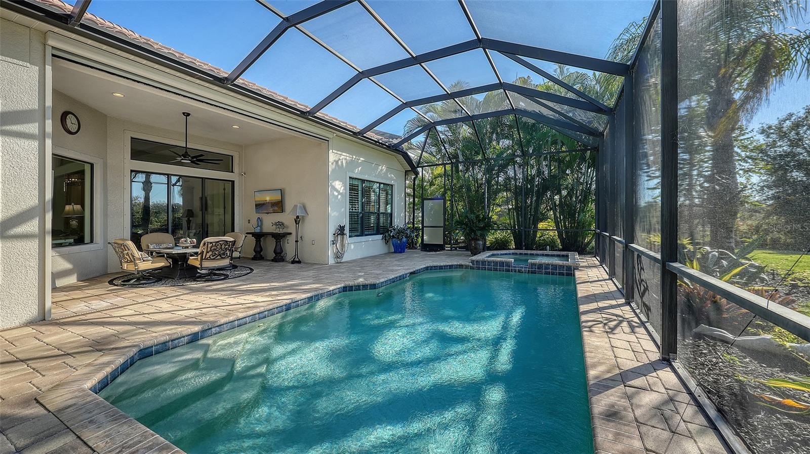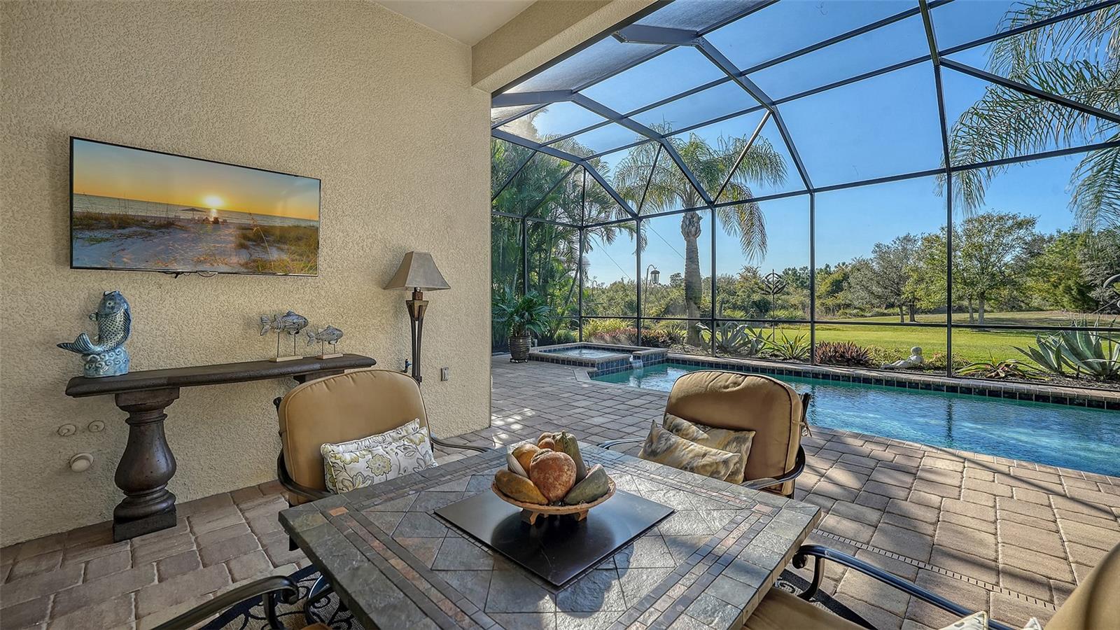 Privately positioned on an oversized homesite within the gated enclave of Country Club East, this beautifully appointed three-bedroom, 3.5-bath residence with a private office enjoys tranquil preserve views that create a serene, park-like backdrop for everyday living. The setting offers a rare sense of space and privacy while embracing the best of Florida's indoor-outdoor lifestyle.A welcoming entry through double front doors introduces a light-filled interior where a private office with double doors sits just off the foyer. The open great room is designed for both comfort and entertaining, highlighted by soaring ceilings, tray accents, and a sleek wet bar with stone countertop. Large sliding glass doors frame peaceful preserve views and lead seamlessly to the lanai beyond.The chef's kitchen is thoughtfully designed with rich wood cabinetry, stone countertops, stainless steel appliances, upgraded lighting, and a generous island with breakfast bar. A built-in desk tucked beside a picture window provides a charming workspace with views of the surrounding greenery, while the formal dining area with crown molding and designer lighting sets the stage for memorable gatherings.The primary suite is a true retreat, featuring luxury vinyl plank flooring, plantation shutters, a tray ceiling, and two walk-in closets. The spa-inspired bath offers split vanities, a beautifully tiled walk-in shower, and a private water closet. Two additional guest suites, each with its own bath, are positioned at the front of the home to ensure privacy for family and guests.Outdoor living takes center stage on the expansive lanai with a heated pool and spa, dedicated pool bath, and breathtaking sunset views over the preserve--ideal for relaxing or entertaining. Notable upgrades include a side-entry three -car garage, enhanced landscaping, a Culligan whole-house water system, sealed attic for energy efficiency, and more.Residents of Country Club East enjoy gated security, scenic walking trails, a fitness center, and multiple community pools, along with exclusive access to The Retreat and The Residents Club offering resort-style amenities, dining, and social spaces. Optional membership to Lakewood Ranch Golf & Country Club provides access to championship golf, tennis, pickleball, state-of-the-art fitness facilities, and multiple clubhouses.