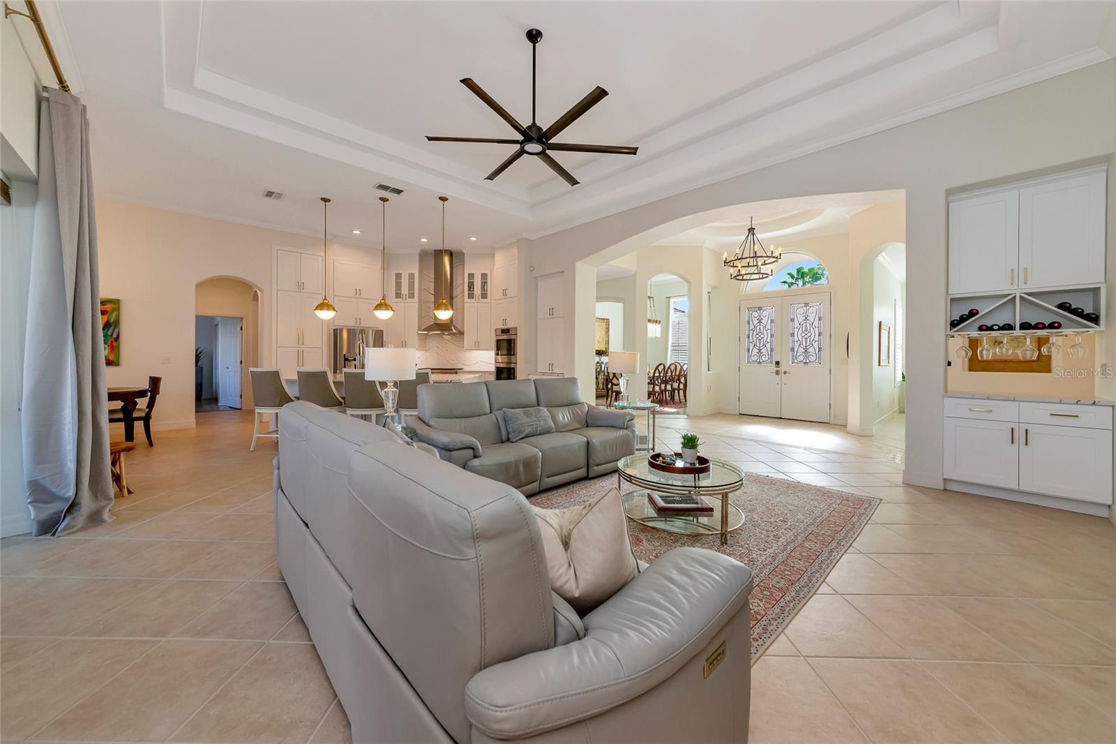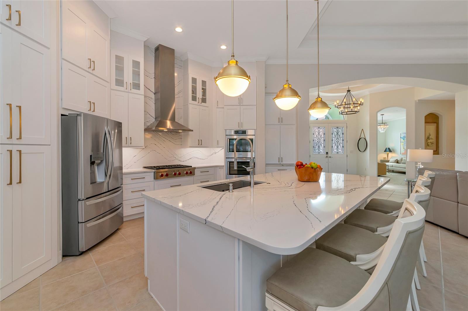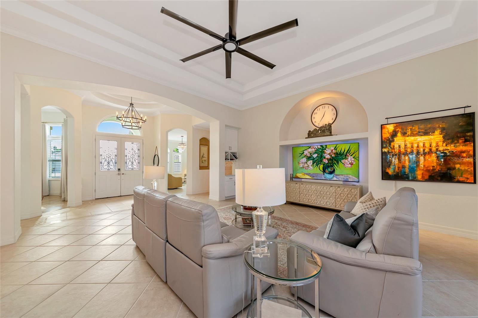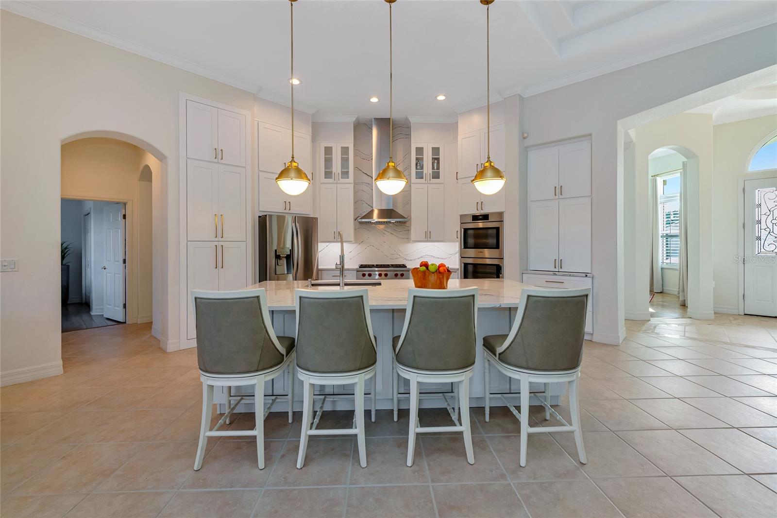 Commanding lakefront and golf course views define this beautifully updated executive residence in Waterlefe Golf & River Club, one of the region's most distinctive gated communities offering championship golf and direct access to the Manatee River. From the screened lanai, enjoy long water views across the lake to the 4th hole--close enough to appreciate the scenery, yet comfortably distant for privacy.This home is truly move-in ready, with major improvements already completed, including an updated kitchen and interior, new tile roof, whole-house generator, impact-rated front windows, and storm shutters for peace of mind. Inside, the great room makes an immediate impression with soaring 14-foot ceilings, abundant natural light, and an open layout designed for both everyday living and entertaining. The fully updated kitchen features Cambria quartz countertops, premium wood cabinetry, Bosch and Wolf stainless steel appliances, and natural gas cooking, opening seamlessly to the main living areas.The primary suite serves as a private retreat with wood flooring, a spacious walk-in closet with custom built-ins, and a spa-inspired bath complete with a glass-block walk-in shower, garden tub, and dual vanities. Two guest bedrooms, a den, a formal dining room, and a generous home office provide flexibility for guests, work, and multi-use living.Pocketing sliders open to a resurfaced salt water pool and spa, enclosed by a Clear-View pool cage, creating a seamless indoor-outdoor living experience ideal for year-round enjoyment.An often-overlooked luxury, the oversized three-car garage is freshly painted and offers abundant practical storage for vehicles, golf carts, water gear, and hobbies.Life in Waterlefe centers around an active, resident-focused community. Residents enjoy the River Club with resident-owned riverfront dining, a 24-hour state-of-the-art fitness center, kayak launch, playground, and scenic nature trails. HOA fees include cable and internet, adding everyday convenience.Golf and boating are available by choice, not requirement. The championship golf course offers flexible join or pay-to-play options, a newly completed clubhouse restaurant, and an Aqua driving range. For boating enthusiasts, the option to purchase a boat slip provides direct access to the Manatee River and the Gulf beyond.Here, mornings can begin on the golf course, afternoons on the water, and evenings dining with friends and family along the river--all within your own gated community.Be sure to explore the 3D virtual tour for a true sense of the home's space, flow, and setting.