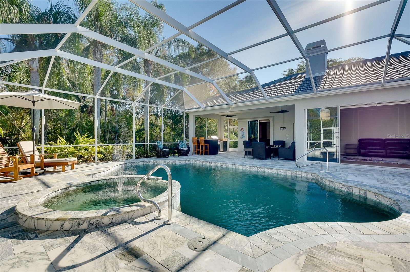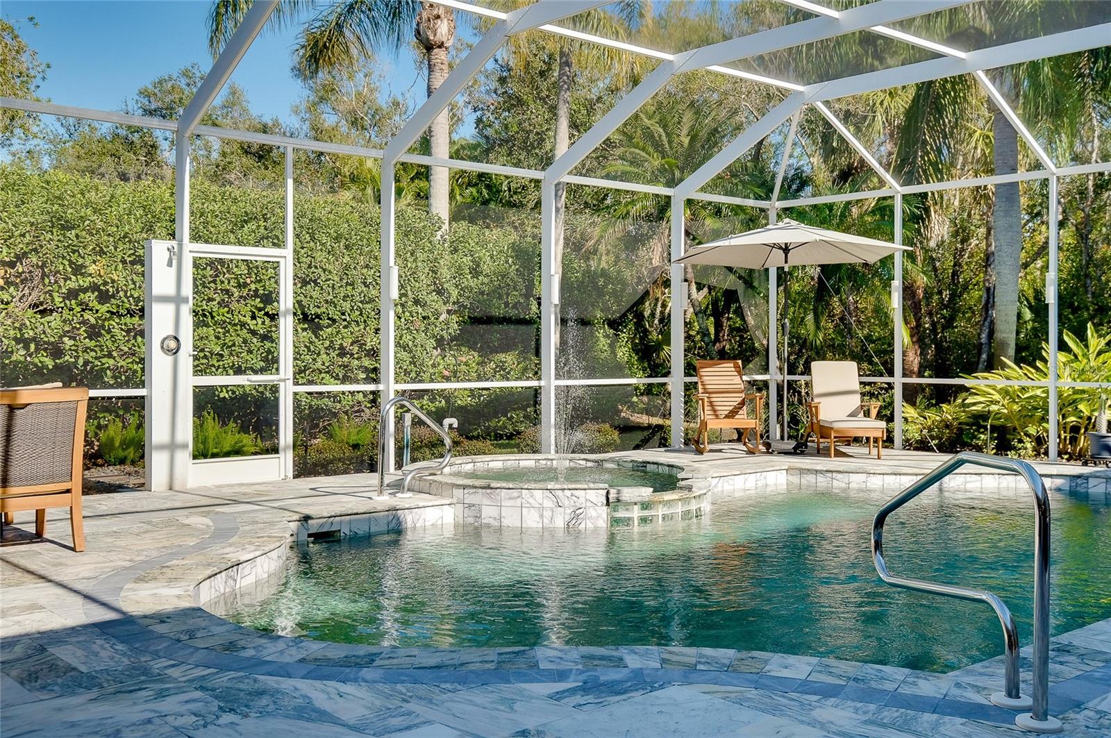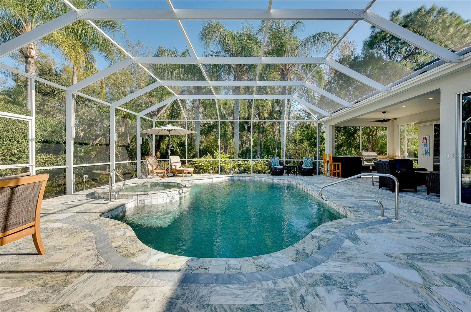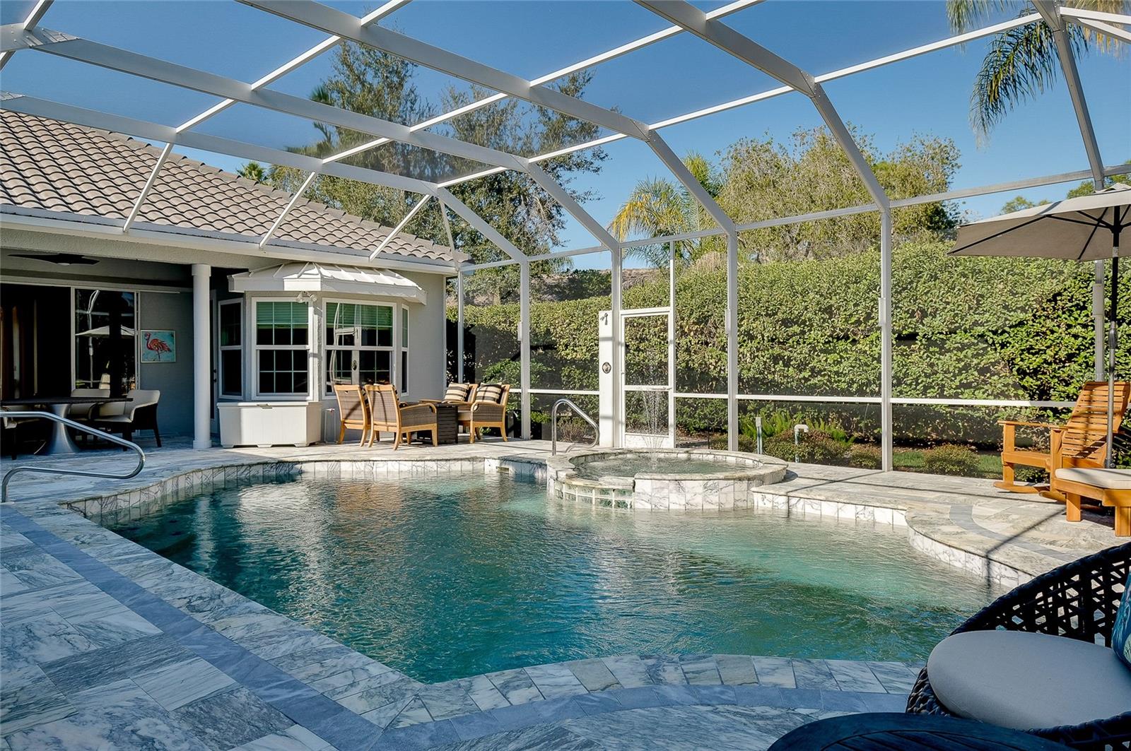 Exceptional Opportunity to discover this beautifully upgraded pool home located in the highly sought-after, gated Edgewater community of Lakewood Ranch. From the moment you arrive, the home delivers a true WOW factor, beginning with the impressive double entry featuring stunning iron doors added in 2023. Built by Todd Johnston, this residence offers a spacious split-bedroom floor plan with 3 bedrooms plus a den/office with custom built-ins, 3 bathrooms, and multiple living spaces including a formal living and dining area as well as a family room with an adjacent dinette. The home has been thoughtfully remodeled to complement its exceptionally private preserve-view lot, tucked away on a quiet one-way cul-de-sac. Designed for both comfort and entertaining, the main living areas feature newer luxury vinyl and tile flooring and flow seamlessly through fully pocketing sliding glass doors to the expansive outdoor living space. Enjoy cozy evenings by the gas fireplace, framed by quadruple sliding doors overlooking the impeccably landscaped backyard and serene preserve views. The gourmet kitchen is a chef's delight, showcasing granite countertops, rich wood cabinetry, and stainless steel appliances, including a Wolf gas range and double oven. The spacious primary suite offers a tranquil retreat with a bay window overlooking the preserve, two walk-in closets, dual vanities, a soaking tub, a separate shower, and a private water closet. The secondary bedrooms, additional bathrooms, and den are thoughtfully positioned on the opposite side of the home for privacy. Elegant plantation shutters are featured throughout the home, adding timeless style and functionality. The expansive outdoor living area serves as the true centerpiece of the home, thoughtfully designed to accommodate large gatherings of 25+ guests with ease and enhanced by recently added leathered marble flooring, lanai cage lighting, a fully equipped outdoor kitchen with granite countertops, gas grill and burner, sink, and refrigerator, along with an outdoor shower, large pool, and spa. One of the guest bathrooms conveniently serves as both an en-suite and a pool bath. Major upgrades have already been completed, including a new roof (2022), new A/C system (2022), new water heater (2025), pool heater (2024), and washer/dryer (2023), and all newer hurricane impact windows, offering peace of mind for years to come. First impressions truly matter, and this home delivers exceptional curb appeal. Recent exterior upgrades include a refreshed landscaping package, elegant driveway pavers, updated exterior (and interior) paint, and new gutters--all completed within the past couple years. This home is also high and dry, being built higher than others in the area. Edgewater Village boasts a prime Lakewood Ranch location near University Parkway and Waterside, with very low HOA dues that even include kayak AND canoe storage at Lake Uihlein--perfect for leisurely paddles to Lakewood Ranch Main Street. With easy access to world-famous Florida beaches, exceptional shopping and dining, and multiple major airports, this home offers the ultimate Florida lifestyle. Don't miss your opportunity to make this extraordinary property your private paradise.