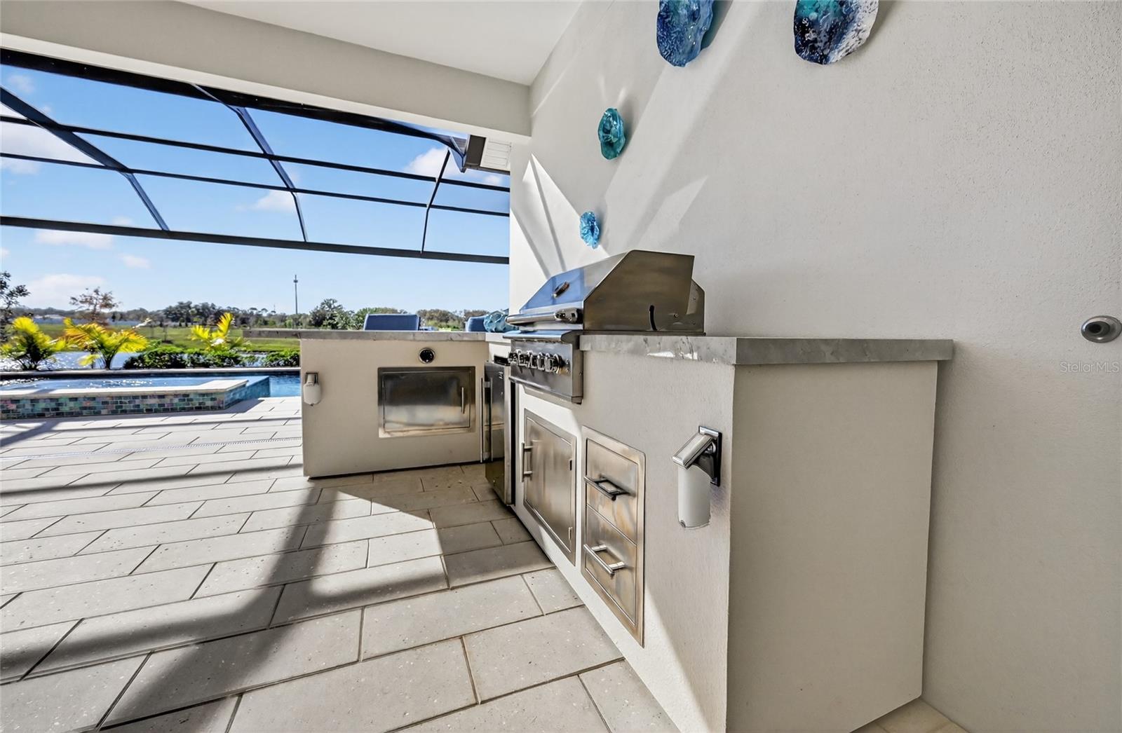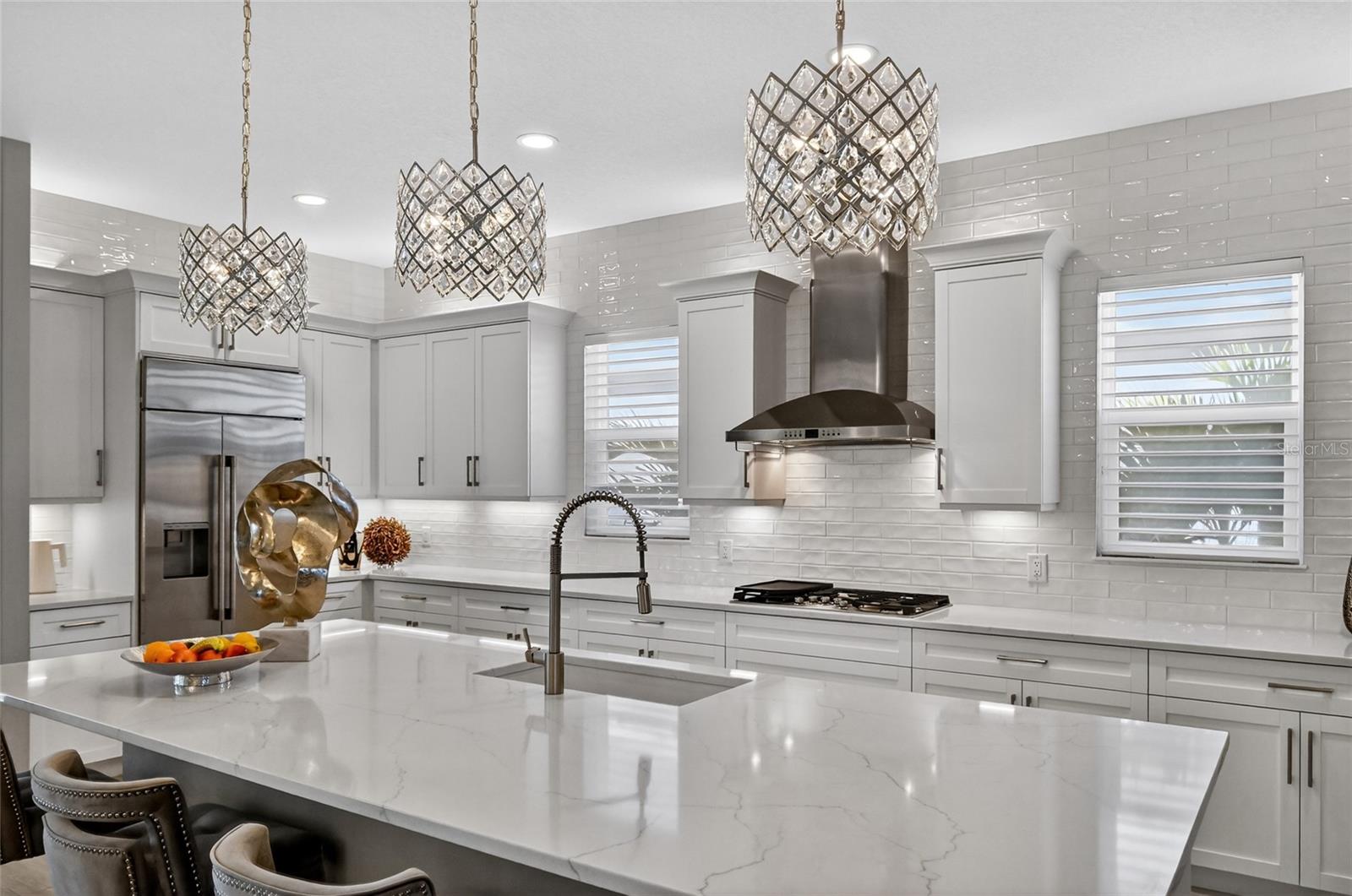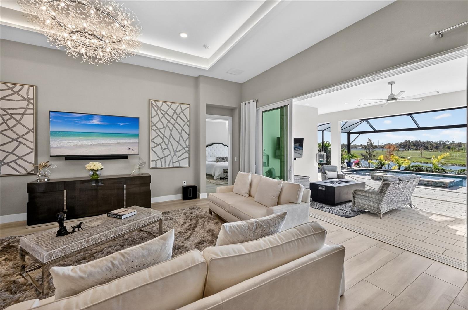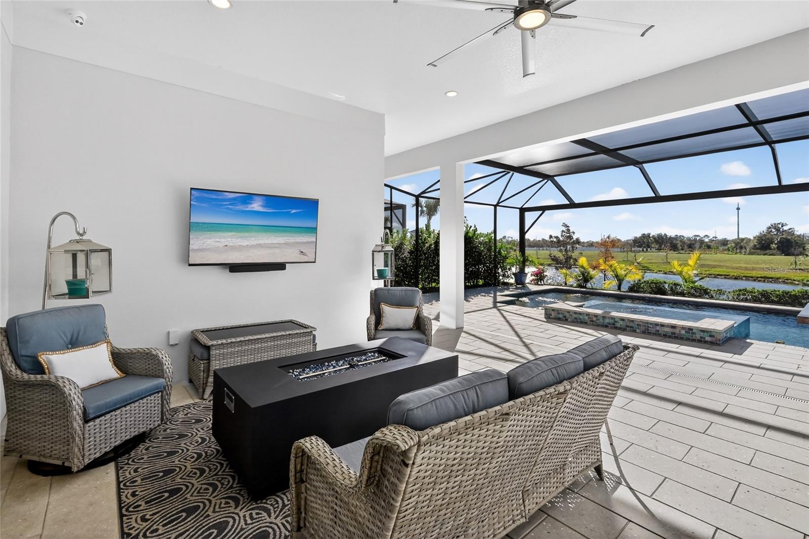Opportunity to bypass the build process and start living a life well deserved in one of Lakewood Ranch's newest communities from this beautifully appointed West Indies Islander plan built 2025 by Homes by Towne on a south-facing lake front setting in Shellstone at Waterside.The three bedroom plus study residence showcases 2,675 square feet of open one-story living, sumptuous wide wood-plank style porcelain tile throughout, voluminous tray ceilings with recessed accent lighting, IMPACT windows and doors, and a breathtaking outdoor living area with open and under cover space, shellstone pavered deck, newly added Summer kitchen and bar, PebbleTec heated saltwater pool/spa with sunshelf, and a panoramic clearview screen surrounded by premium landscaping and vistas. Seamlessly connecting this outdoor oasis to the oversized great room, kitchen and dining areas are impact glass doors revealing an optimal layout where guests and chefs alike will delight in the gourmet kitchen with GE Monogram appliances, sprawling counters, oversized island, dry bar with wine fridge, under cabinet lighting, a customized walk-in pantry, and stylish crisp white tile adorns the backsplash all the way up to the ceiling. Unwind in the elegant owner's retreat offering direct lanai access via sliding glass doors, oversized customized closet, and a refreshingly luxuriant bath with two vanity stations, invigorating shower and separate water closet. Family and guests will be right at home in this split bedroom floor plan with two additional guest suites each on separate wings of the home, both offering customized walk-in closets and wood plank porcelain tile flooring, with one boasting its own private ensuite full bath, the other is just off the homes third full bath. Additionally, the residence offers a study behind double glass entry doors, and wood plank tile flooring. Other highlights of this all-encompassing 3,987 square foot residence includes a large laundry room with cabinetry and sink, the recent addition of remote-controlled window shades, show-stopper light fixtures, customized closets throughout, camera surveillance, 8' interior doors, and an oversized three car garage with epoxy flooring and built-in storage cabinetry.Beckoning a lifestyle fulfilled with access to two resort-styled amenity centers, Shellstone residents will have private access to the soon-to-be completed Summit offering a social hall, fitness center, pool with cabanas, spa, firepit, poolside BBQ grills, and fitness lawn. Additionally, they can enjoy the recently completed hub at Midway Park that offers Shellstone and Wild Blue residents tennis, pickleball, basketball courts, kayak launch, walking trails, dog parks, playground, pro shop, and pavilions. Ideally located in Waterside, known for its vibrant Lakewood Ranch lifestyle surrounded by dining, shopping, polo, golf, community events, Waterside Place, Centerpointe, UTC Mall, and minutes to SRQ Airport and the beaches of Sarasota.