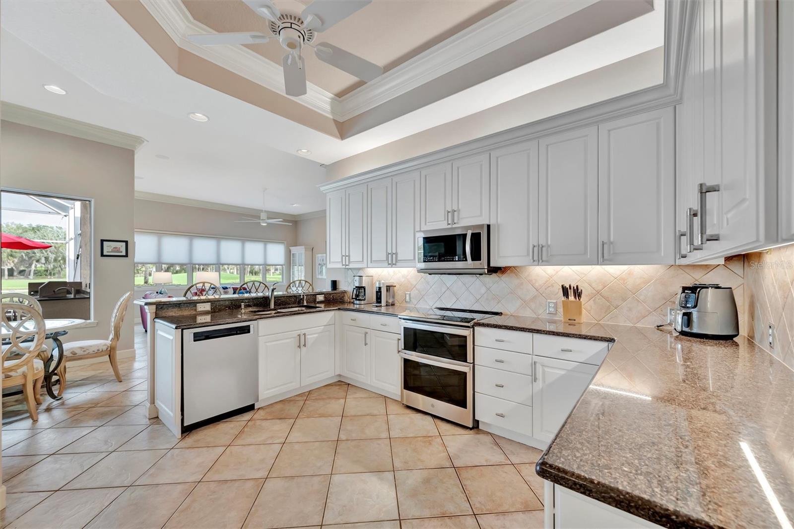 Exceptional golf course living with rare privacy in Rosedale Golf & Country Club. Ideally positioned on a highly desirable lot featuring a pond setback between the home and the golf course, this residence offers peaceful water and golf views with added space and privacy--an uncommon find in golf communities. The thoughtfully designed floor plan features separate living and family rooms, a formal dining area, and a distinct breakfast nook, providing comfortable, well-defined spaces ideal for entertaining or everyday living. Centered in the home is the spacious kitchen, highlighted by extended bar-height counter space and new stainless-steel appliances (2020-2021). The primary suite is privately situated on its own wing of the home, creating a true owner's retreat with direct sliding-door access to the pool and lanai, an oversized walk-in closet, and an en-suite bath featuring a separate soaking tub and walk-in shower. A second full bathroom is conveniently located adjacent to the guest bedroom, ensuring privacy and comfort for visitors. A flexible office/den can easily be converted into a third bedroom, offering versatility for guests or seasonal use. Outdoor living is a highlight, featuring a screened-in saltwater pool and spa, expansive paver lanai, tranquil pond and golf course backdrop, built-in gas grill, and additional shading from a motorized retractable awning for year-round enjoyment. The generous setback enhances privacy while preserving scenic views--perfect for quiet mornings or sunset gatherings. Front-yard curb appeal is enhanced by the circular driveway and pristine landscaping. Additional features and upgrades include an oversized 2+ car garage with room for a golf cart. The garage floor was upgraded with a textured epoxy coating (2025) and includes added shelving. Interior enhancements include crown molding throughout, plantation shutters, blackout window treatments in the primary bedroom, and upgraded lighting and fans. Extensive exterior and system updates include a newer roof (2017), high-efficiency zoned A/C systems (2018 & 2022), tankless water heater (2022), variable-speed pool pump and motor (2022), pool thermostat and heater (2019), Pebble-Tech pool resurfacing (2020), and a fully rescreened lanai with new weatherized screws--providing peace of mind for full-time or seasonal living. Rosedale Golf & Country Club is a guard-gated, low-density community known for its active social scene and exceptional amenities, including a 18-hole championship golf course, 22,000-square-foot clubhouse, full-service restaurant, fitness center with classes, heated junior Olympic pool, tennis and bocce courts, and a full calendar of social events. Optional golf memberships and no CDD fees add flexibility. HOA fees include cable, internet, two 24/7 manned gates, and dog parks. Conveniently located just minutes to I-75 and SR-70, offering easy access to UTC Mall, dining, medical facilities, SRQ Airport, and Gulf beaches--making this home ideal for families, snowbirds, retirees, or anyone seeking a private yet socially connected Florida lifestyle.