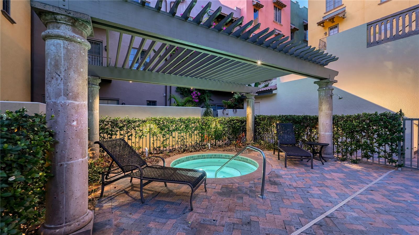 Located in the heart of Sarasota's iconic Burns Court, this three-bedroom, two-story residence at Burns Court Villas offers the privacy and comfort of a single-family home with the walkability and energy of downtown just outside your door. Spanning more than 1,900 square feet, the thoughtfully designed layout is enhanced by multiple outdoor living spaces--including the largest private courtyard in the community and three private bedroom balconies.A solid mahogany front door opens to refined interiors featuring travertine flooring, high ceilings, crown molding, and abundant natural light filtered through impact-rated windows and doors. The main level flows seamlessly from the living room--anchored by a gas fireplace and custom built-ins--to the formal dining area and sunlit family room overlooking the lush courtyard, creating an ideal setting for entertaining or everyday living.The gourmet kitchen, remodeled in 2023, is equipped with custom wood cabinetry with soft-close drawers and pull-out storage, under-cabinet lighting, and thick quartz countertops. The extended island offers room for dining in. Premium appliances include a Sub-Zero refrigerator, Viking gas range, hood and range, and Miele dishwasher. Upgraded LED lighting enhances both function and atmosphere throughout the home.Upstairs, Brazilian cherry engineered hardwood flooring leads to a serene primary suite with a private balcony, custom walk-in closet, and a fully renovated en-suite bath (2025) featuring dual vanities topped with quartz counters, a tile-and-glass walk-in shower with built-in bench seating, and a dedicated makeup area. Two additional guest suites--each with its own balcony--share a beautifully reimagined full bath with high-end finishes. A second-floor laundry room with storage cabinetry adds everyday convenience.Residents of Burns Court Villas enjoy a tranquil, gated setting with trellised stone walkways, a heated courtyard pool and spa, lounge area with outdoor fireplace, secure parking, and enhanced perimeter security with fob-access gates. As an added convenience, the Association also covers many utilities including management, ground maintenance, pest control, water, sewer, and waste collection.Perfectly positioned moments from Downtown Sarasota, this residence places you in an ideal walkable location to Sarasota's Cultural Coast. Enjoy the convenience of city living, near the Bayfront, Marina Jack, theaters, museums, galleries, farmers markets, and acclaimed dining along Main Street. St. Armands Circle, Lido Beach, and Sarasota's Gulf beaches are just minutes away, offering the ideal balance of cultural vibrancy and coastal living.A rare opportunity to enjoy refined city living within one of Sarasota's most distinctive downtown enclaves.