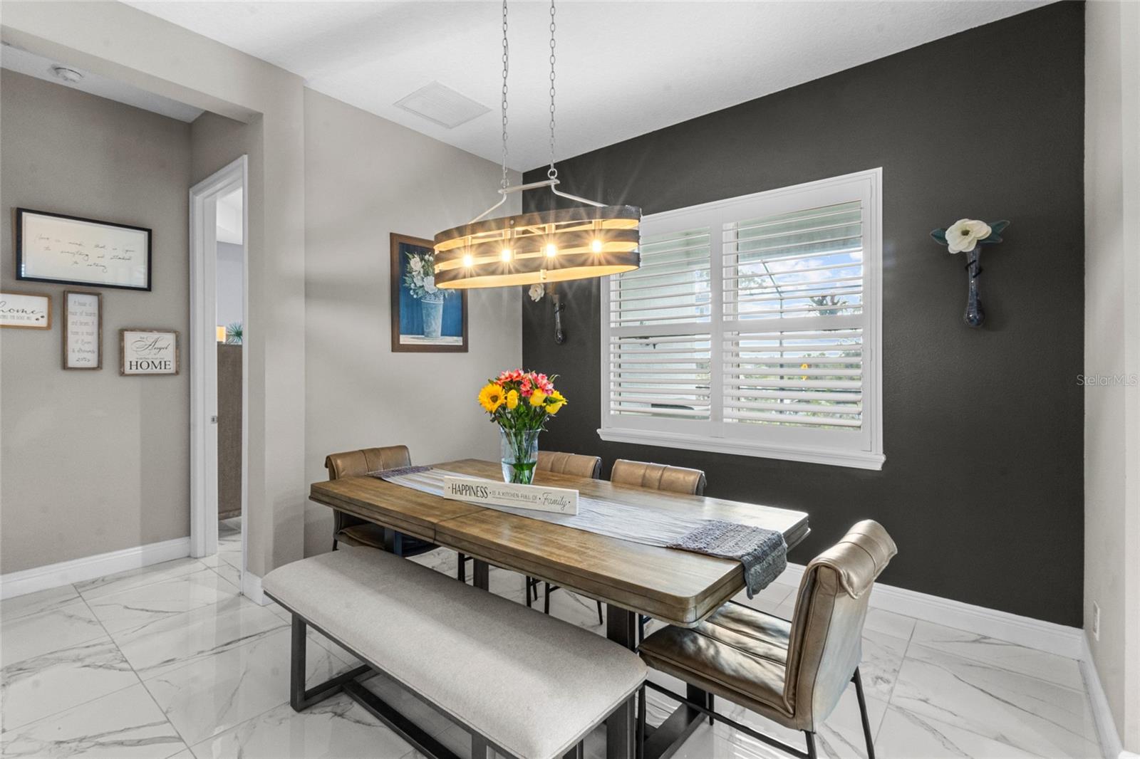 This is the kind of home that instantly feels like a deep exhale at the end of a long day. Built in 2021 by Neal Communities, this Bright Meadow floor plan blends modern design with relaxed Florida living, all set on an oversized lot with fresh front and rear landscaping and gorgeous sunset views behind the home. Thoughtfully upgraded and meticulously maintained, this home offers the ease of move-in-ready living -- with features that often take months (and significant cost) to add after new construction.Inside, you're greeted by light, space, and an effortless flow -- a large open-concept living, kitchen, and dining area designed for both everyday comfort and easy entertaining. Tray ceilings in the living room and primary bedroom add just the right touch of elegance without feeling formal. The kitchen is designed for both beauty and function, featuring quartz countertops, a large center island, gas cooking, an Italian marble backsplash, and a walk-in pantry that keeps the space clutter-free. Tile floors run throughout the home (no carpet), creating a clean, low-maintenance feel. Louvered shutters in the living room, dining room, and office/den add character and charm.The primary suite offers a peaceful escape with two walk-in closets and a spacious ensuite bath featuring dual sinks, a large walk-in shower, and a private water closet. The split bedroom layout includes two additional bedrooms, each with its own walk-in closet.Step outside and discover the centerpiece of this retreat -- a new 12x24 heated saltwater pool, complete with a sun shelf, lighted bubbler, fountain, and brand-new paver decking, all enclosed within a screened lanai. The newly added pitch apple bushes around the pool cage add to the beauty, creating an ideal setting for weekend lounging or sunset swims. Beyond the home, the community delivers a true resort lifestyle with a pool and spa, fitness center, clubhouse, pickleball courts, dog park, scenic walking trails, and an on-site lifestyle coordinator who keeps the calendar full -- from holiday decorating contests to food trucks every Thursday evening. Best of all, this home is located in a no-CDD community, offering long-term savings compared to many of the surrounding communities. This isn't just a house. It's where mornings start quietly, evenings end with stunning, color-filled sunset skies, and weekends feel like a vacation at home.