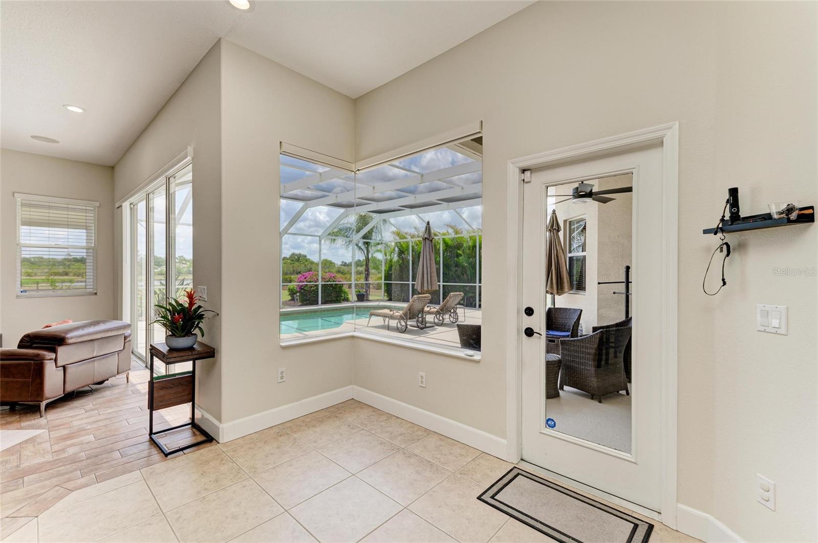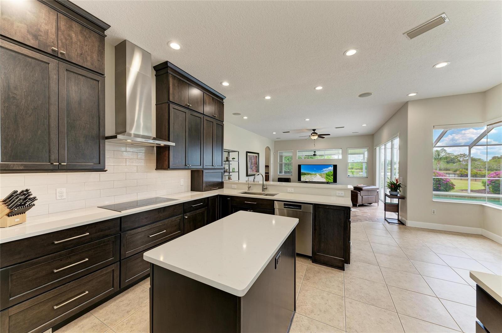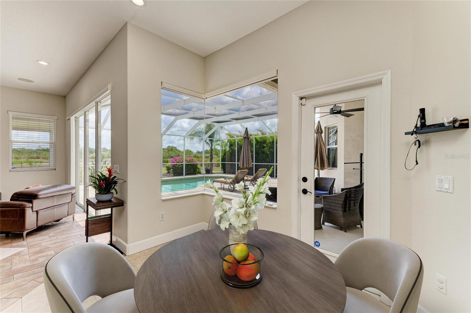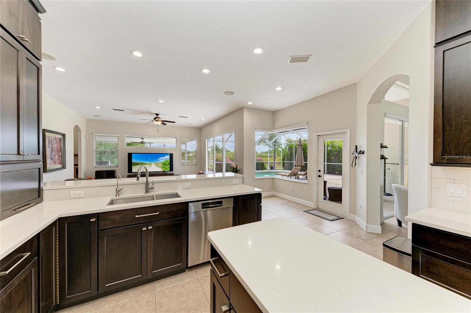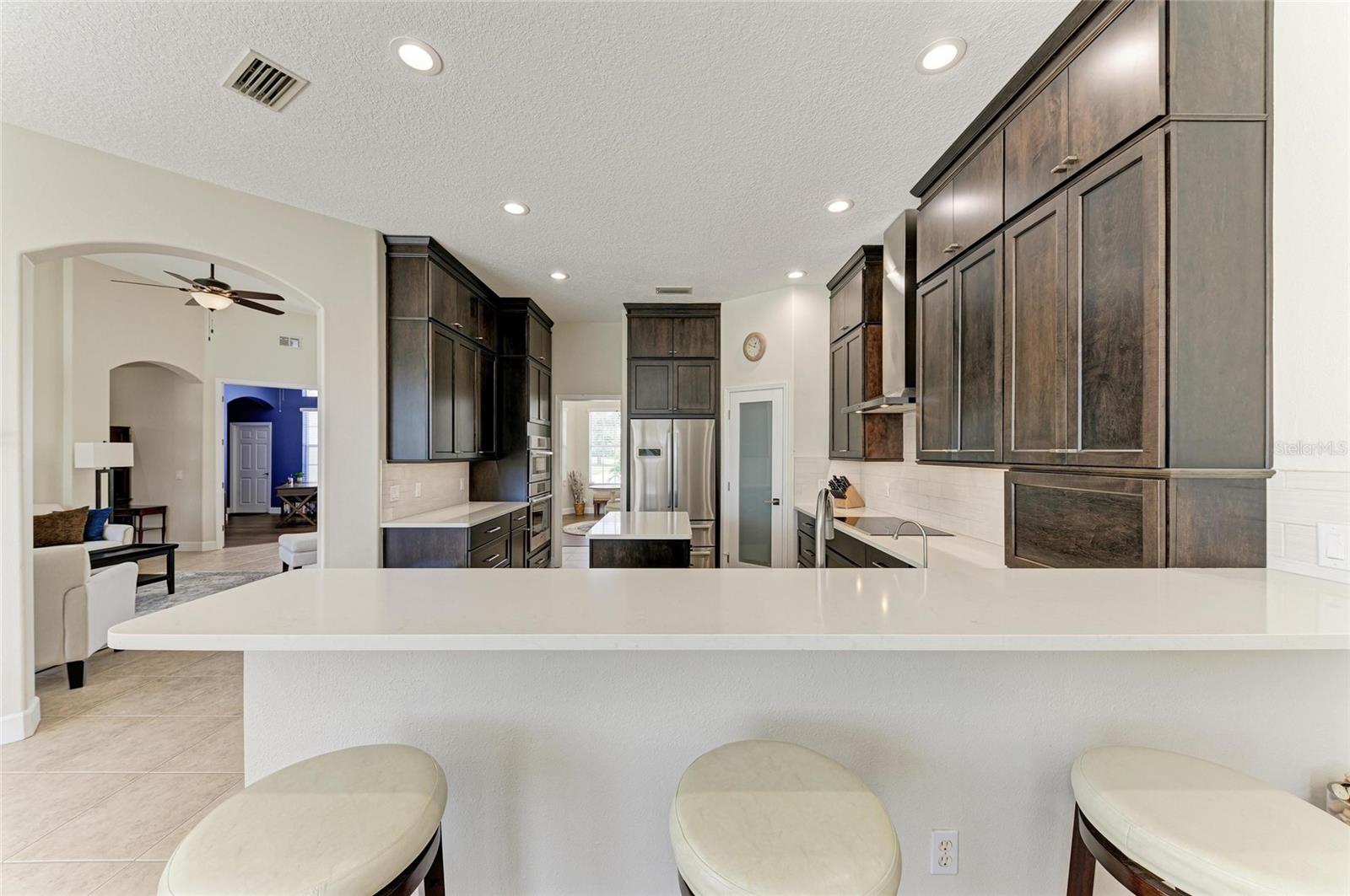 Welcome to your private resort-style retreat in the highly sought-after Preserve at Panther Ridge. This beautifully maintained home offers 4 bedrooms, 3.5 bathrooms, a private office, an upstairs bonus room, a 4-car garage, and two exterior parking pads, all situated on a scenic lot with preserve views on one side and a tranquil pond behind the home.Enter through elegant double glass doors into a bright and spacious interior with soaring ceilings and abundant natural light. The formal dining room features decorative columns and tray ceilings, while the living room showcases stunning views of the pool, fenced backyard, and pond, creating a perfect space for relaxing or entertaining.The remodeled kitchen is a chef's dream with quartz countertops, soft-close cabinets and drawers, extra storage, under-cabinet lighting, a custom vent hood, and premium Bosch appliances. Updated LED lighting throughout the home allows adjustable warm or cool tones, and built-in ceiling speakers provide music in the family and living areas along with surround sound for TV.The spacious primary suite overlooks the pool and backyard and features tray ceilings and a beautifully updated en-suite bathroom with quartz counters, custom cabinetry, designer tile, a jetted soaking tub, and a walk-in shower with a hidden seating nook. The split floor plan offers privacy from the additional bedrooms.Two bedrooms share a Jack-and-Jill bathroom with quartz countertops and high-end finishes, while a fourth bedroom with its own full bath is ideal for guests. A half bath conveniently serves visitors and pool guests, and the private office with large windows provides a perfect work-from-home space.Upstairs, the large bonus room with engineered hardwood floors offers incredible flexibility. Currently used as a game and sitting room, the pool table can stay, and the space could easily be converted into a 5th bedroom, media room, or second office.Step outside to your resort-style backyard oasis featuring a heated saltwater pool, full outdoor kitchen, expansive covered entertaining areas, and a large fenced backyard overlooking the pond. The preserve on one side adds additional privacy and a peaceful natural setting.Recent upgrades include: New roof with GAF 25-year warranty Pool cage screens (2021) Exterior paint (2023) Whole-house Kinetico water system Tankless water heater and reverse osmosis drinking water system LG washer and dryer on pedestals with mini washer Pool heater (2020) and pool pump (2023)The home has been meticulously maintained, with three HVAC systems serviced every six months, UV air purification, and separate NEST smart thermostats. Plumbing and electrical systems are also inspected annually as part of a service contract.Living in The Preserve at Panther Ridge offers an active lifestyle with scenic trails, parks, playgrounds, tennis courts, and basketball courts, while still being conveniently located near Waterside, Lakewood Ranch Main Street, and UTC Mall for premier shopping, dining, and entertainment.