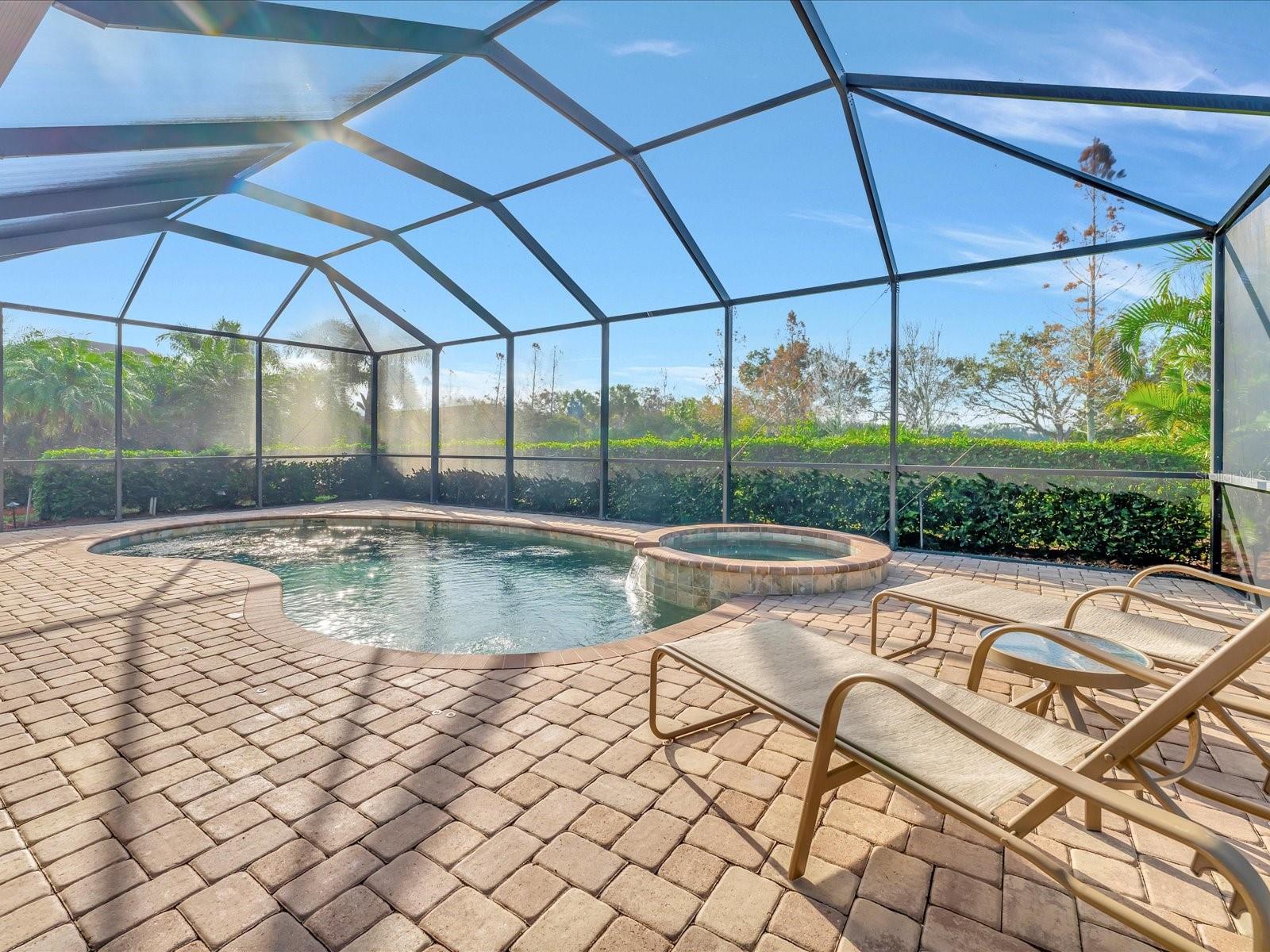 This stunning turnkey furnished home, a one-owner property in River Strand Golf and Country Club, has been meticulously maintained. As you enter through the enclosed front door, you'll be captivated by the view from the open living room, which flows out to the lanai overlooking heated pool. It offers the perfect retreat for relaxation and enjoyment, surrounded by beautifully landscaped grounds.The spacious open floor plan includes a large eat-in kitchen equipped with stainless steel appliances, providing ample space for entertaining family and friends. The primary bedroom is generously sized, featuring a large walk-in closet and an ensuite bathroom with dual sinks, a walk-in shower, and a separate garden tub. This maintenance-free community, located in the Sanctuary at River Strand, includes a social membership that grants access to all amenities. Golf is available on a pay-to-play basis, so no mandatory, monthly golf fees.The Sanctuary Community Center features a fitness center, a resort-style pool with a hot tub, and pickleball courts, 9 Har-Tru tennis courts, and 8 pickleball courts, all available to you with a social membership. The newly remodeled main clubhouse includes restaurant and bar, larger resort-style pool, resistance pool, a hot tub, and a Tiki Bar. River Strand is conveniently located near new restaurants and shopping along State Road 64 and is close to beaches and UTC Mall.