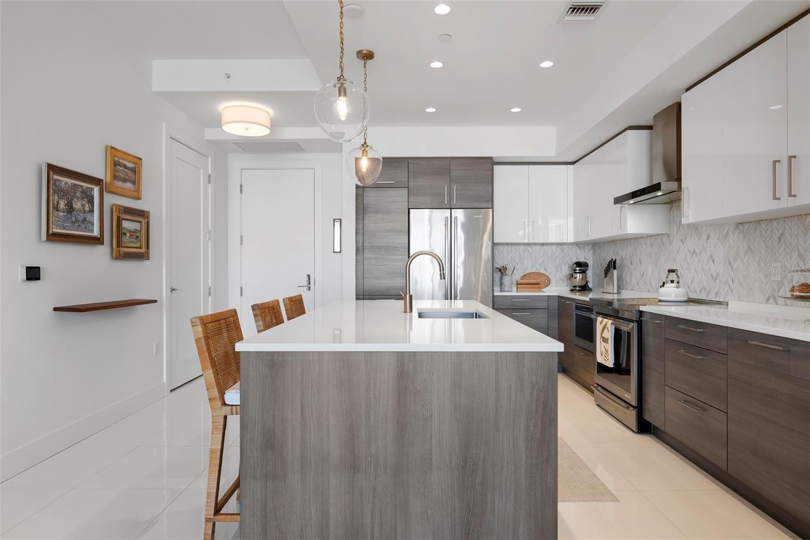 Exquisite, elegant, and serene living in the heart of splendid downtown Sarasota! Enjoy the morning on your balcony with your coffee in hand as you enjoy the bird's eye views, and evenings relishing the Gulf breezes. This gorgeous condo is impeccable with European cabinetry, quartz countertops, custom woodworking, porcelain tiles, refreshing, subtle color palette, California Closets, and more! The open, expansive floor plan boasts natural light galore inspiring a cheery, light-hearted ambiance. The split bedroom layout allows for privacy and generous breathing space when entertaining guests. The primary bedroom is spacious and delightfully opens to the balcony for fresh air, complete with a thoughtfully designed walk-in closet, and a pristine en suite bathroom with dual vanities. The airy guest bedroom and en suite are perfect for hosting family and friends. There is a den for work or hobbies, and a powder room for guests. Spend afternoons by the glorious 65-foot infinity pool with peek-a-boo views of the Gulf! Enjoy all of the splendid, convenient amenities that The Mark offers to compliment your lifestyle: fire pit lounge, cabanas, outdoor grills, fitness center, spin room, clubroom with catering kitchen, pool table, caf-style office space, 24-hour staffed reception, pet-friendly, security, an assigned parking space, and a separate secured storage unit. Saunter around downtown Sarasota, shop at the Saturday Farmers' Market, savor the authentic lemon tarts at C'est La Vie, attend the Sarasota Ballet or Orchestra, the lush gardens of Selby, and dozens of delightful restaurants and cafes! Enjoy sunny beach days at Lido Key and powdered sugar-soft beach walks. Evening strolls at the marina only a few blocks away, boutique shopping and street musicians at St. Armand's Circle, or pop out for a last-minute cocktail at sunset with friends. The Mark is the epitome of downtown easy, breezy, luxury living! Swoop now before this gem is gone!