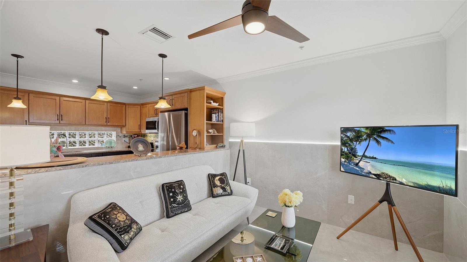Experience the best of island living in this beautifully renovated 2 bedroom, 2 bathroom villa on Longboat Key. Perfectly positioned on a coveted GULF TO BAY PROPERTY, this residence offers the rare combination of DEEP WATER MARINA access and a PRIVATE DEEDED BEACH, all in the heart of the island 4 mins from Bay Isles Publix shopping center and 14 mins to St. Armands Cir. Completely renovated in 2025, this turnkey FURNISHED villa showcases quality finishes throughout. The kitchen features brand new stainless steel appliances, granite countertops, new cabinetry, and modern fixtures, complemented by new paint, ceiling fans, solid interior doors, and updated hardware throughout the home. Both bathrooms have been fully updated with new vanities and finishes.Large scale porcelain tile flows seamlessly through the home and continues up the walls, installed over cement board rather than sheetrock and treated with Red Gard waterproofing for durability and peace of mind. HURRICANE IMPACT windows and exterior sliding doors provide added security and energy efficiency.The spacious primary suite offers a walk in closet with washer and dryer hookups. Two outdoor living spaces enhance the island lifestyle, including a peaceful rear terrace ideal for morning coffee and a generous front patio designed for entertaining. The front patio features electrically RETRACTABLE AWNINGS and LED lighting, with luxurious pavers leading directly to the deep water marina.Residents enjoy access to newer docks accommodating vessels up to 29 feet, available on a first come, first served basis with annual fees ranging from approximately $400 to $600. On site fish-cleaning station makes it easy to enjoy living on the water after a day of fishing. An additional assigned parking spot can be leased for $180/yr. The community also offers 250 feet of private deeded beach on the Gulf side, allowing for breathtaking sunrises and sunsets with frequent dolphin and manatee sightings.Amenities include a saltwater heated pool and a recreational clubhouse overlooking Sarasota Bay, known for its welcoming atmosphere with frequent gatherings, games, potlucks, and social events. Low association fees cover roof maintenance, pest control, pool, water, sewer, and grounds maintenance, with no pending assessments.Just a block away, the adjacent Bayfront Park offers pickleball and tennis courts, a playground, a public kayak launch, and additional recreational facilities.This is a 55+ community. No pets allowed. Two year ownership required prior to leasing.A rare opportunity to own a fully renovated, move in ready villa offering both boating and beach access on Longboat Key.