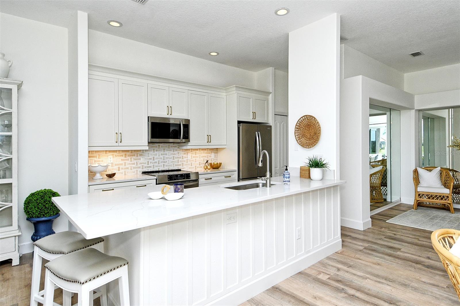 This is the property you have been looking for! This outstanding, completely updated "Dover" model paired villa in Heritage Oaks Golf & Country Club features 2 bedrooms, 2 full bathrooms, a den/study, an attached 2 car garage, and is being sold Turn-Key Furnished. The owner has spared no expense updating this lovely home into what it is today. Recently completed updates include: all new hurricane impact windows and doors throughout, gorgeous light oak luxury vinyl plank flooring and tall baseboards throughout, a completely updated kitchen with new cabinets, quartz countertops, tile backsplash and stainless steel appliances. In addition, a brand new A/C was installed (2025), along with a brand new water heater (2025), beautifully updated bathrooms with new counter tops, mirrors, and decorative flooring, and the interior has recently been completely repainted. As soon as you step through the front door, you're greeted with a ton of natural light making this wonderful home feel bright and open. The entire home has been professionally outfitted with designer furniture and details that will surely appeal to even the most discerning person. The primary suite is a truly relaxing oasis. With more than enough room and direct access to the rear lanai, this space also includes an updated bathroom complete with dual sinks, a large soaking tub, sizable stand up shower, and a large walk-in closet. The open kitchen provides open sight lines to the living room and outdoor spaces making entertaining friends and family easy and enjoyable. Make your way onto the private oversized rear lanai and take in the panoramic views of water and the 7th hole of the golf course. The lanai cage and screen enclosure was recently updated and replaced to meet the most recent hurricane code. This immaculate home has been pristinely cared for by its owner and it shows! Simply bring your clothes and enjoy all things Heritage Oaks on day 1! Heritage Oaks is known for its pristine 18-hole golf course, har-tru tennis courts, fitness center, 24-hour security, an impressive recently renovated clubhouse with 2 restaurants including the sensational 19th Hole Lounge, 5 heated swimming pools, and a calendar of events packed with activities. Schedule your private tour today, it won't last long!