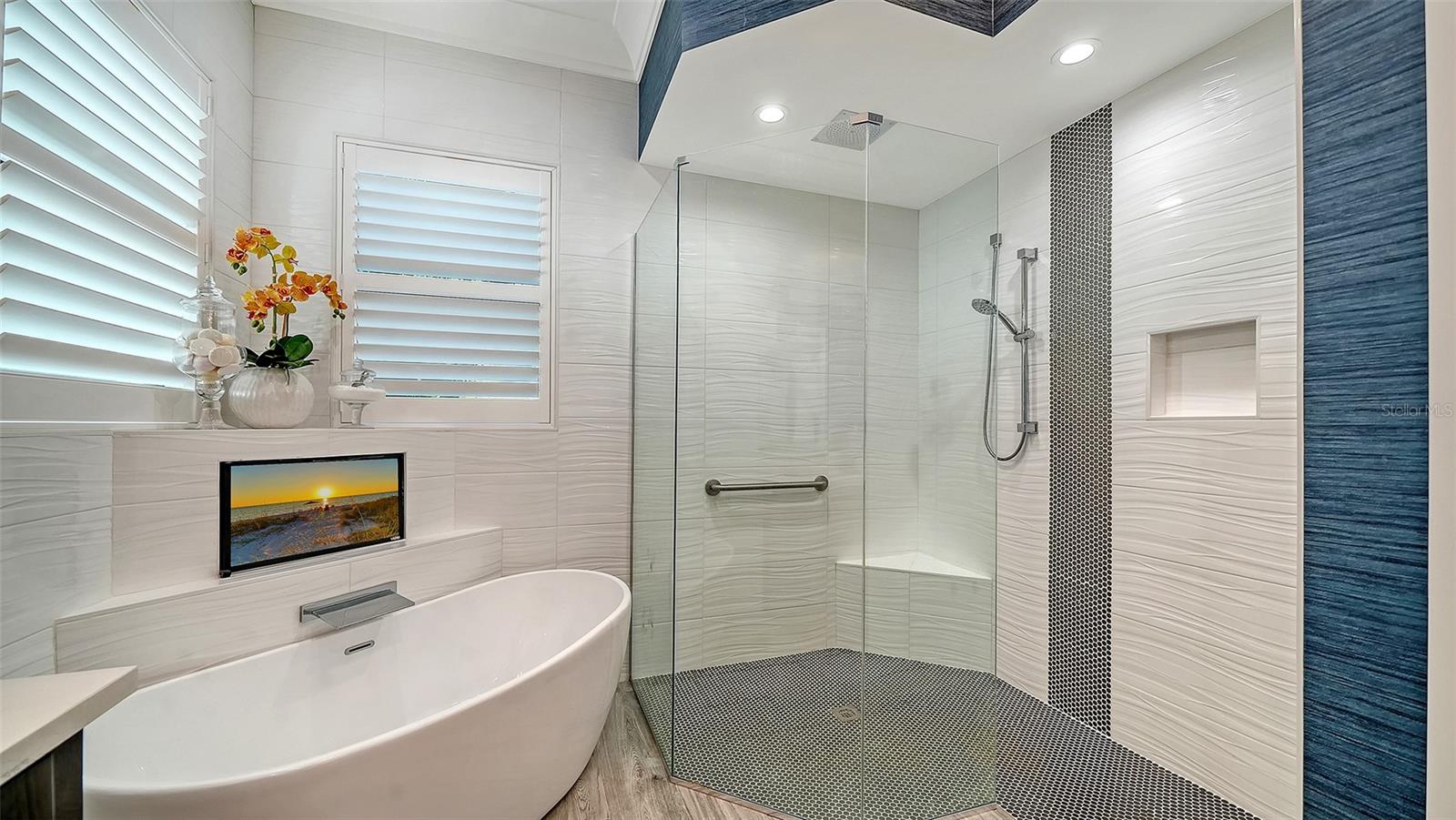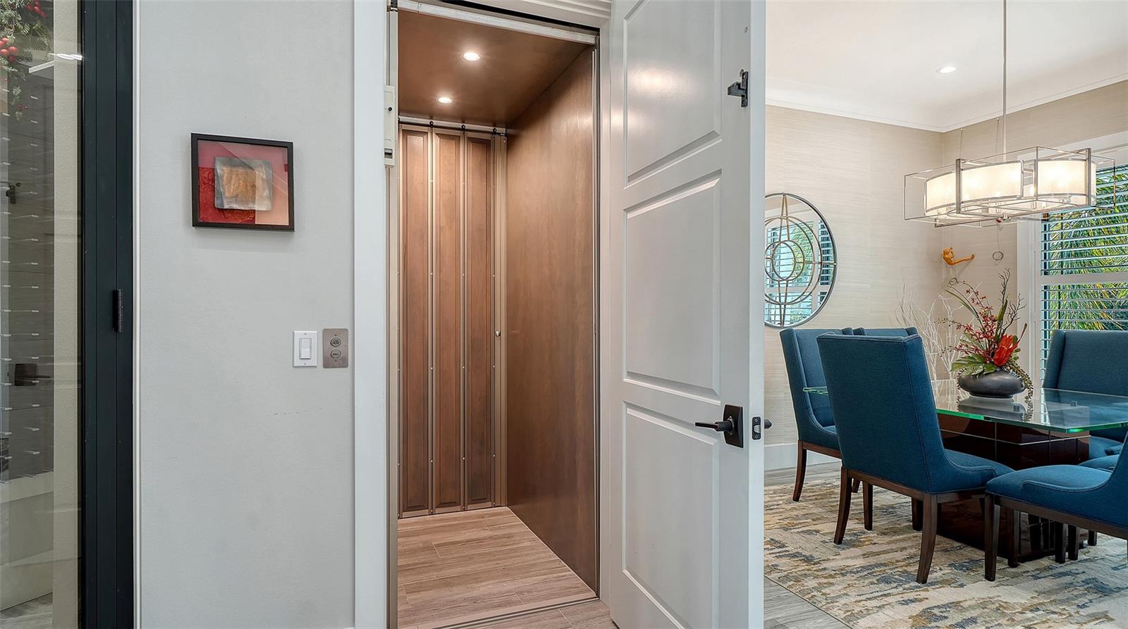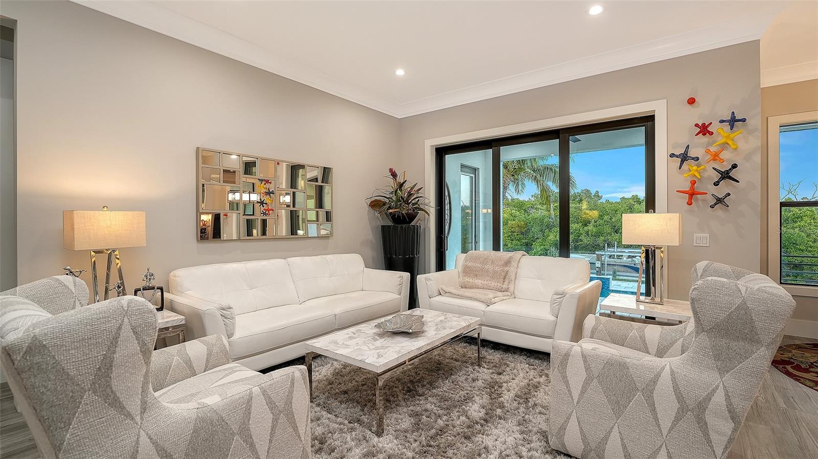 An extraordinary statement of modern coastal elegance, this custom waterfront residence built in 2018 is a masterclass in refined living, where architectural detail, craftsmanship, and setting converge in the coveted enclave of Siesta Cove. Framed by sweeping water views and constructed with hurricane-rated windows and doors, the residence offers both elevated design and enduring peace of mind. Spanning five bedrooms and six full bathrooms, the home is thoughtfully curated for effortless luxury. The primary en-suite retreat on the main level provides a private sanctuary, while light-filled interiors and tranquil water vistas create a seamless connection to the outdoors from nearly every room. The great room commands attention with intricate ceiling artistry, custom built-in shelving, and a sleek electric fireplace--an inviting yet dramatic centerpiece for both intimate evenings and grand entertaining. A temperature-controlled walk-in wine cellar and elegant wet bar elevate the experience further. At the heart of the home, the kitchen is a vision of light and sophistication, featuring new designer Cambria countertops (Wolf & Subzero appliances) including double ovens, built-in refrigerated drawer and a built-in freezer drawer, a generous walk-in pantry, and a welcoming eat-in layout complemented by an adjacent breakfast bar. Plantation shutters and discreet electric blinds throughout the home enhance the ambiance with effortless control of light and privacy. A richly appointed den or office behind French doors offers quiet refinement, while a sweeping staircase ascends to an upper level designed for both comfort and indulgence. Here, a spacious bonus room opens to a private screened balcony, ideal for sunrise reflections or sunset cocktails. Four additional bedrooms include three luxurious en-suite accommodations and a fourth with a dedicated full bath just beyond. One suite is distinguished by its own wet bar with refrigeration for morning coffee or evening refreshment, along with custom built-in closet drawers--an unexpected touch of indulgence. The outdoor living experience is nothing short of resort-caliber. A sparkling pool and spa, enhanced by a new electric pool heater, are complemented by an outdoor shower, built-in grill, and beverage cooler--creating a private oasis for entertaining under the stars. Boaters will appreciate the 39-foot private dock with water, electric, and lift, just moments (only 3 properties away) from the Intracoastal Waterway. Additional features include an elevator servicing all levels from the oversized three-car garage, abundant storage, a fully fenced yard, and lush, mature landscaping that envelops the property in privacy and beauty. Perfectly positioned near world-class beaches, upscale shopping, and fine dining, this exceptional Siesta Cove residence is more than a home--it is a lifestyle defined by grace, comfort, and uncompromising waterfront luxury.