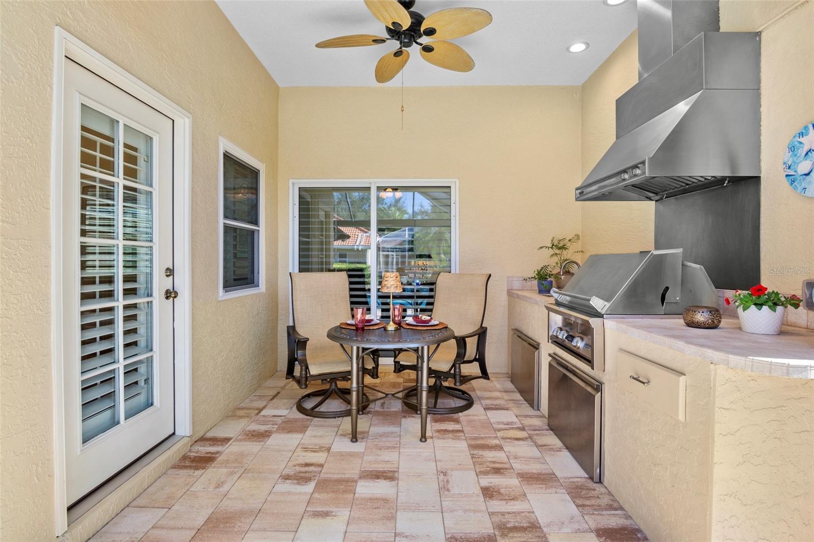Exterior: Lighting, Outdoor Grill, Outdoor Kitchen, Sidewalk, Sliding Doors